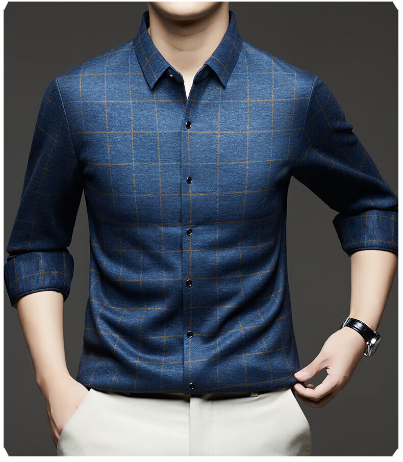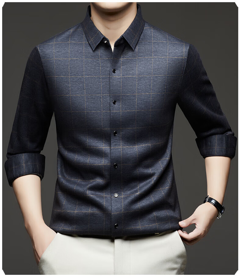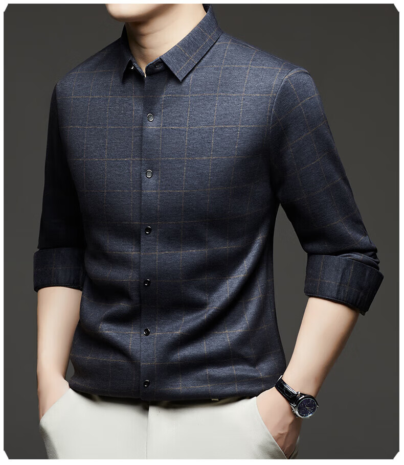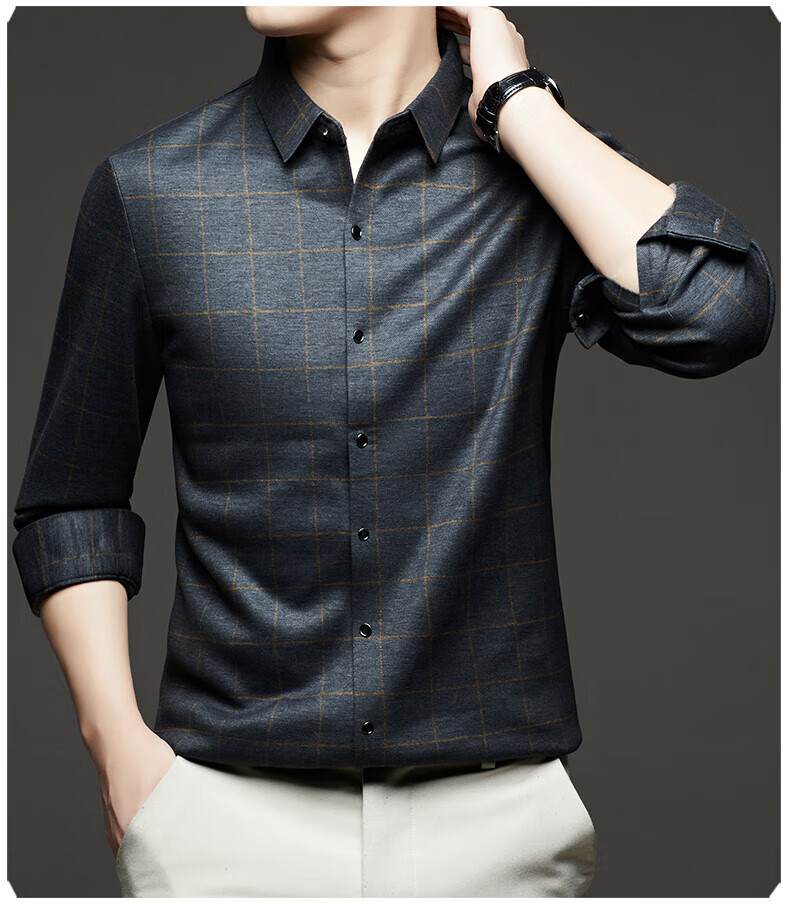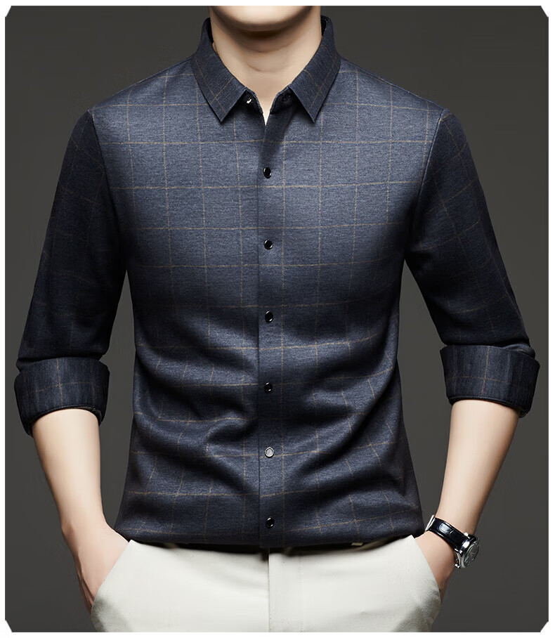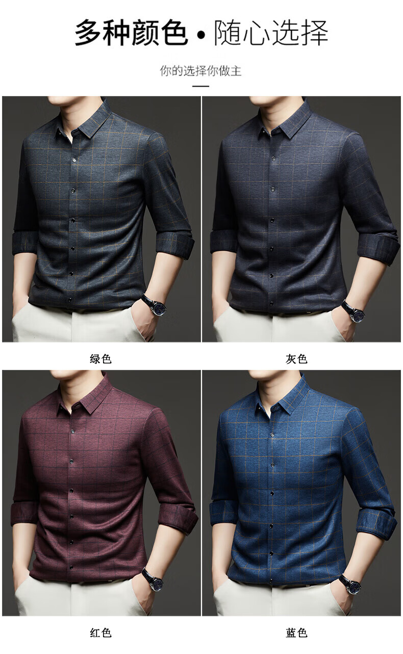加绒桑蚕丝羊毛衬衫男士秋冬商务休闲格子衬衣中年爸爸装保暖衬衫 DL628绿色 2XL 建议160-175斤