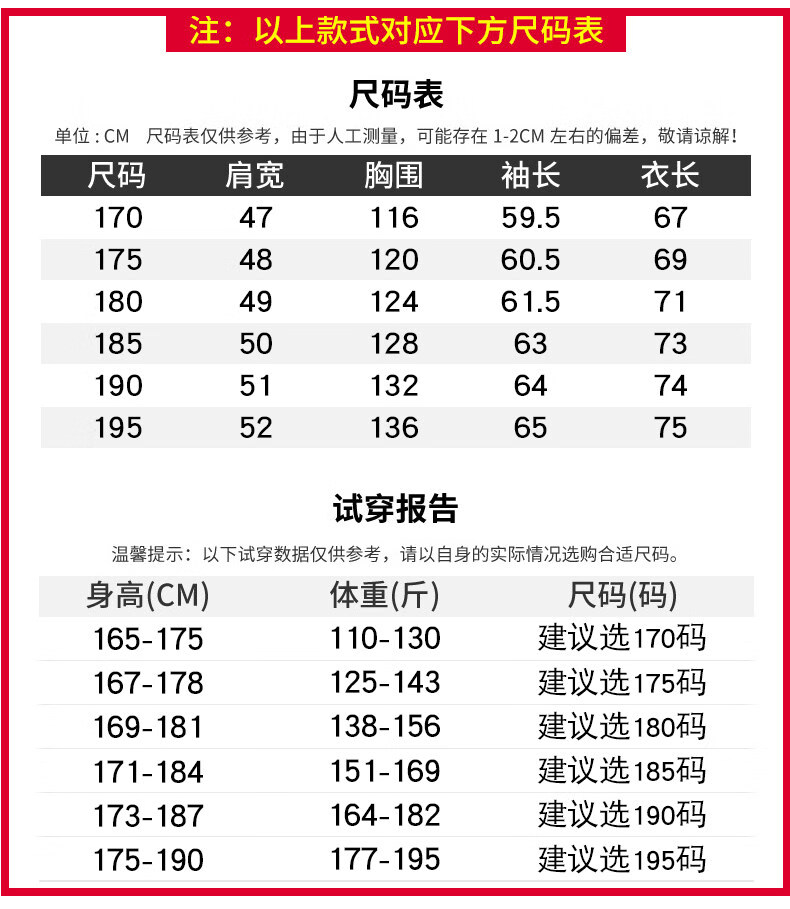China (cm) 165 / 88-90 170 / 96-98 175 / 108-110 180 / 118-122 185 / 126-130