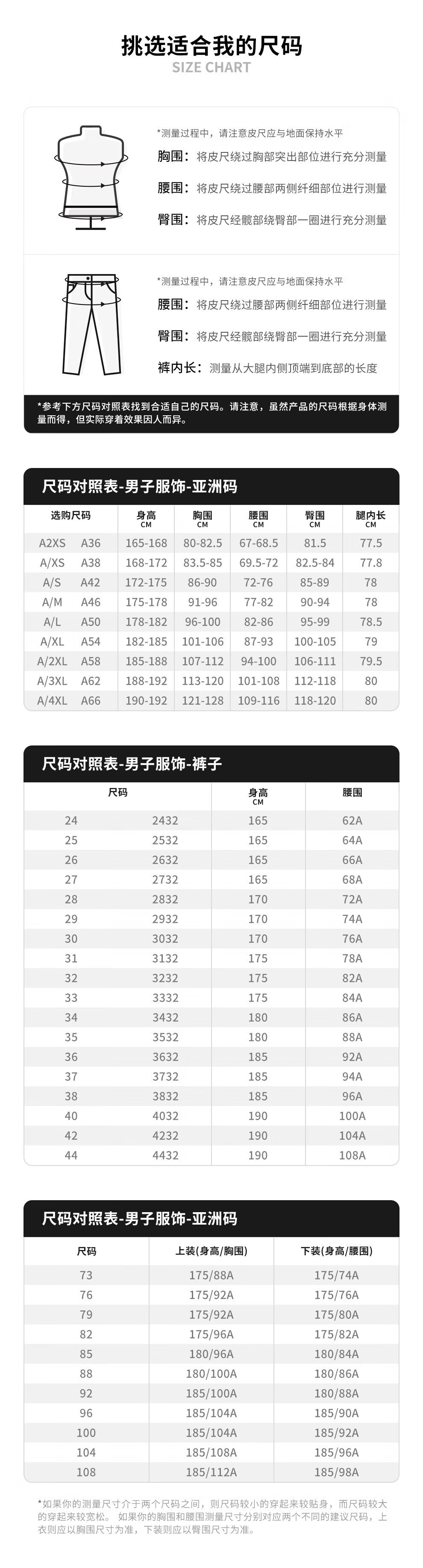 China (cm) 160-165/84-86 165-170 / 88-90 167-172 / 92-96 168-173 / 98-102 170-176 / 106-110