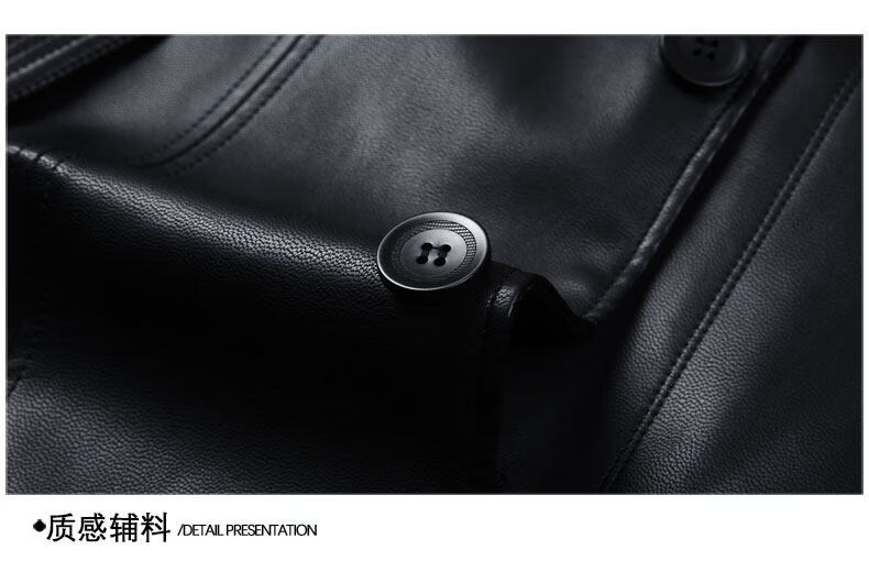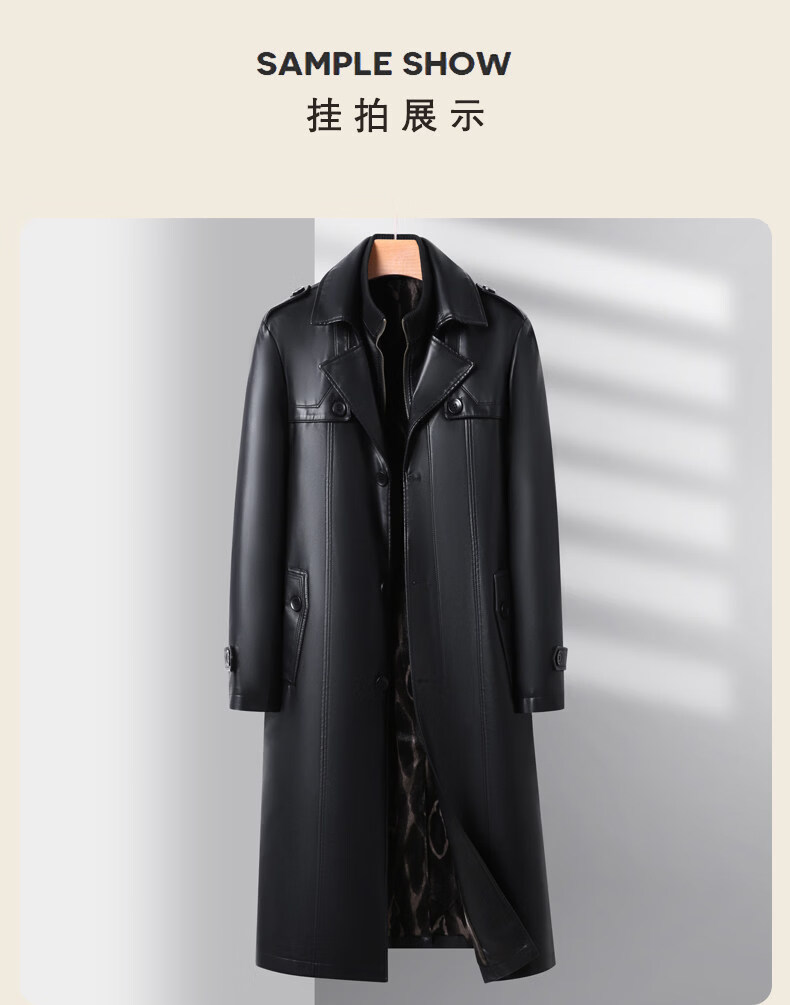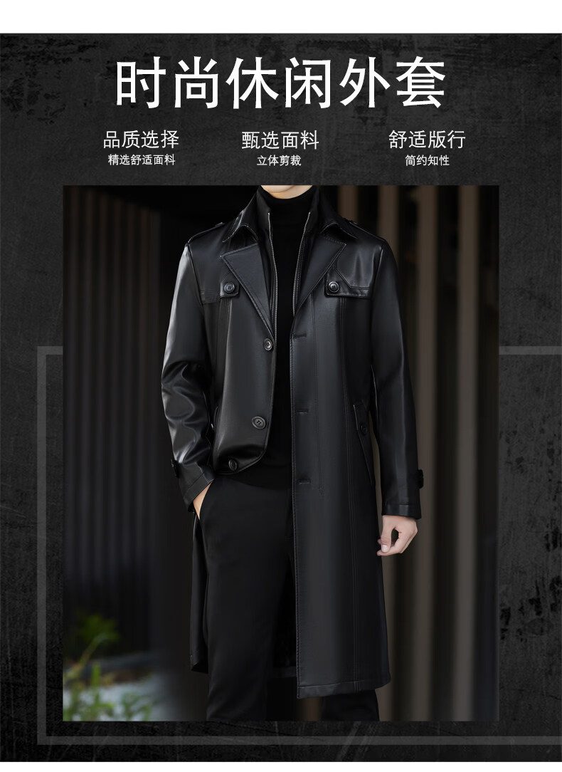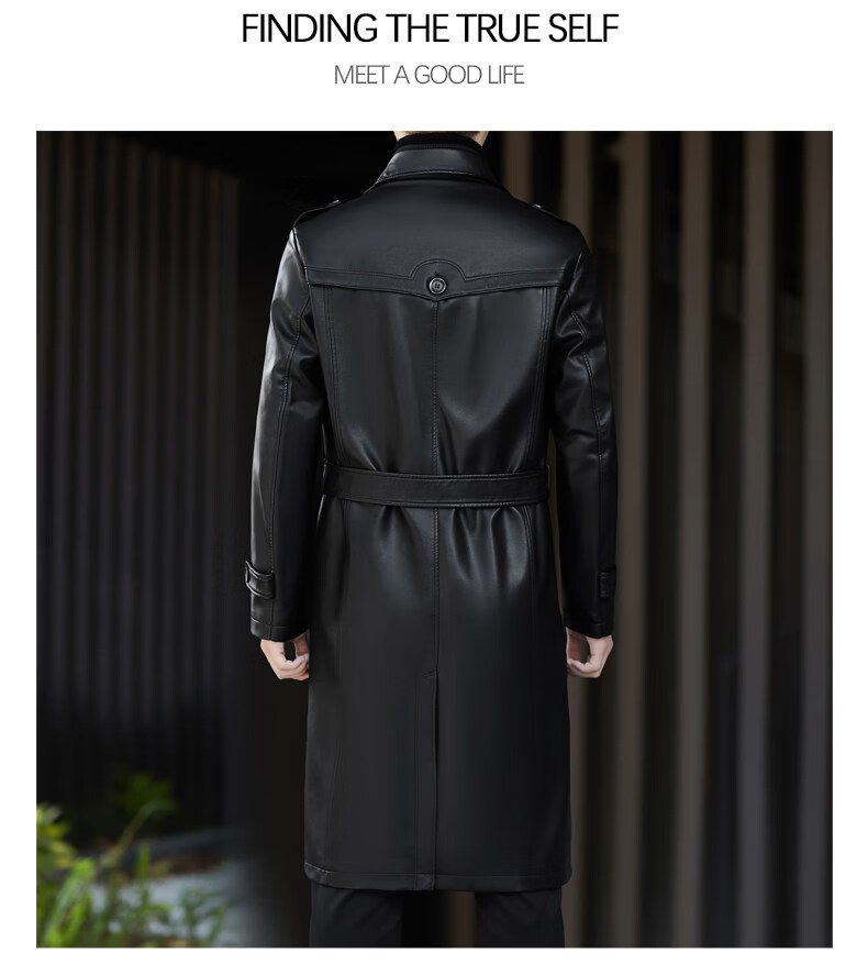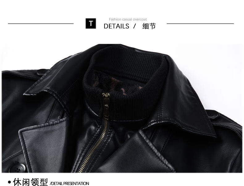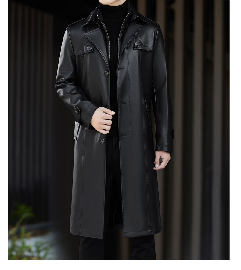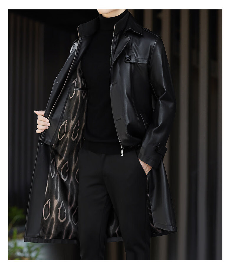 JEEP SPIRIT Leather Jacket Men's Business Plush Thickened Leather Jacket Extra Long Over-the-Knee Fur One-piece Warm Leather Coat Jacket Black M 170