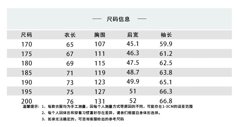 China (cm) 165 / 88-90 170 / 96-98 175 / 108-110 180 / 118-122 185 / 126-130