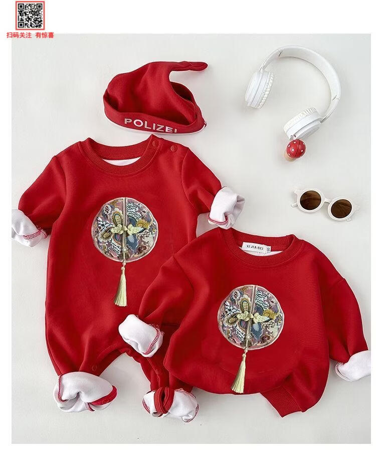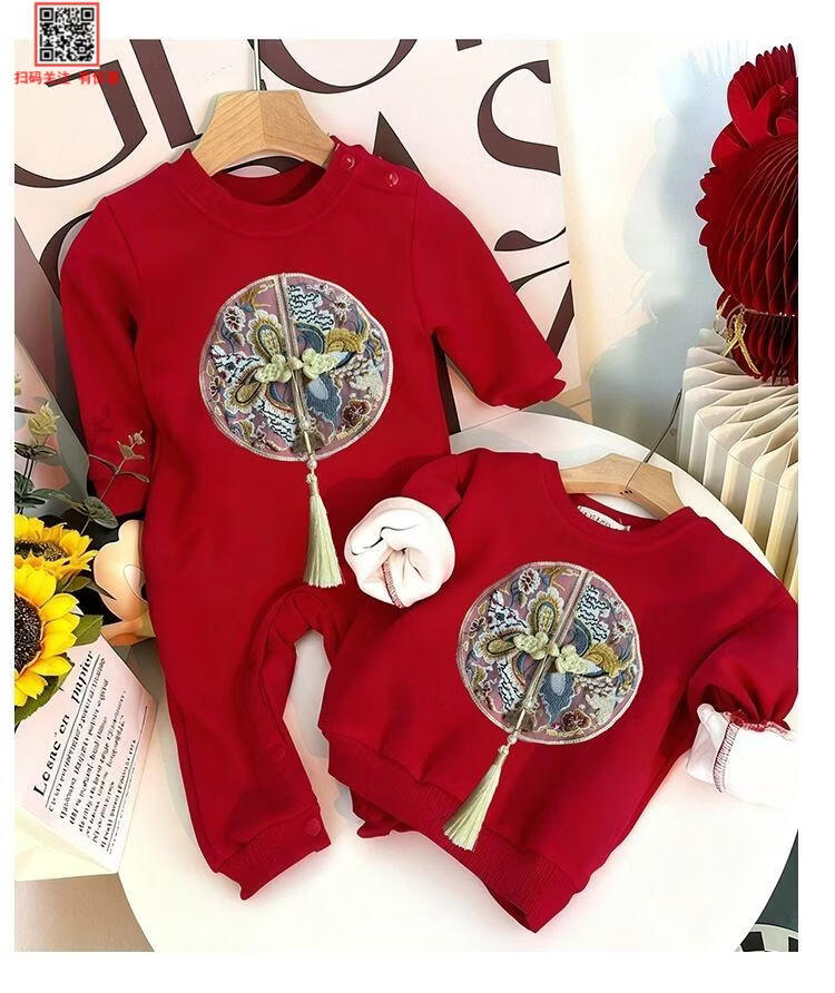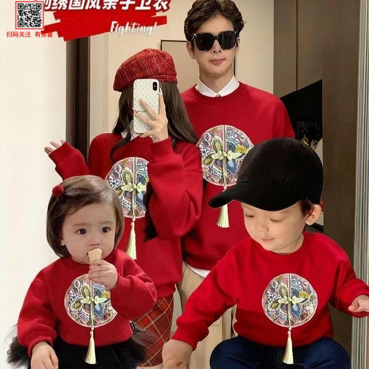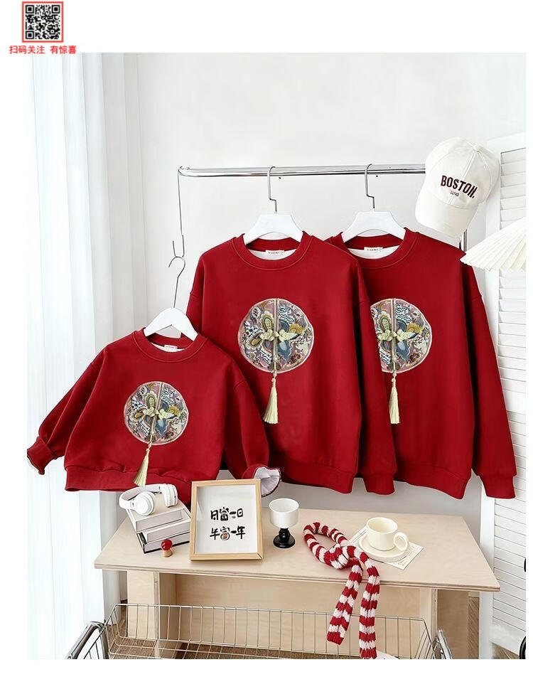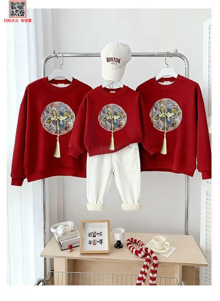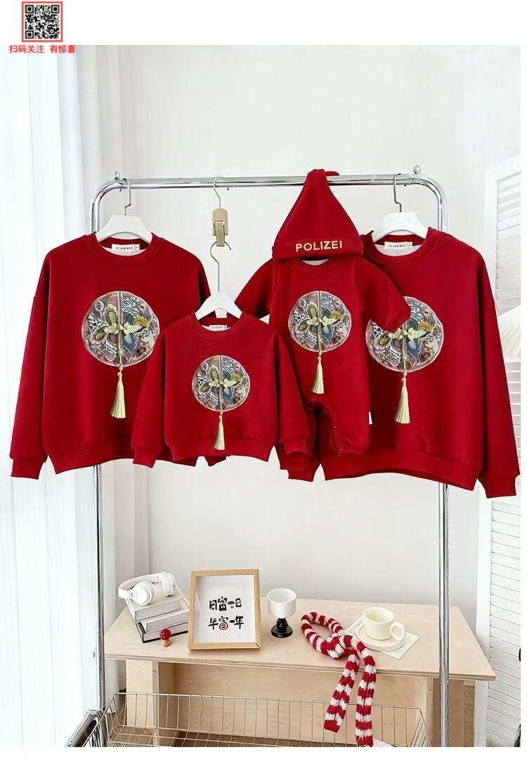 G.duck New Year's parent-child outfits for a family of three and four, autumn and winter red Chinese style sweatshirts for mother and daughter New Year's greetings clothes, big red (without velvet) 80 jumpsuit (romper suit)
