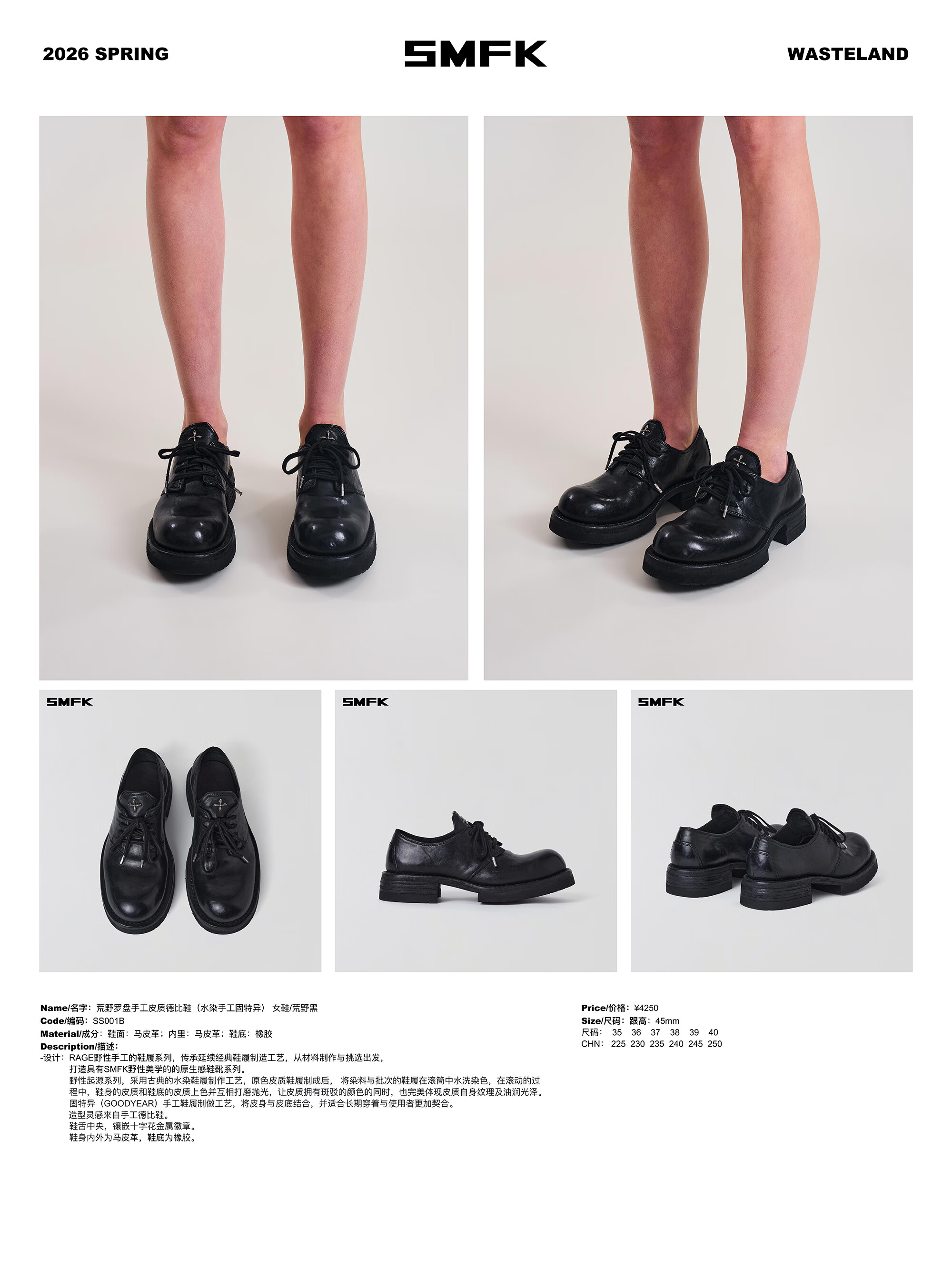 SMFK Wilderness Compass Handmade Leather Derby Shoes (Water Dyed Handmade Goodyear) SS001B/SS001W WILD BLACK/Wildness Black 36