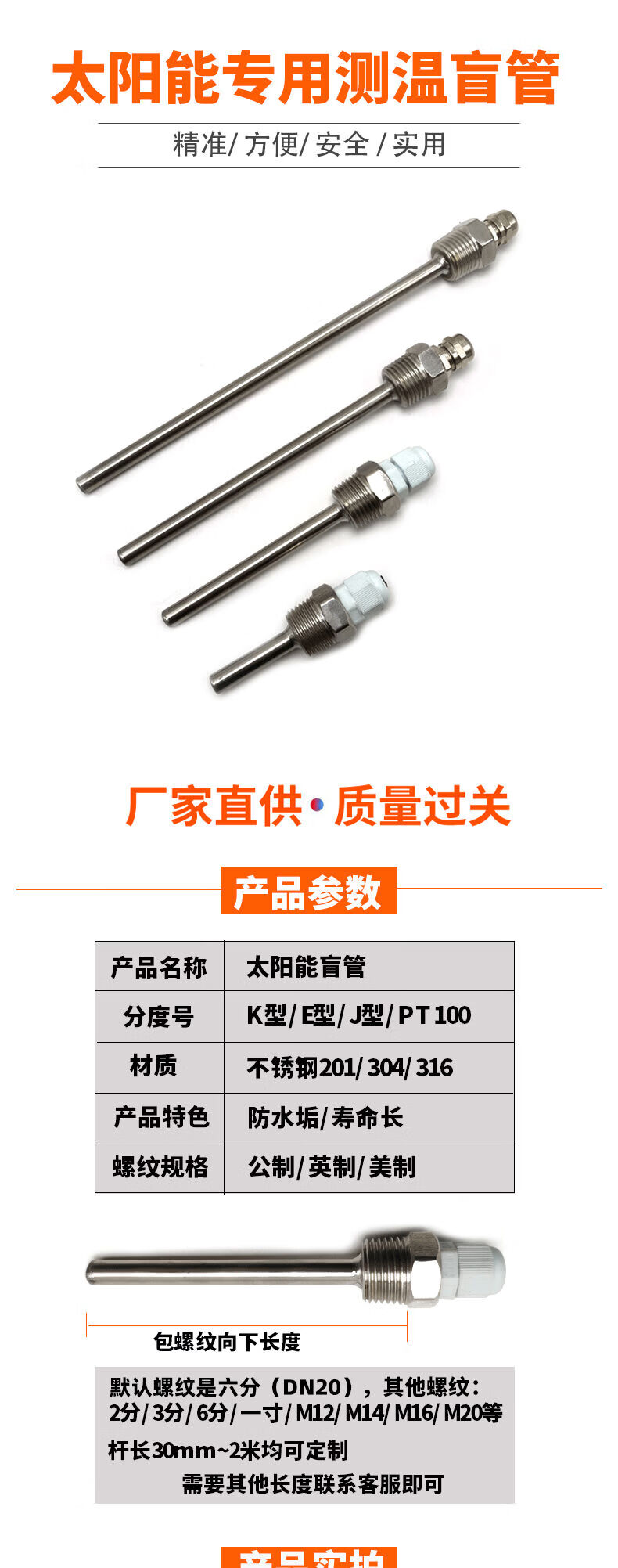 Yaowanxi 6-point blind tube solar air energy temperature probe protective cover temperature sensor shell six-point thread DN20 8*30mm (201)