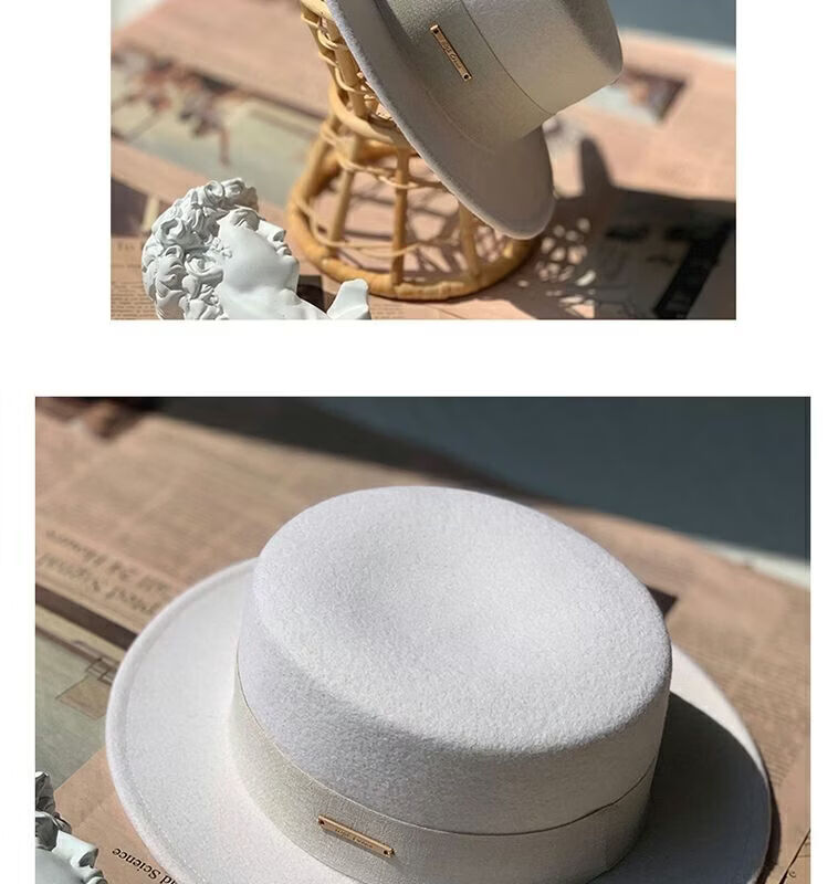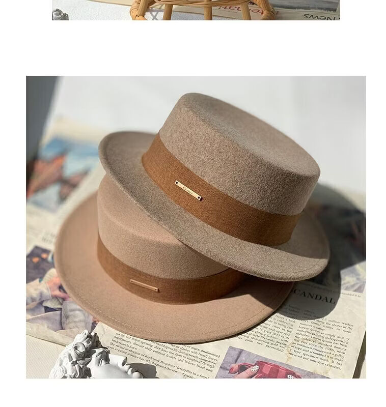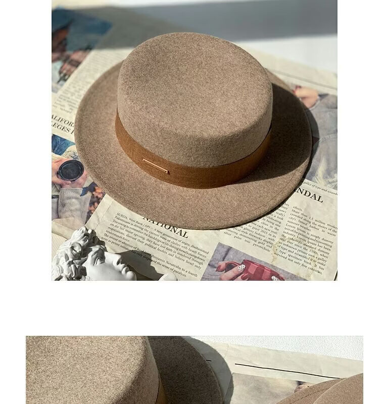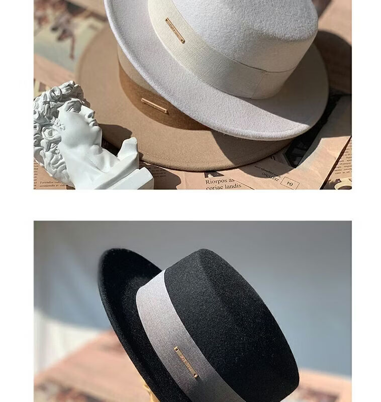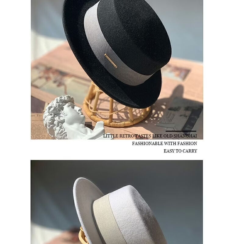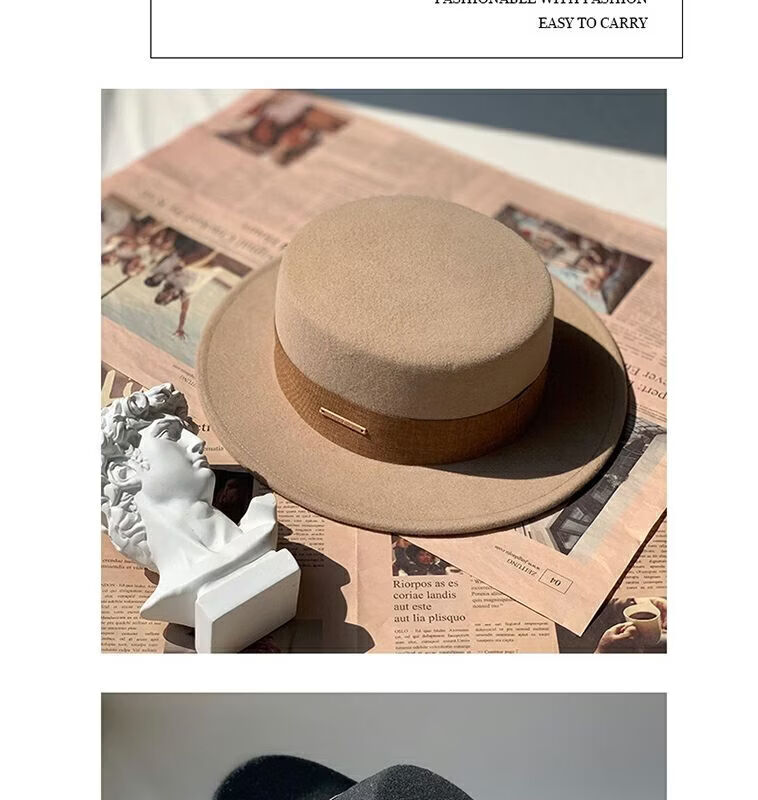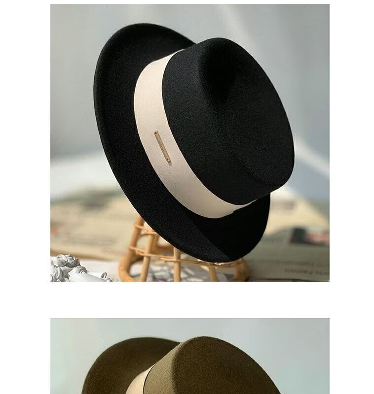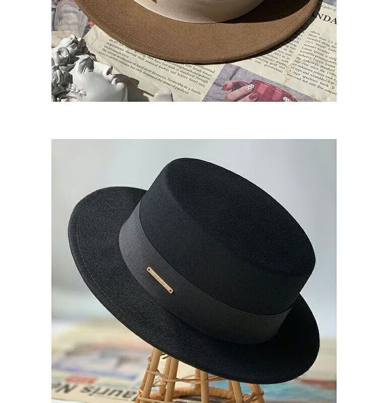 Floating summer large head circumference flat-top woolen hat for women in autumn and winter, versatile camel black and white French flat-brimmed small-brimmed hat for men, black (with pure black strap) 5457 adjustable M (suitable for most people)