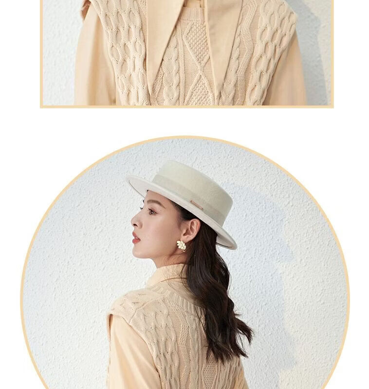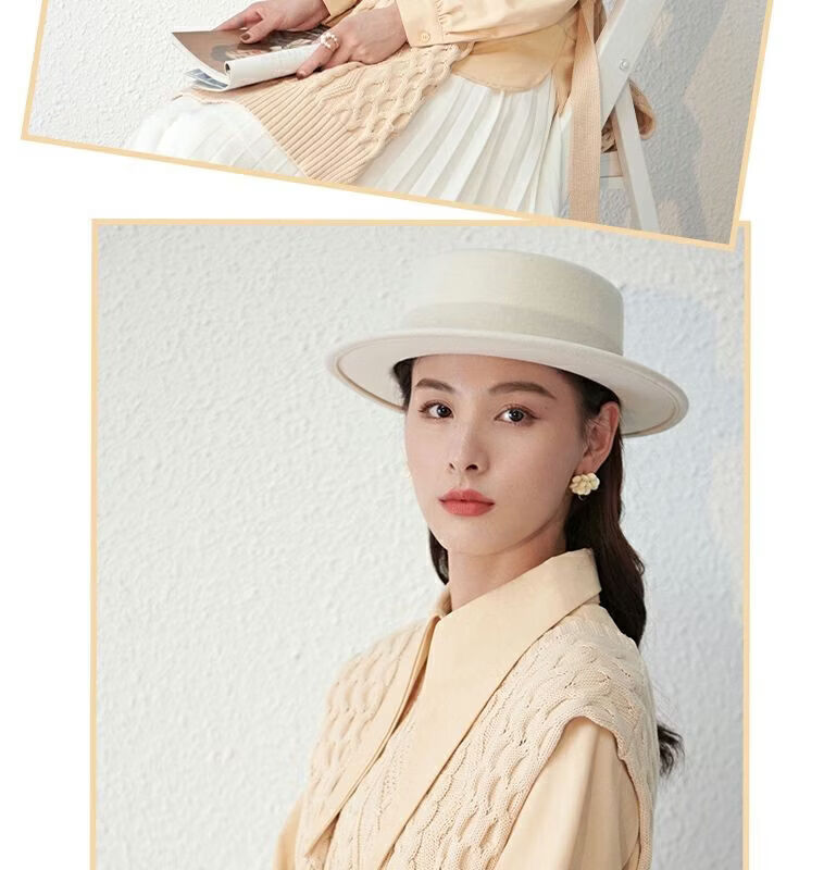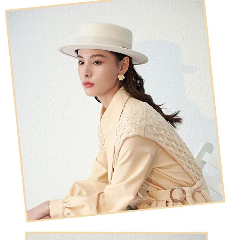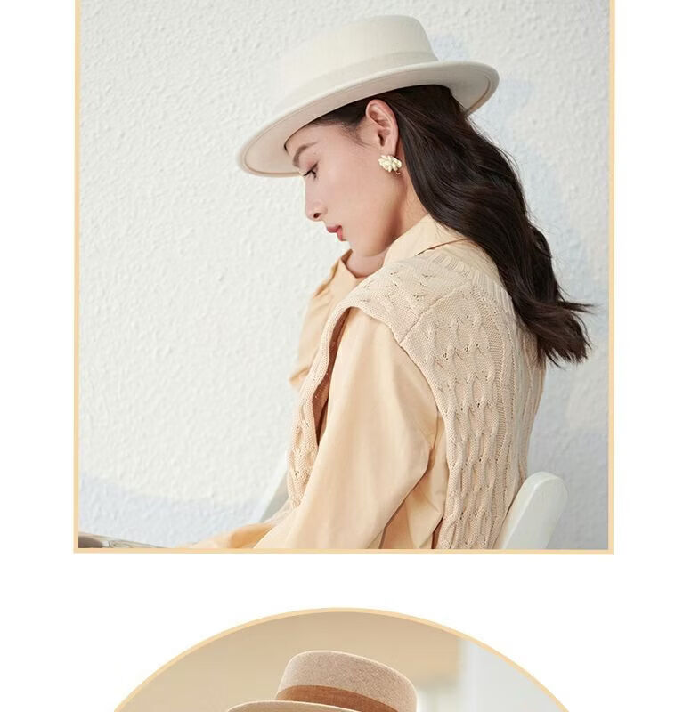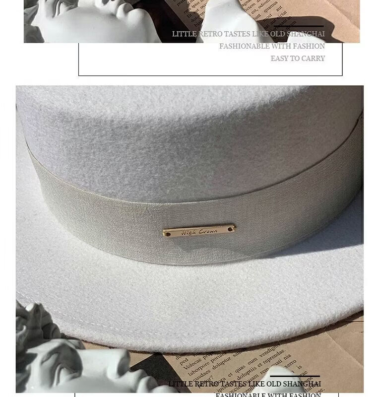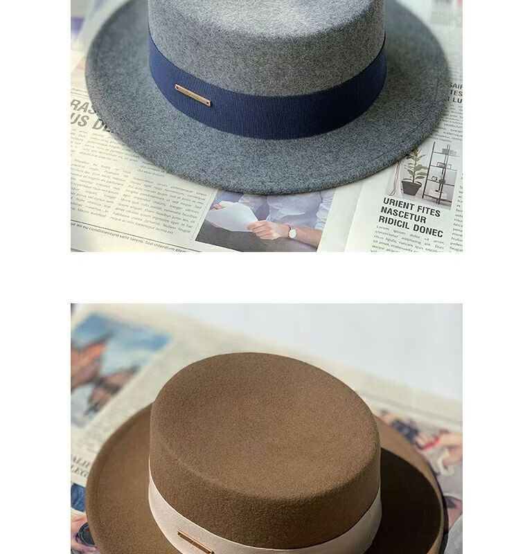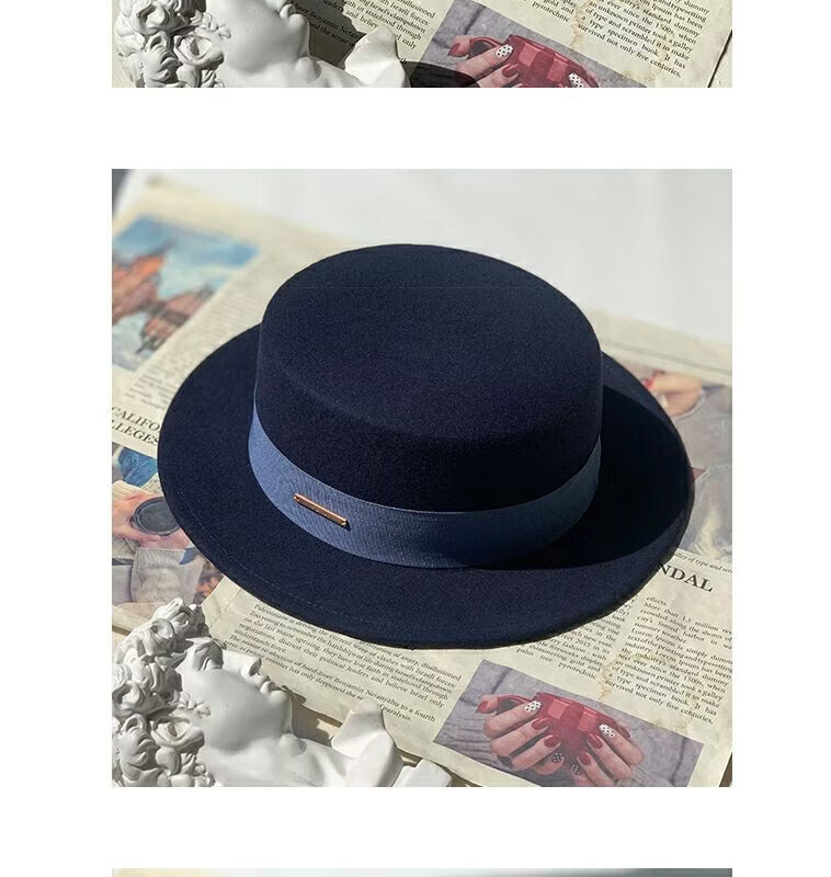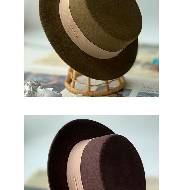 Floating summer large head circumference flat-top woolen hat for women in autumn and winter, versatile camel black and white French flat-brimmed small-brimmed hat for men, black (with pure black strap) 5457 adjustable M (suitable for most people)