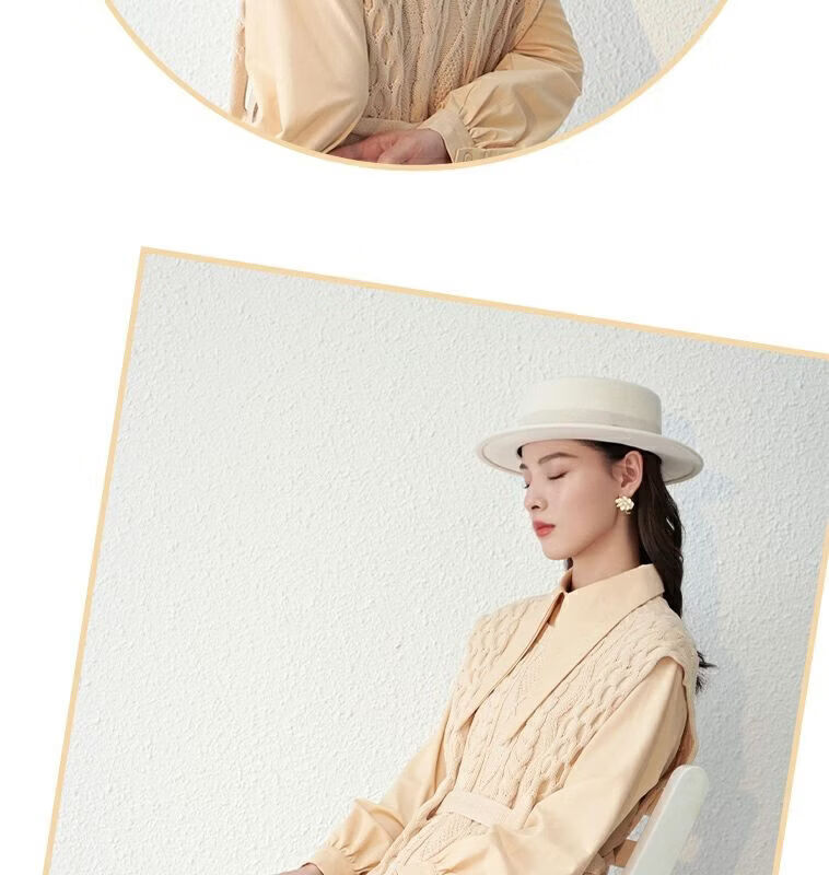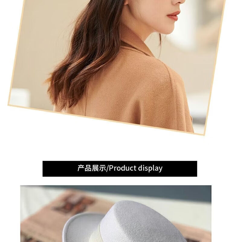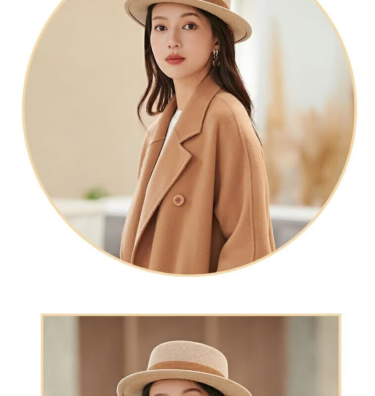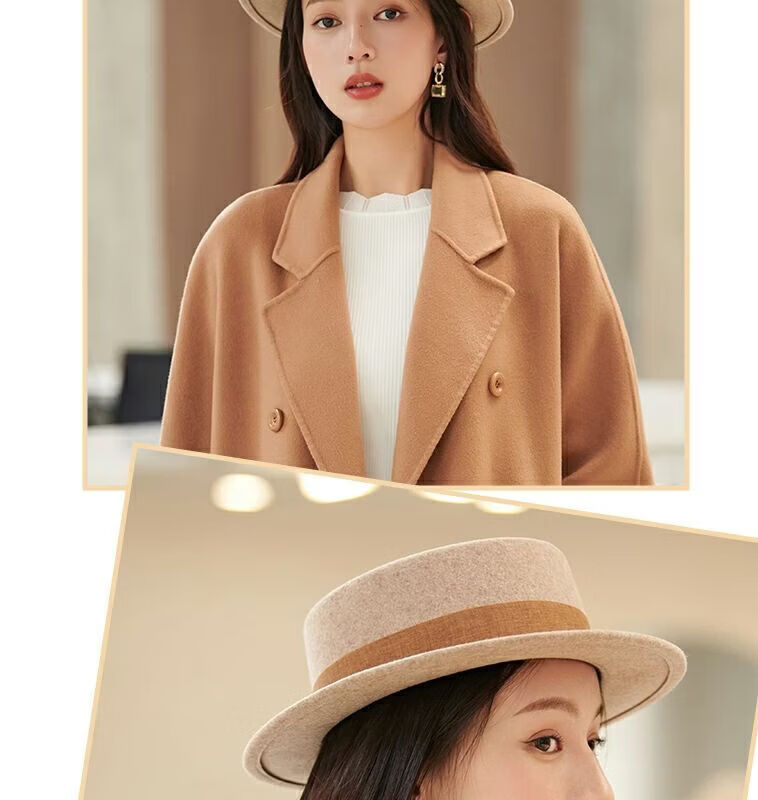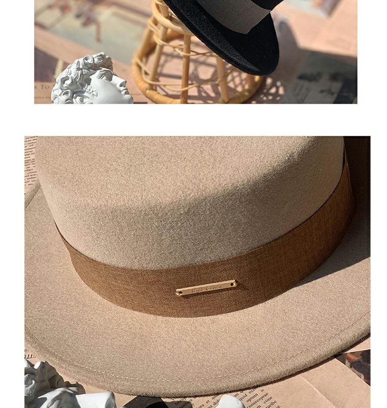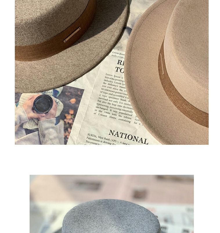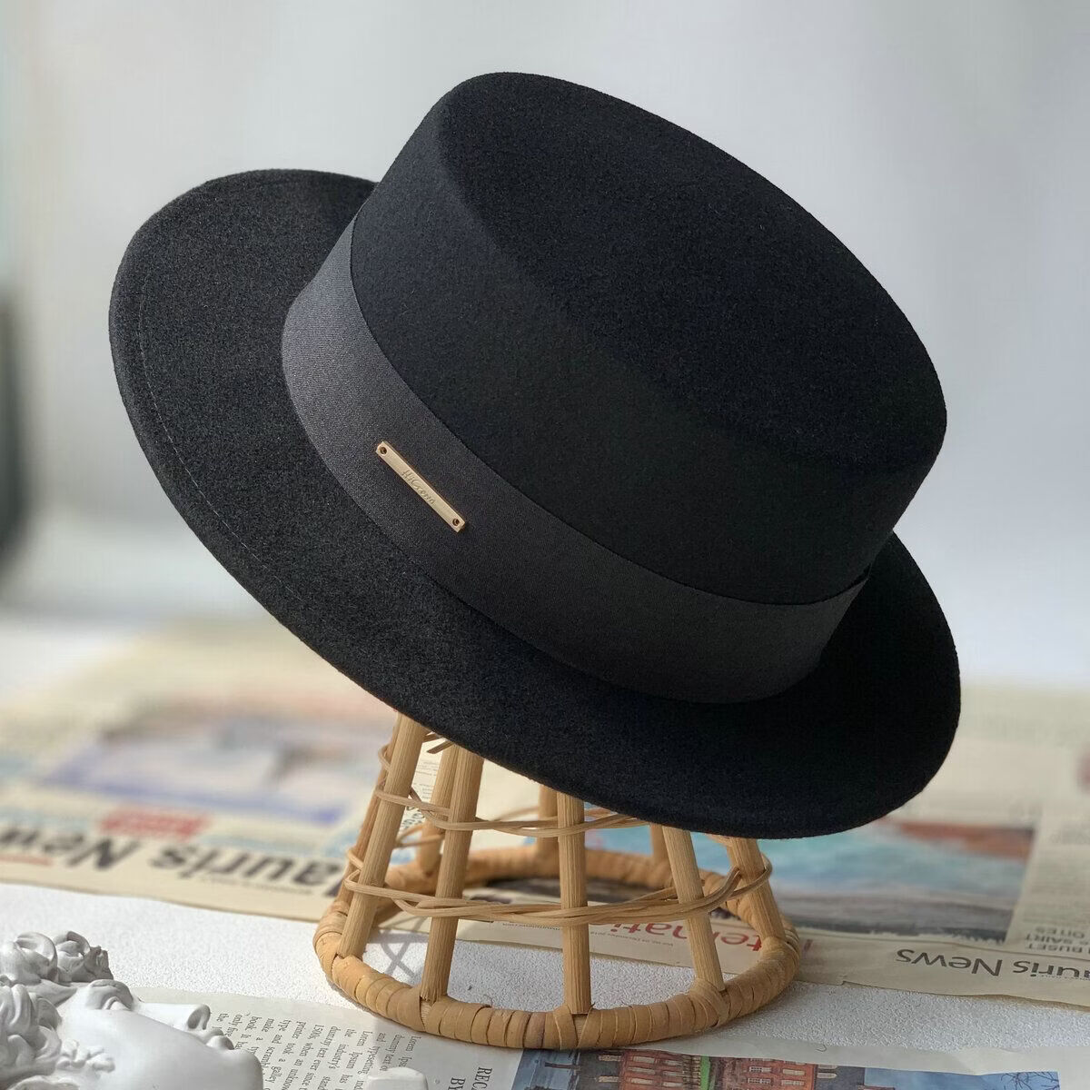 Floating summer large head circumference flat-top woolen hat for women in autumn and winter, versatile camel black and white French flat-brimmed small-brimmed hat for men, black (with pure black strap) 5457 adjustable M (suitable for most people)