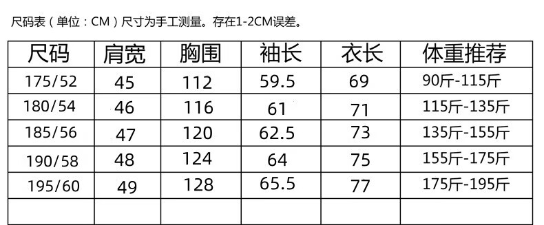 China (cm) 165 / 88-90 170 / 96-98 175 / 108-110 180 / 118-122 185 / 126-130