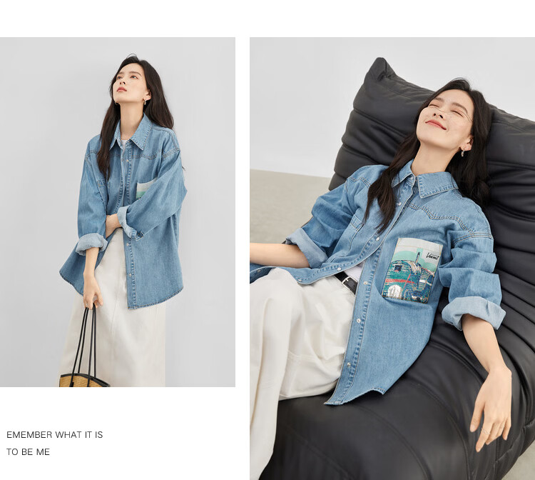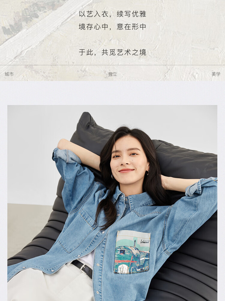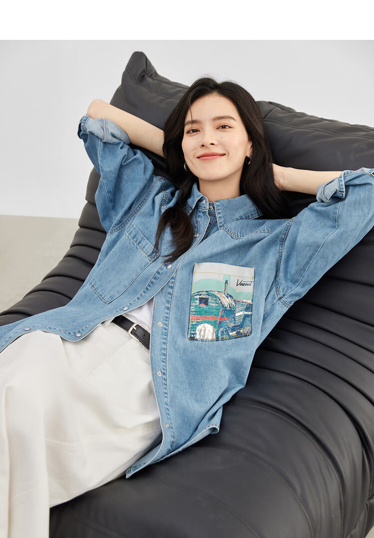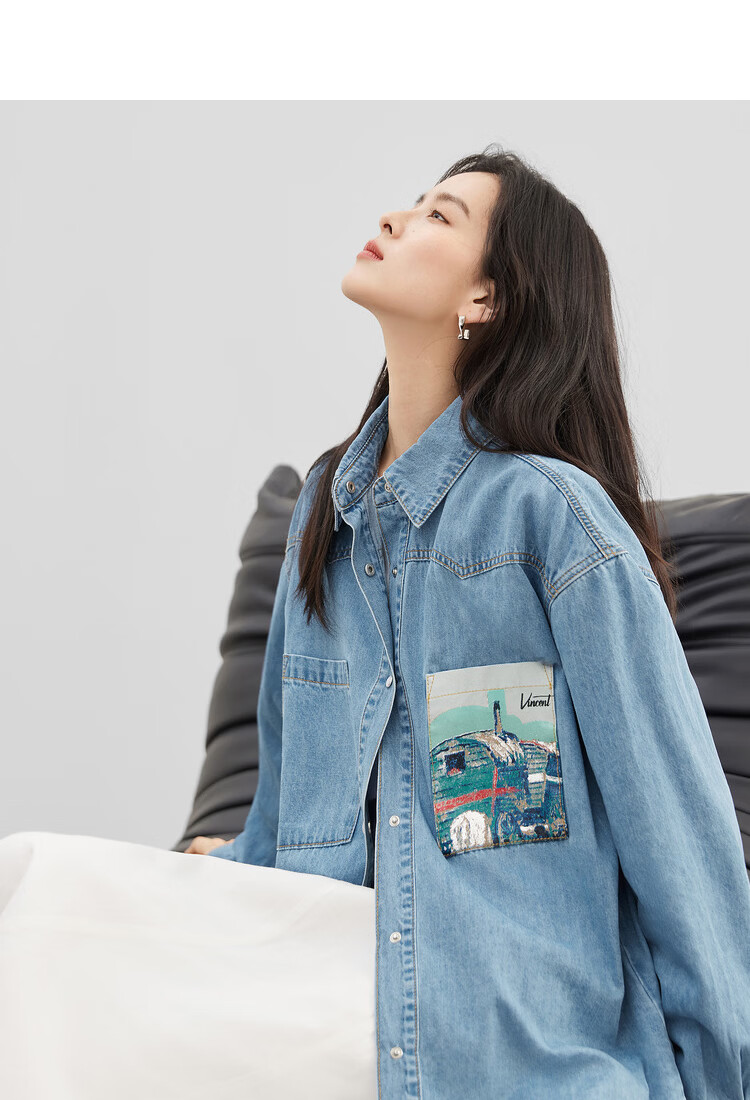 Dialogue (DUIBAI) Vincent Van Gogh Joint Retro Loose Denim Shirt Women's 2026 Spring New Lazy Casual Top Denim Blue S