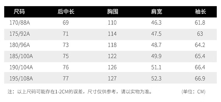 China (cm) 165 / 88-90 170 / 96-98 175 / 108-110 180 / 118-122 185 / 126-130