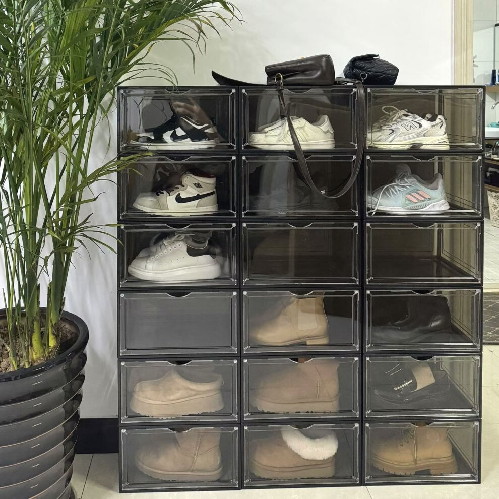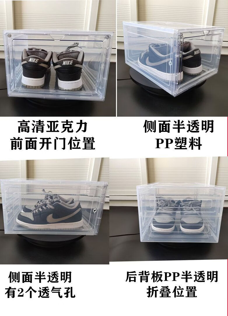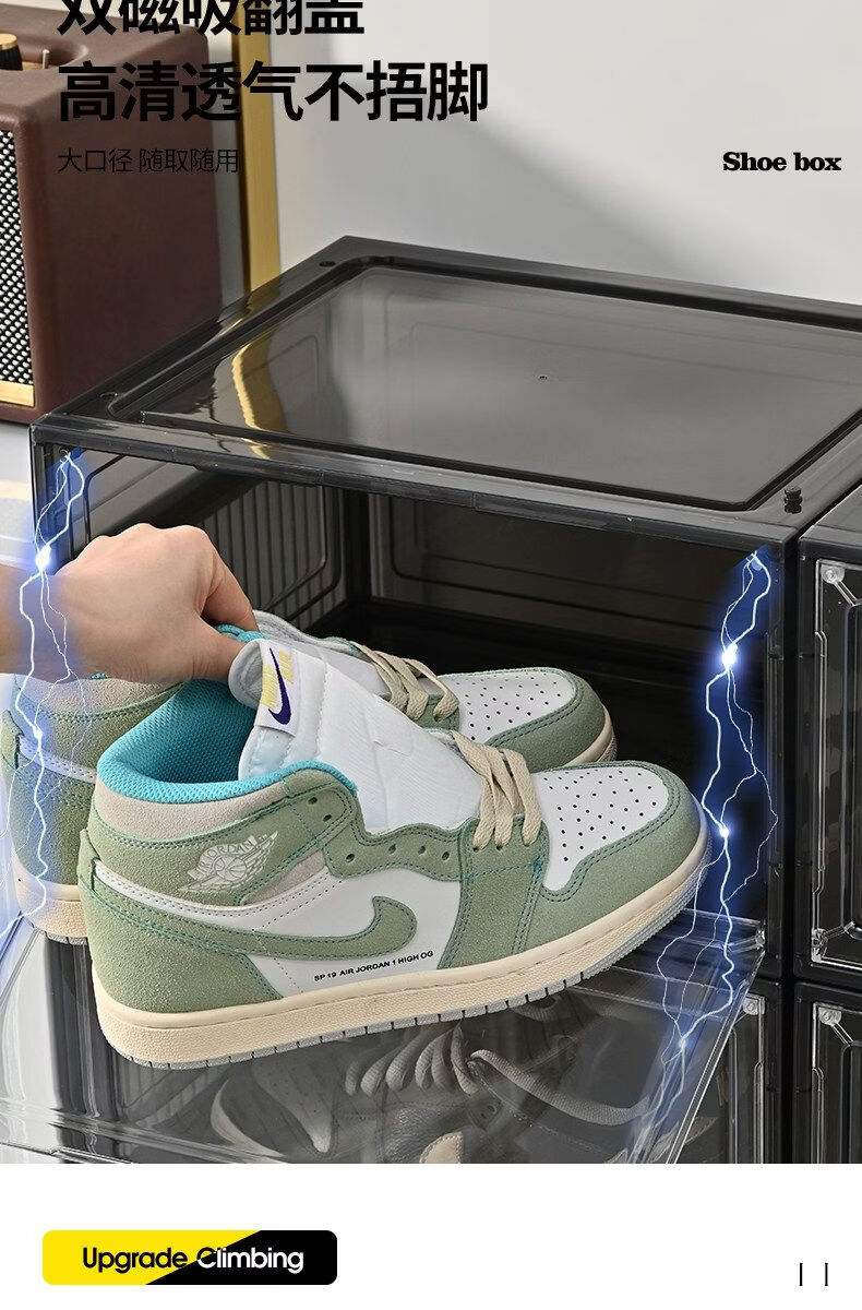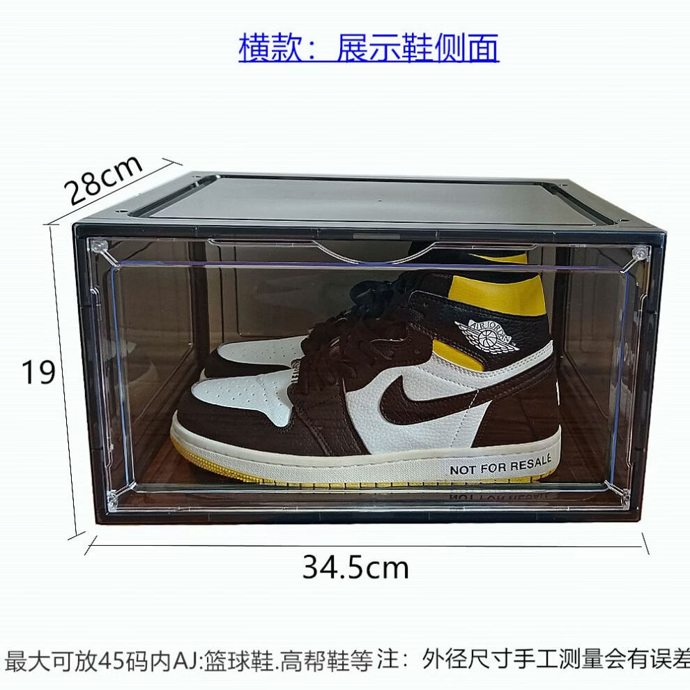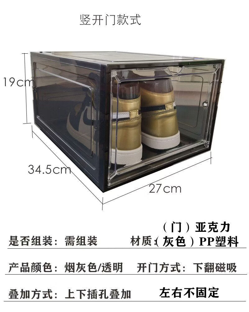 Shijanu Japanese-style transparent magnetic acrylic front-opening vertical goalball shoe storage shoe box home assembled breathable plastic aj box horizontal version smoke gray magnetic suction 12 pack_side display shoes