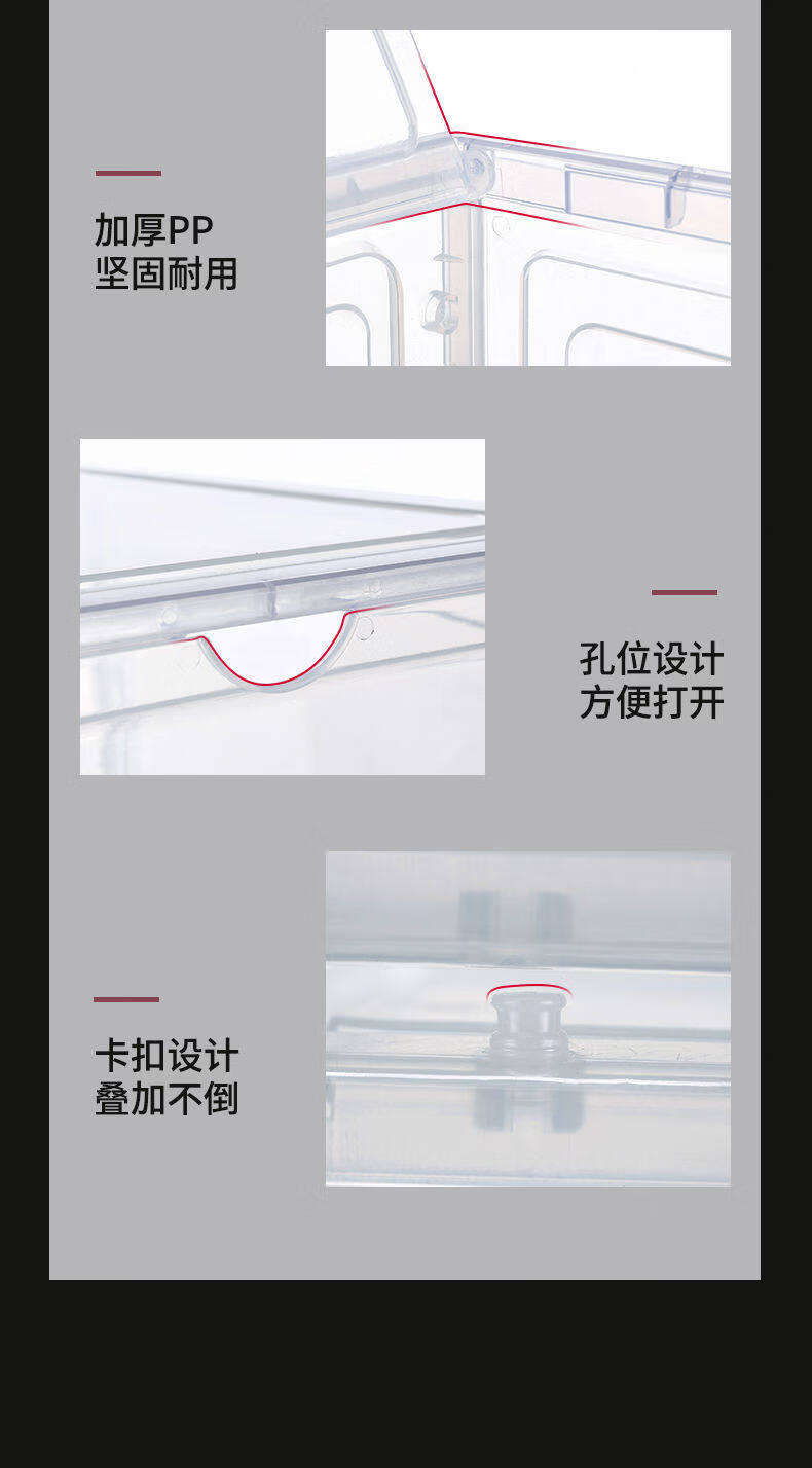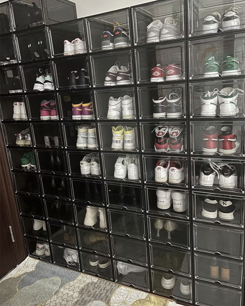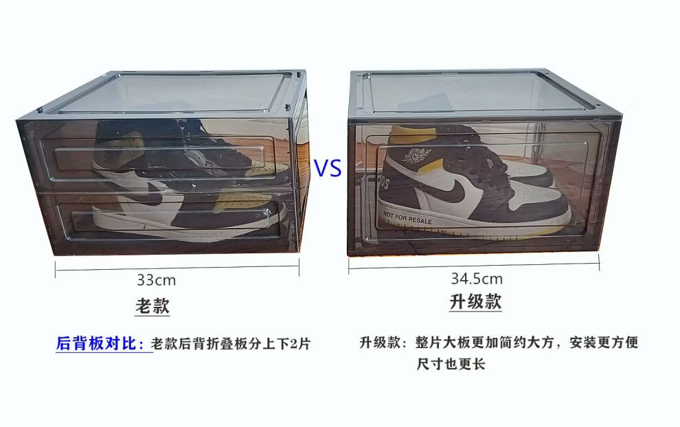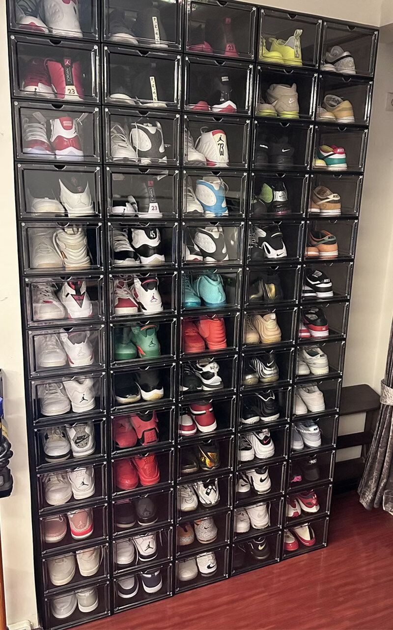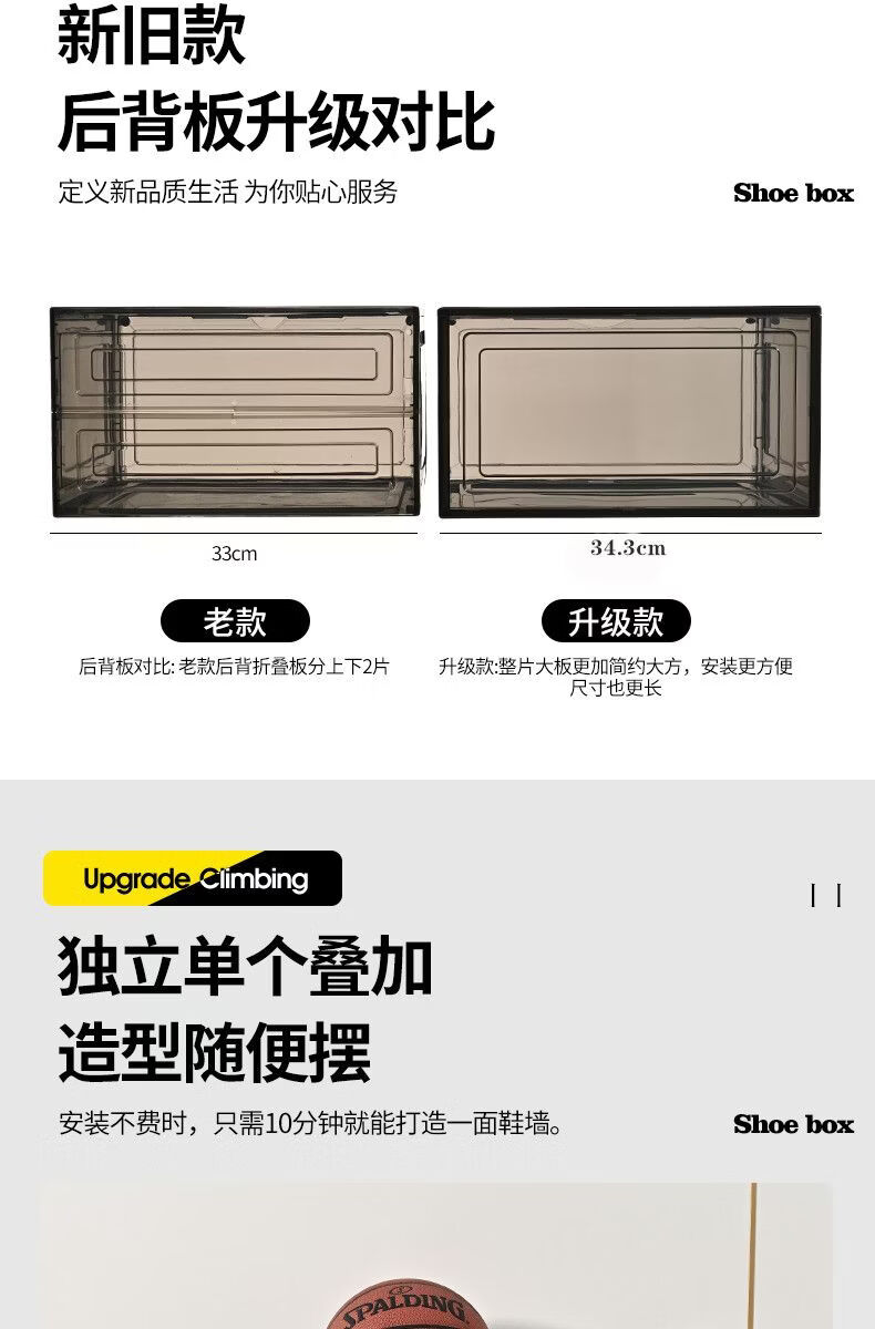 Shijanu Japanese-style transparent magnetic acrylic front-opening vertical goalball shoe storage shoe box home assembled breathable plastic aj box horizontal version smoke gray magnetic suction 12 pack_side display shoes