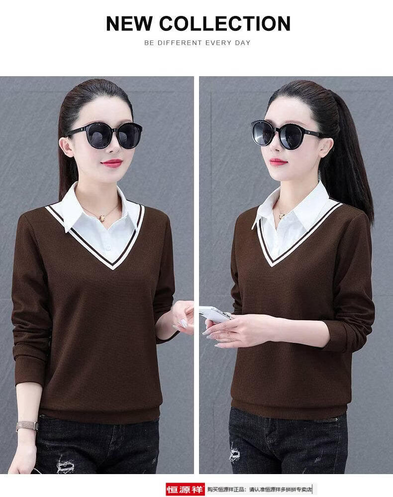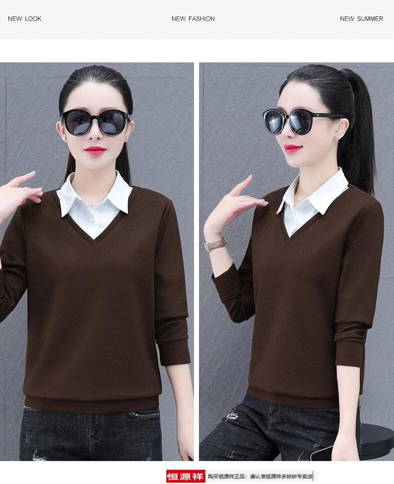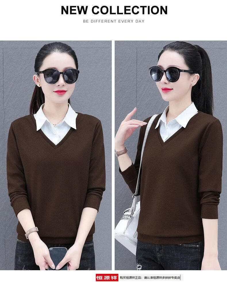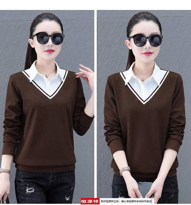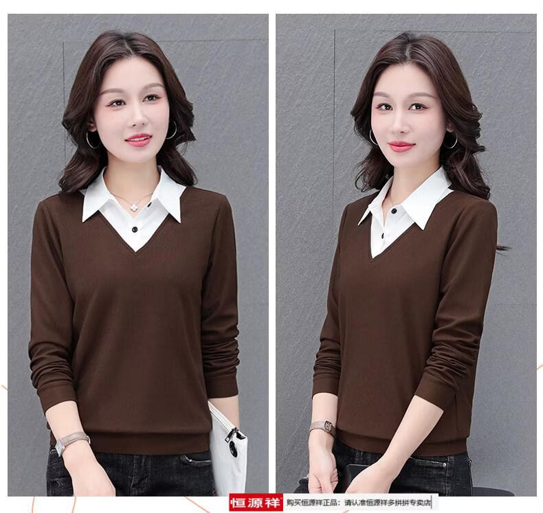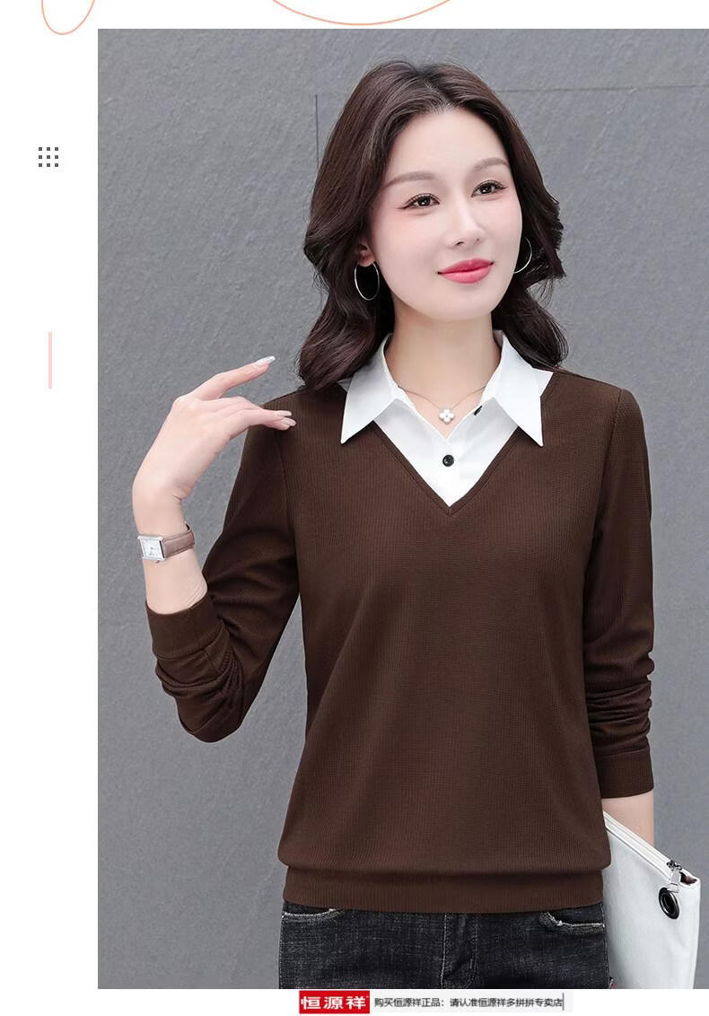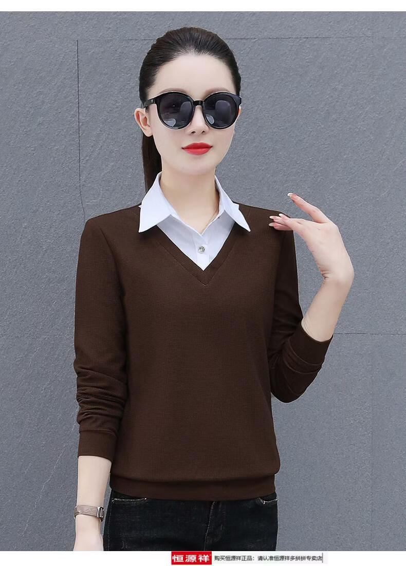 Hengyuan Xiang fake two-piece shirt women's long-sleeved spring and autumn new style middle-aged mother's shirt Western style versatile sweatshirt bottoming plus velvet top AK27 coffee color M recommended 80-105Jin Jin equals 0.5 kg