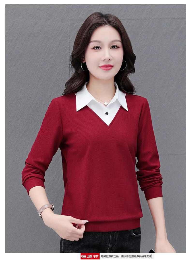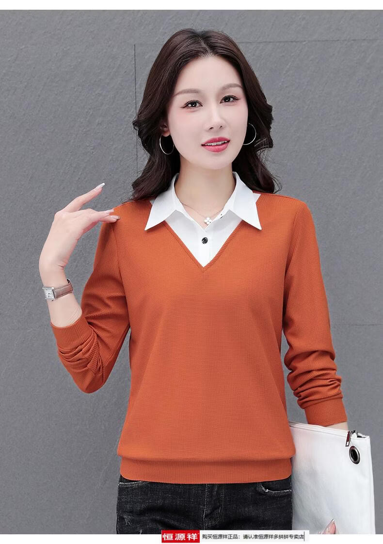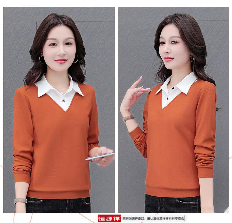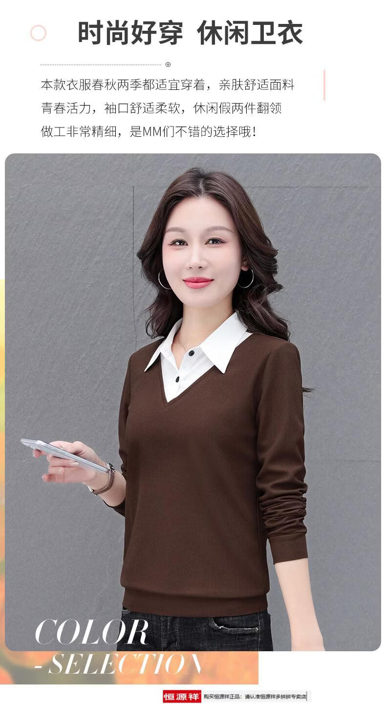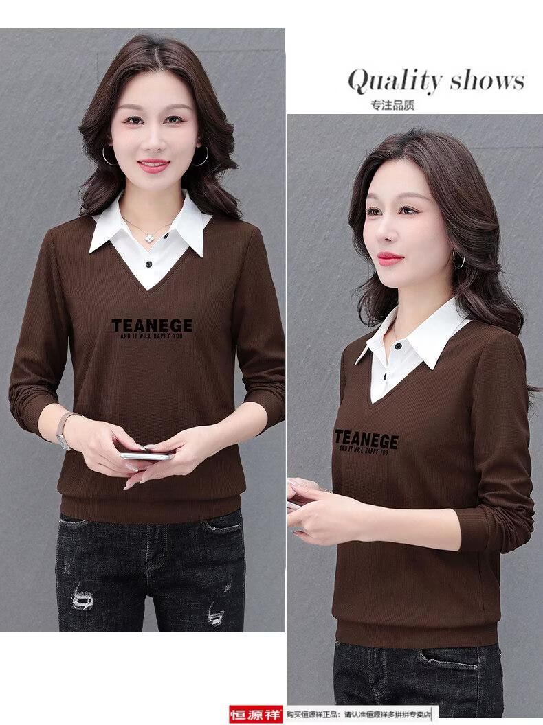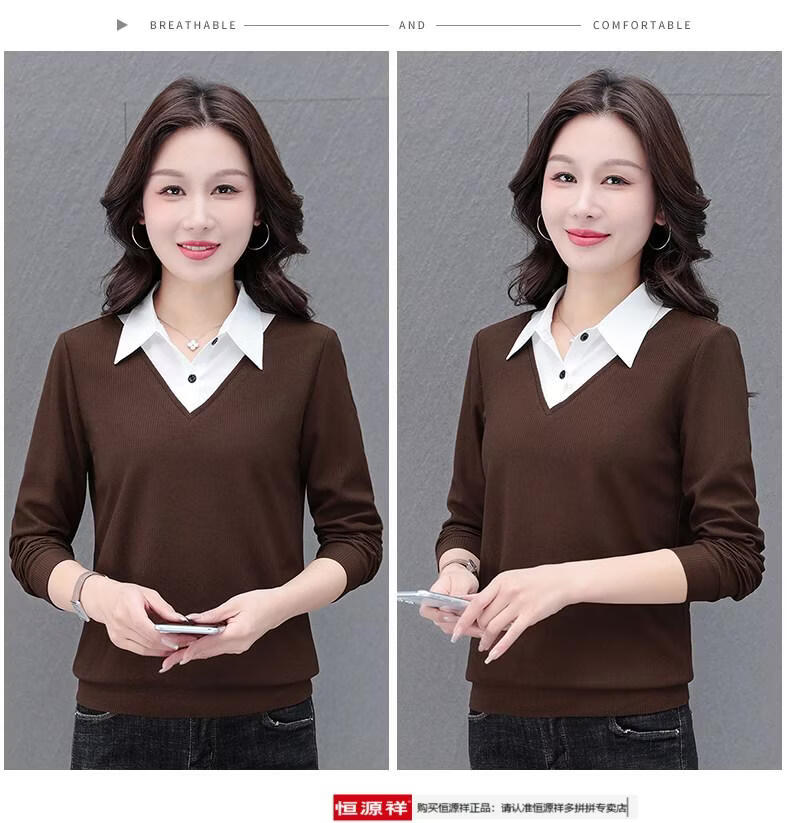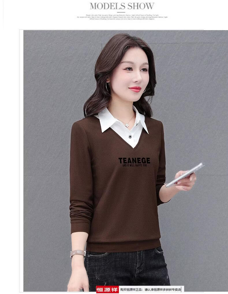 Hengyuan Xiang fake two-piece shirt women's long-sleeved spring and autumn new style middle-aged mother's shirt Western style versatile sweatshirt bottoming plus velvet top AK27 coffee color M recommended 80-105Jin Jin equals 0.5 kg