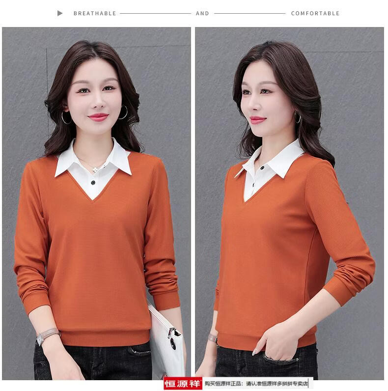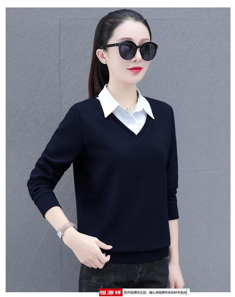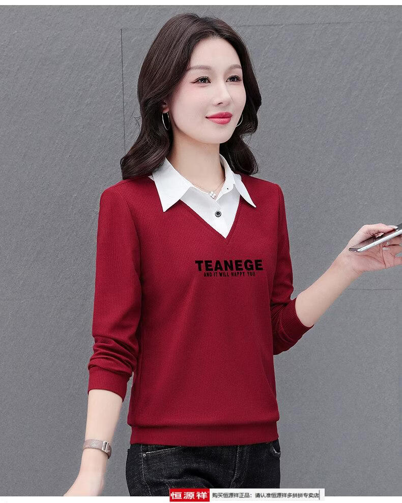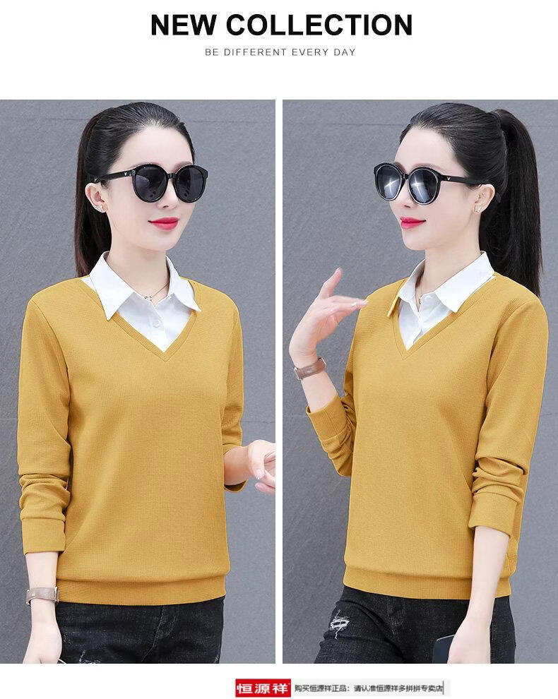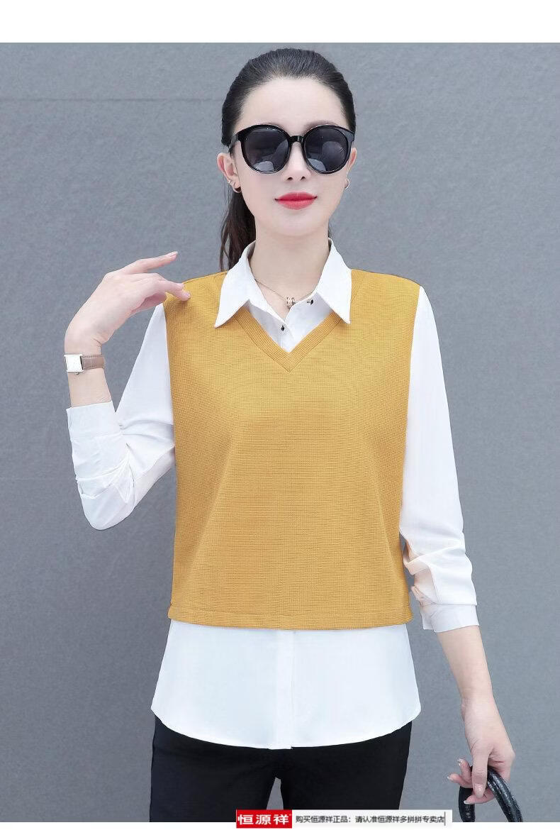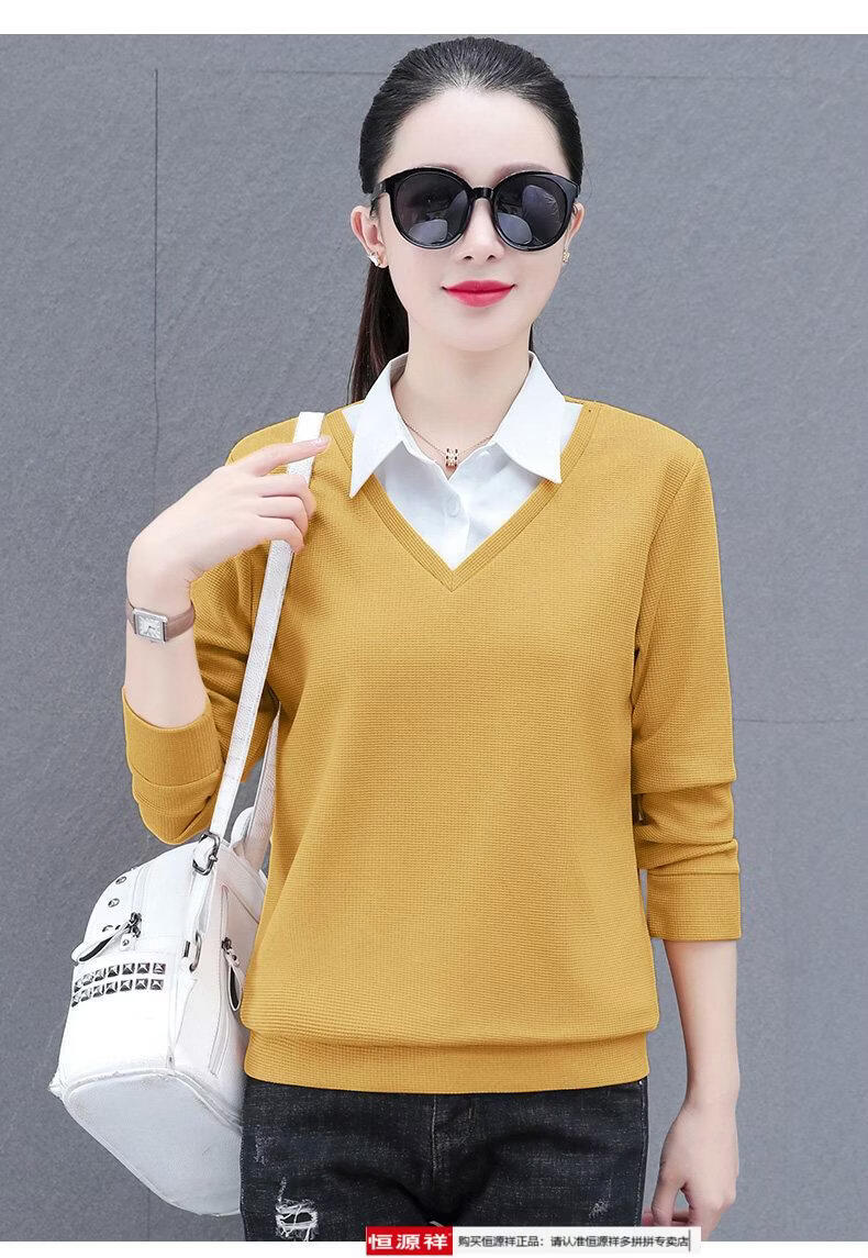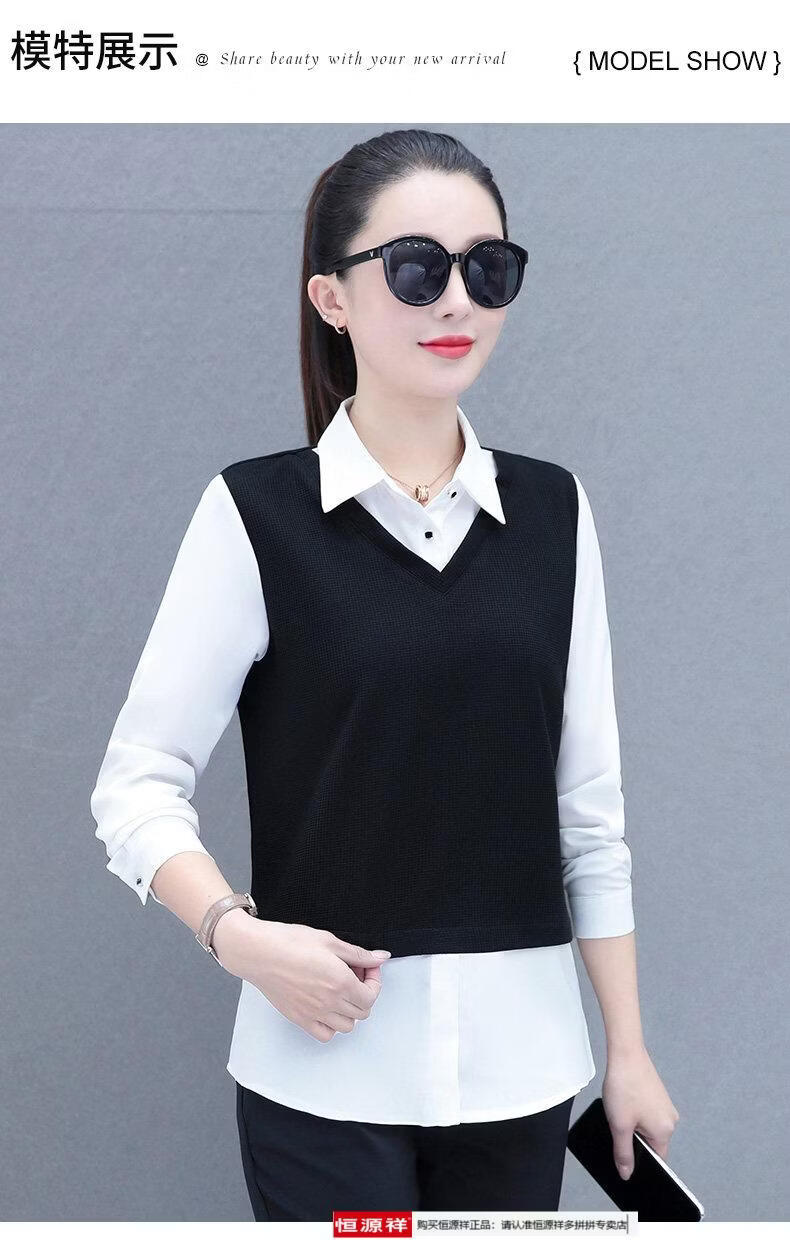 Hengyuan Xiang fake two-piece shirt women's long-sleeved spring and autumn new style middle-aged mother's shirt Western style versatile sweatshirt bottoming plus velvet top AK27 coffee color M recommended 80-105Jin Jin equals 0.5 kg