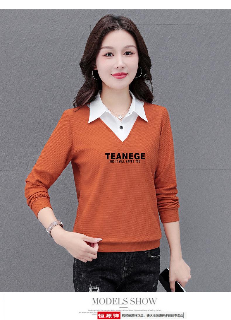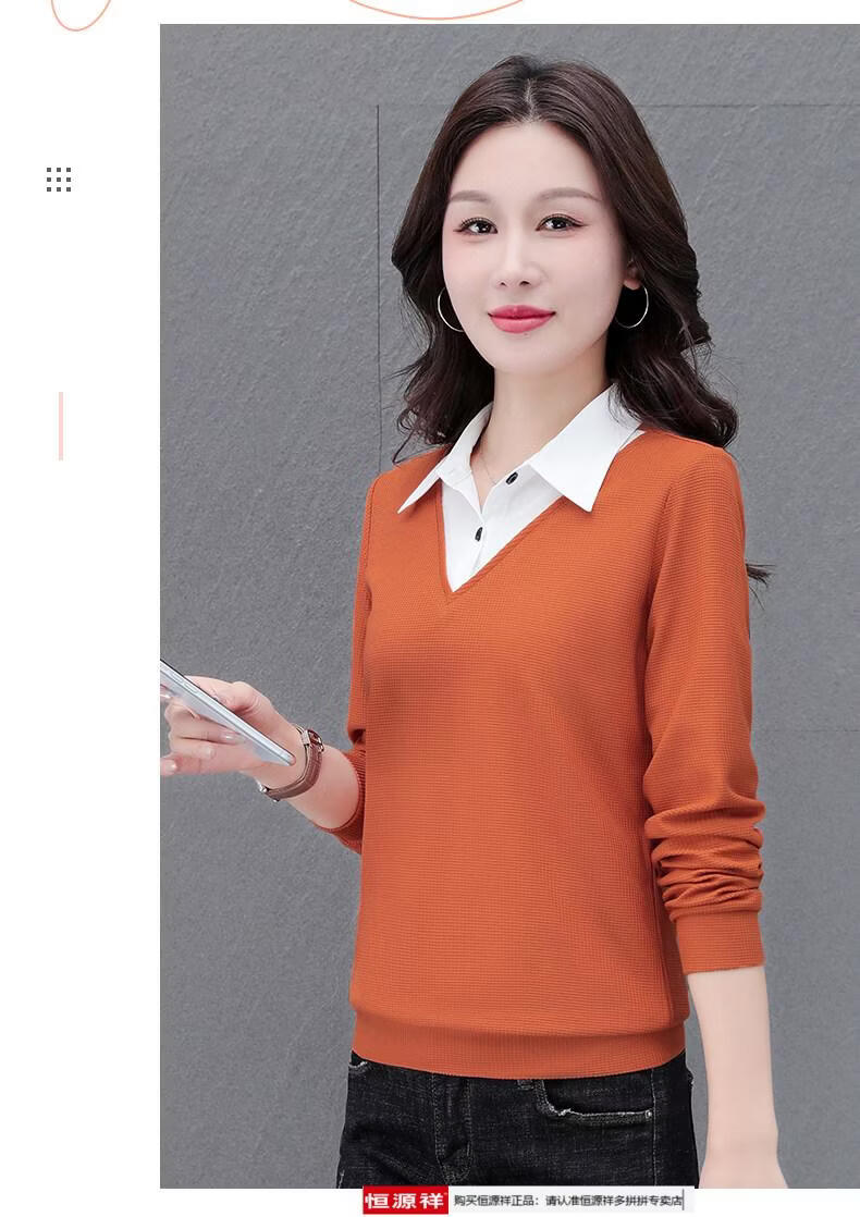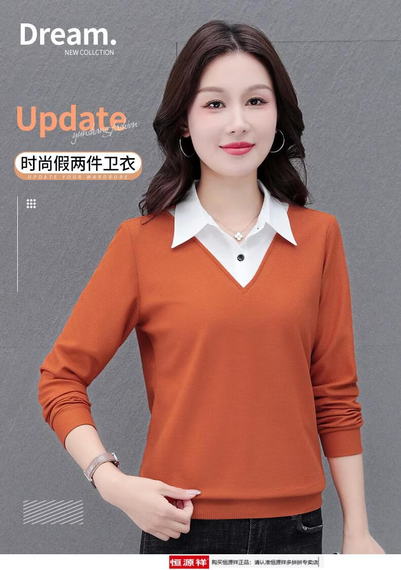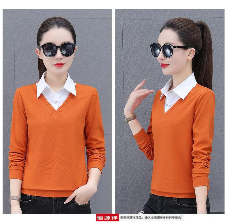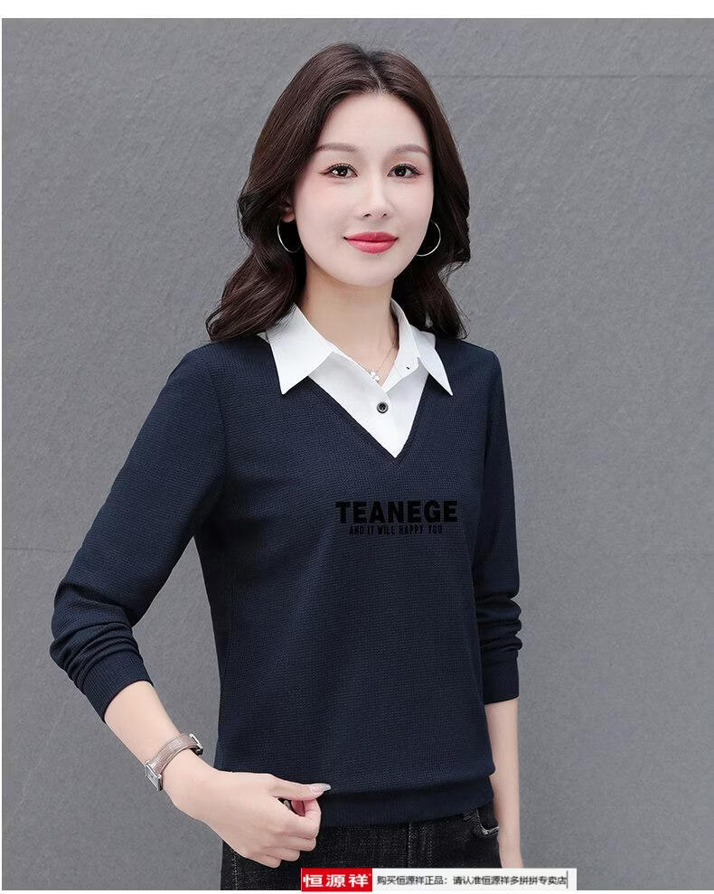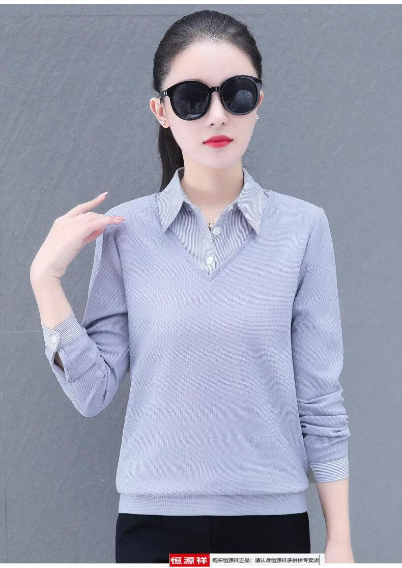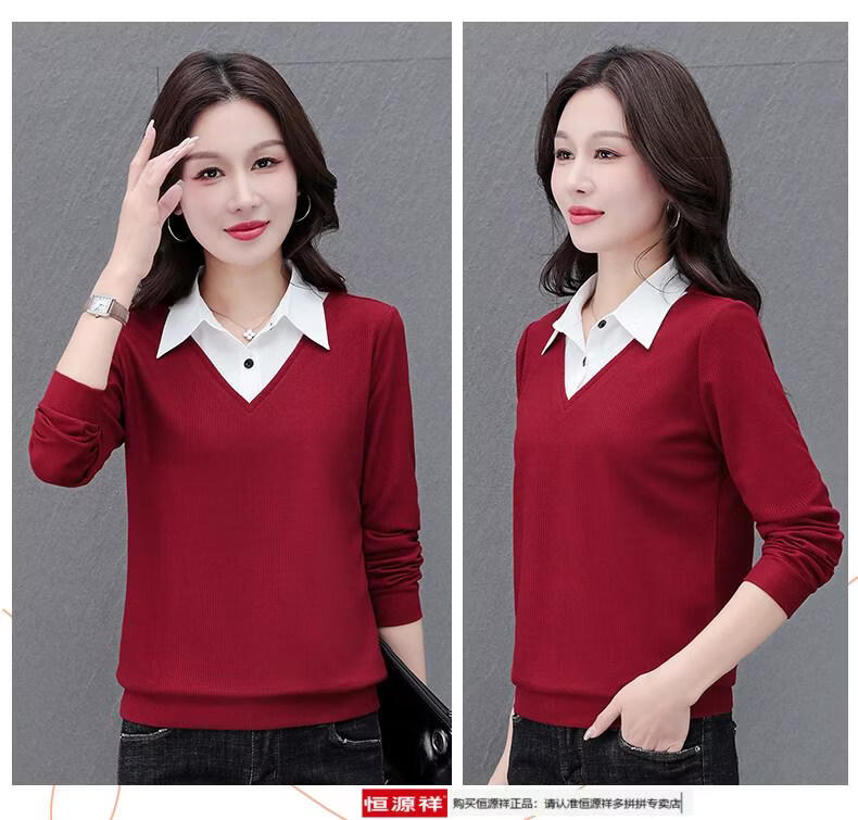 Hengyuan Xiang fake two-piece shirt women's long-sleeved spring and autumn new style middle-aged mother's shirt Western style versatile sweatshirt bottoming plus velvet top AK27 coffee color M recommended 80-105Jin Jin equals 0.5 kg