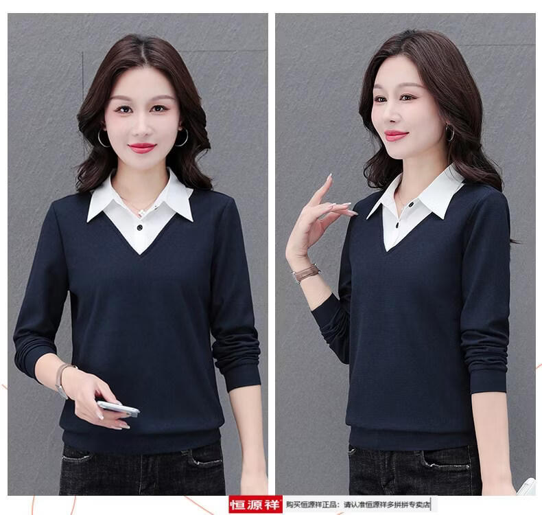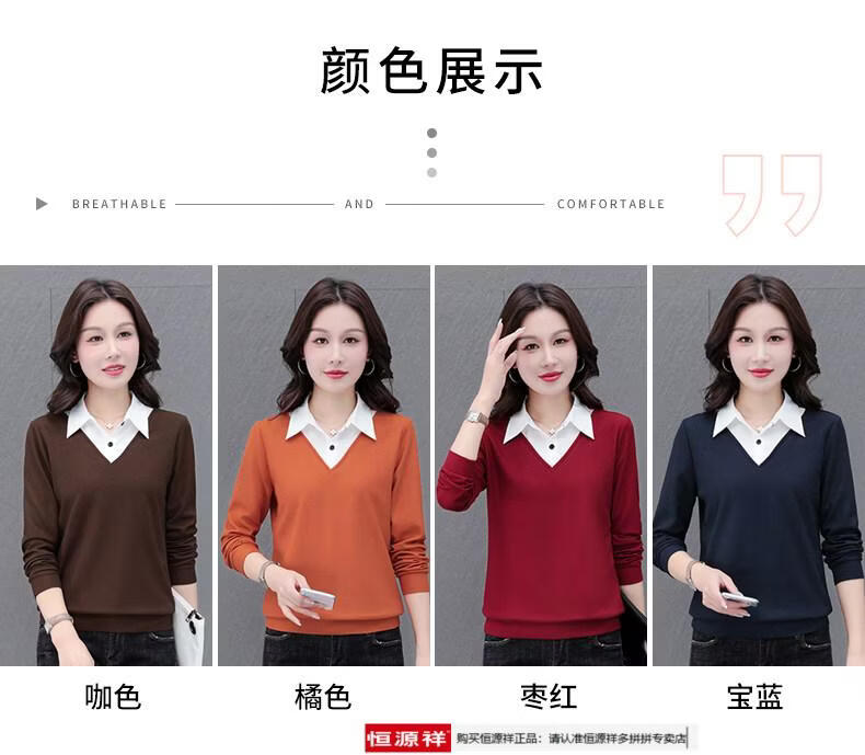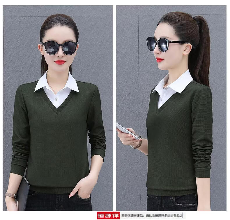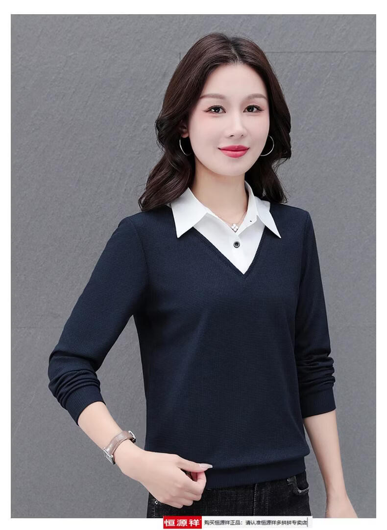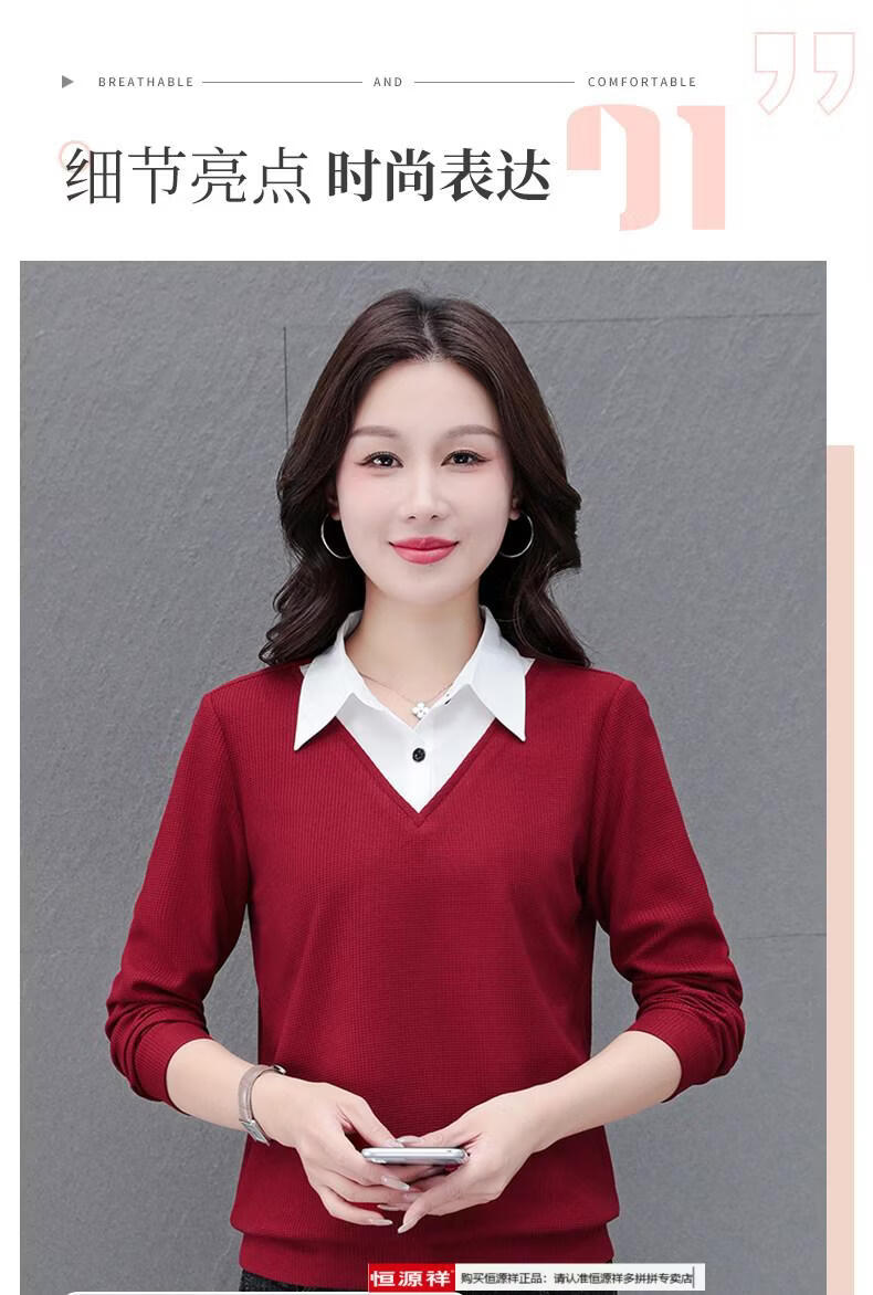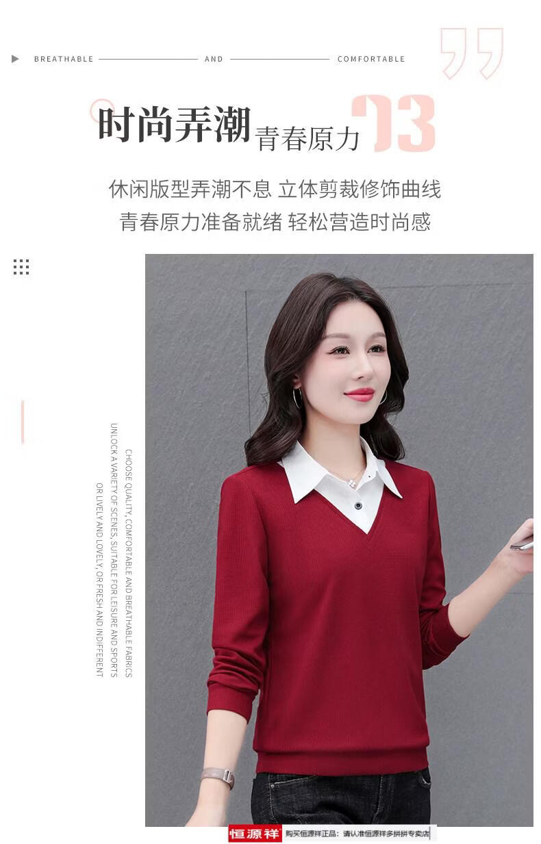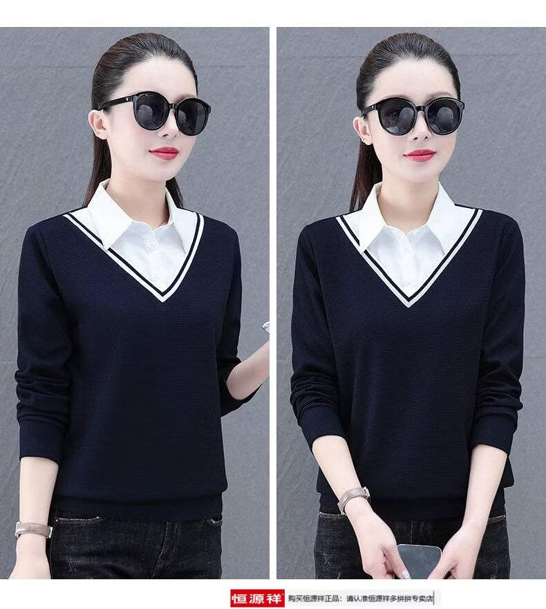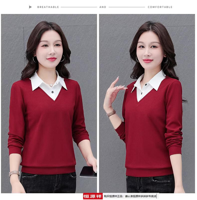 Hengyuan Xiang fake two-piece shirt women's long-sleeved spring and autumn new style middle-aged mother's shirt Western style versatile sweatshirt bottoming plus velvet top AK27 coffee color M recommended 80-105Jin Jin equals 0.5 kg