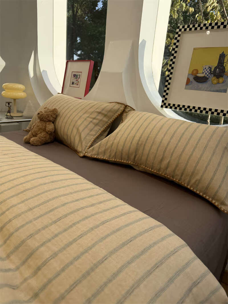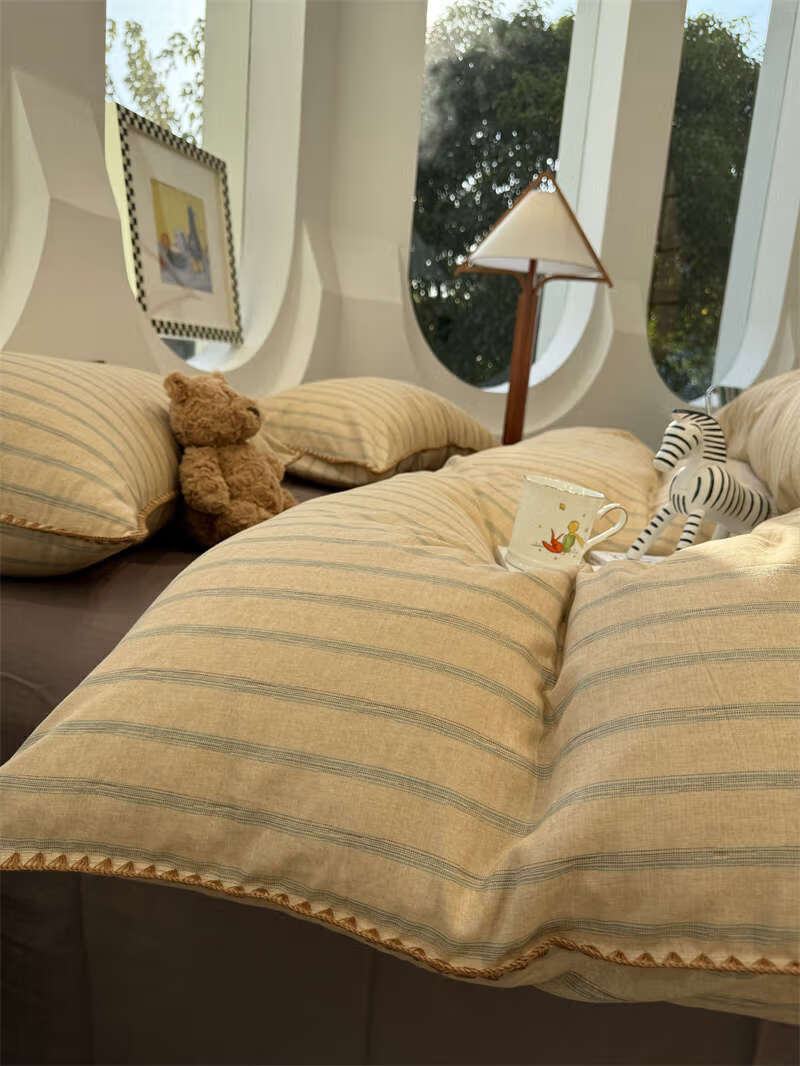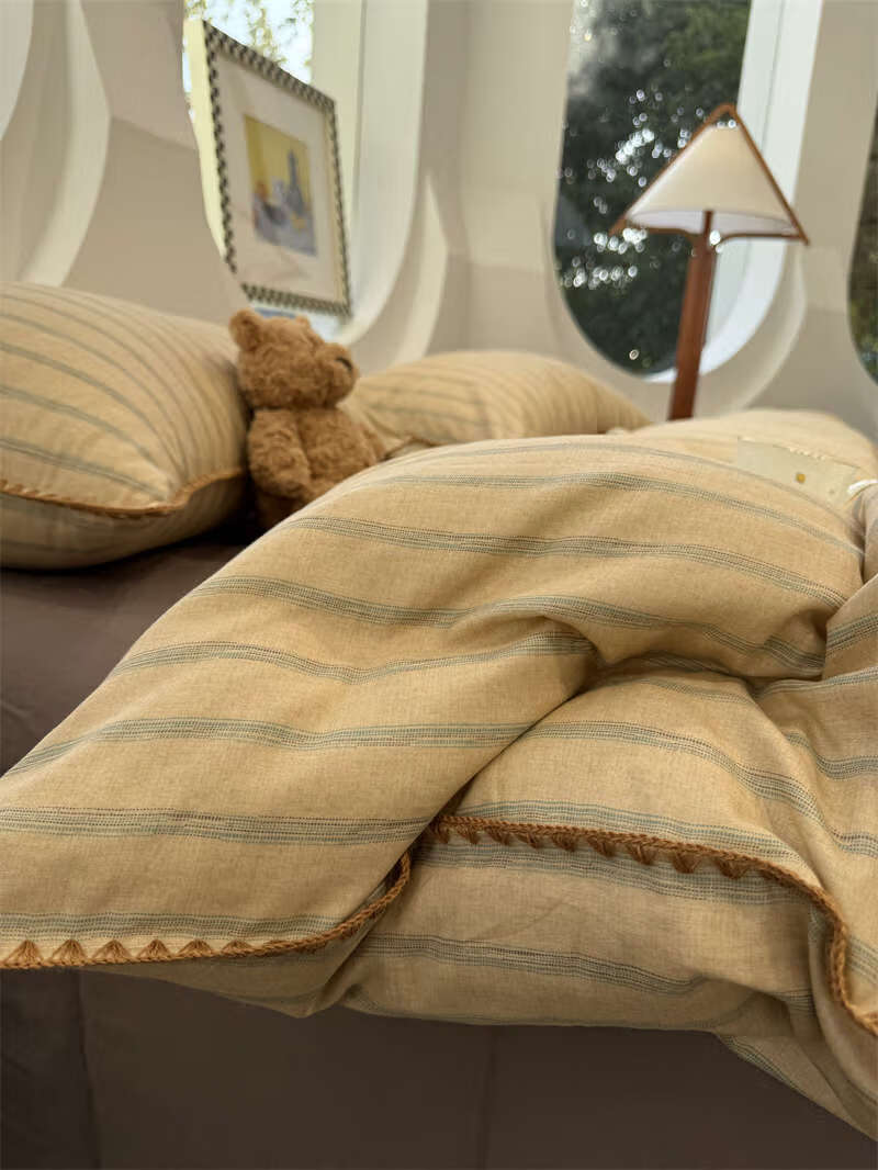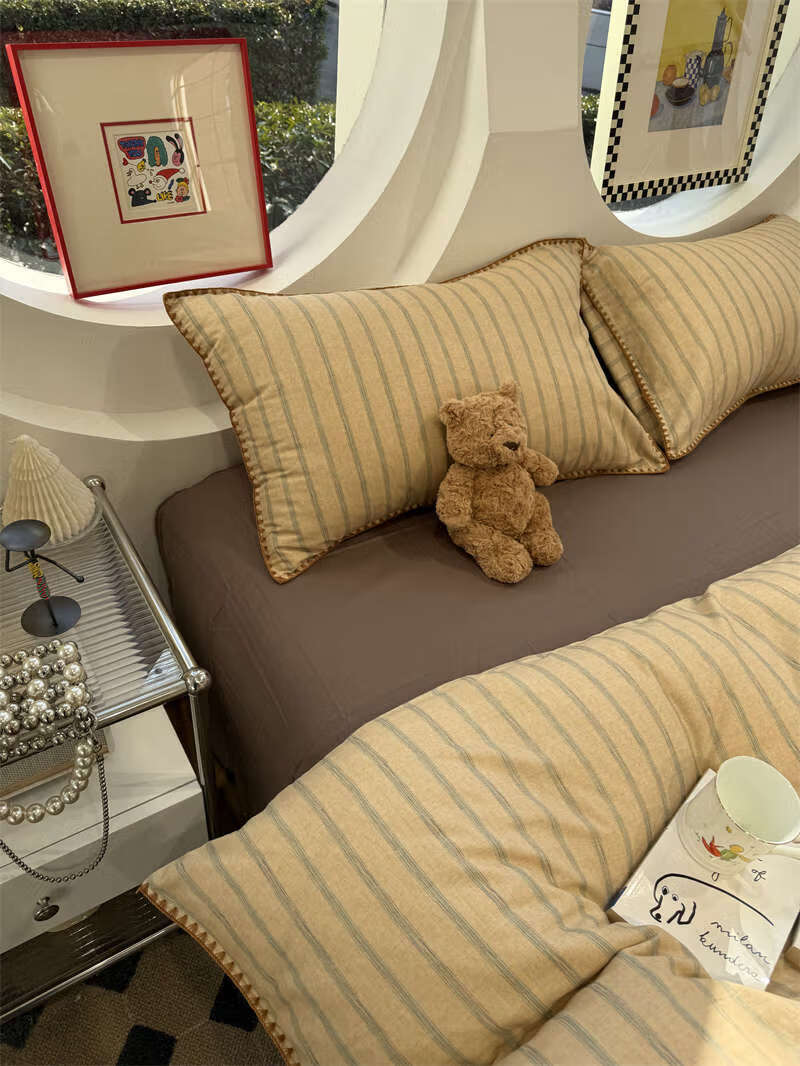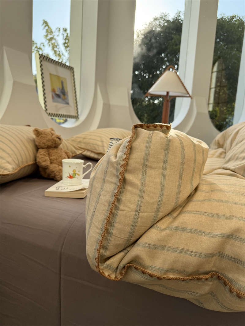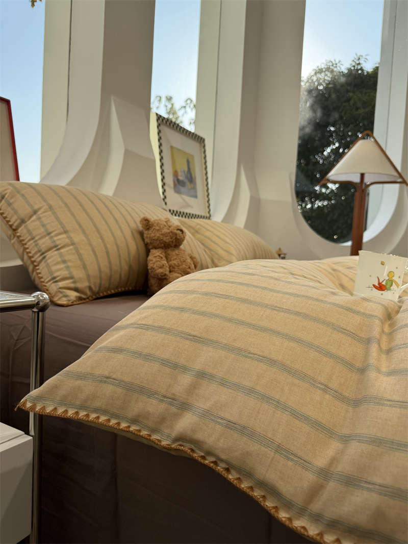 Yusenyi double-layer yarn elegant brown striped four-piece set 15m18m soft loose YAG double-layer yarn British gentleman bed sheet set bed sheet style 2.0m bed four-piece set/applicable 220x240cm