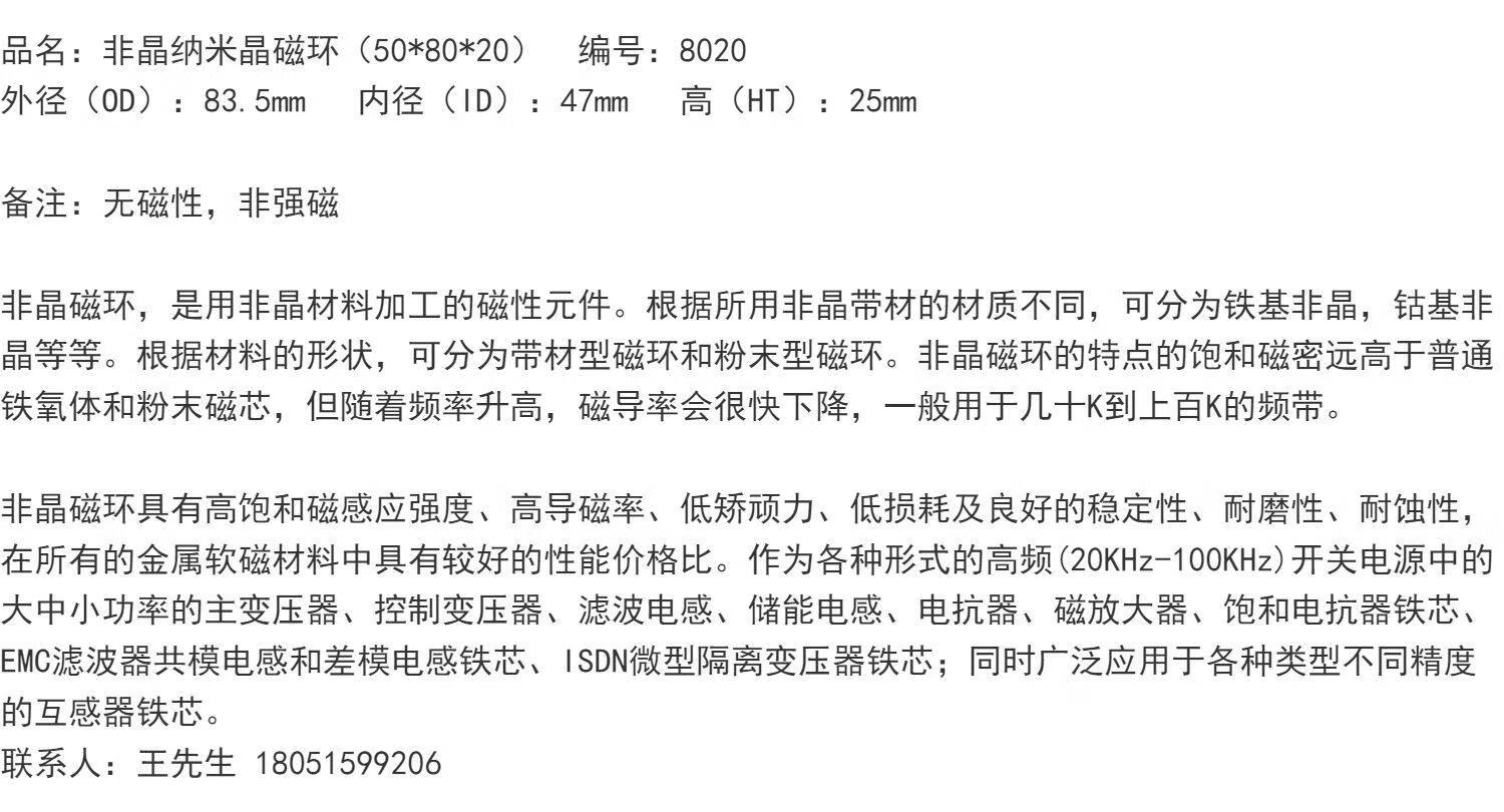 Nano amorphous 8020 high magnetic permeability ring high power transformer anti-interference filter inductor outer diameter 50*80*20mm