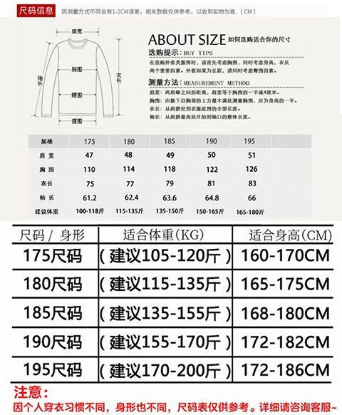 China (cm) 165 / 88-90 170 / 96-98 175 / 108-110 180 / 118-122 185 / 126-130