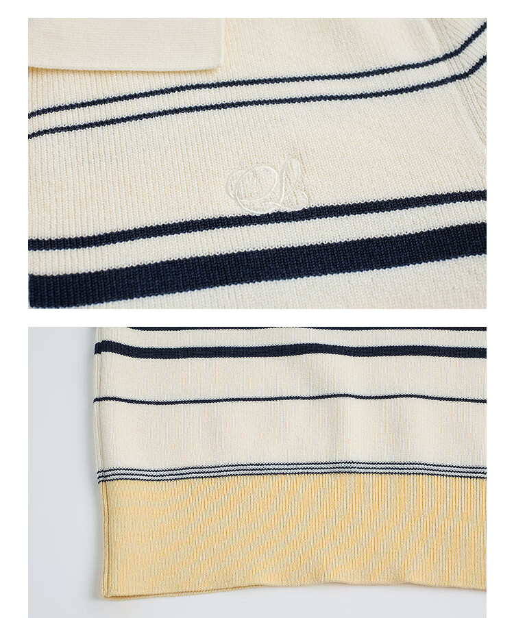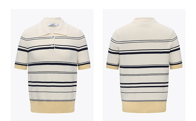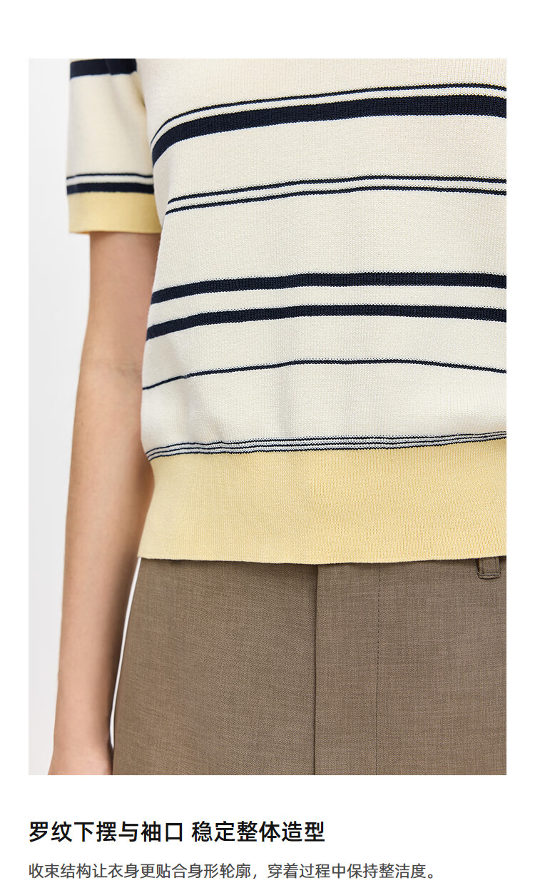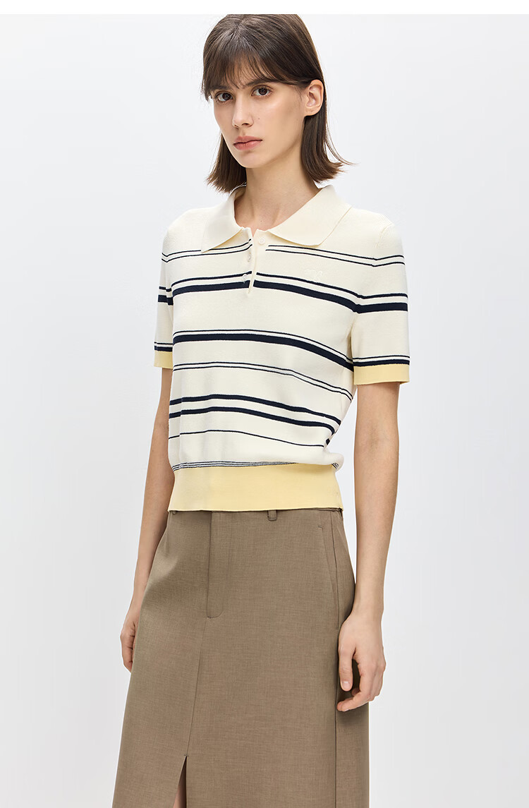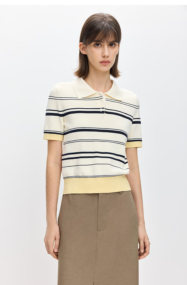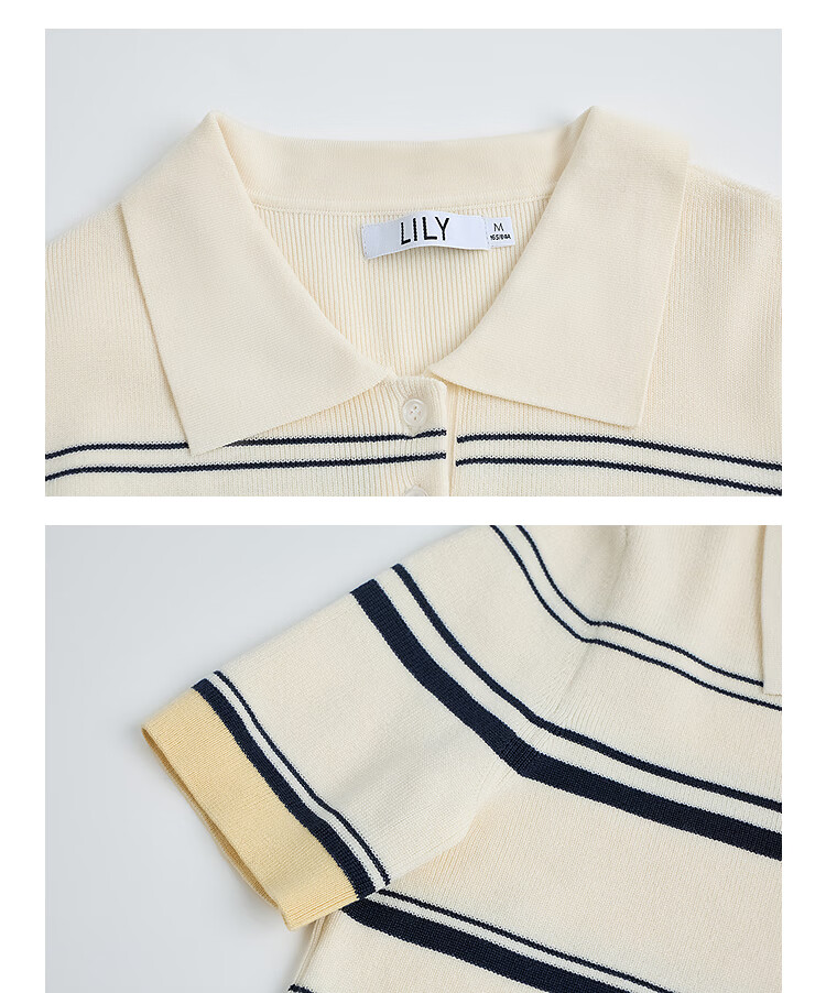 LILY2026 Spring New Fashionable Simple POLO Collar Contrast Color Stripes Casual Commuting Short-Sleeved Knitted Sweater Women's 703 Beige M