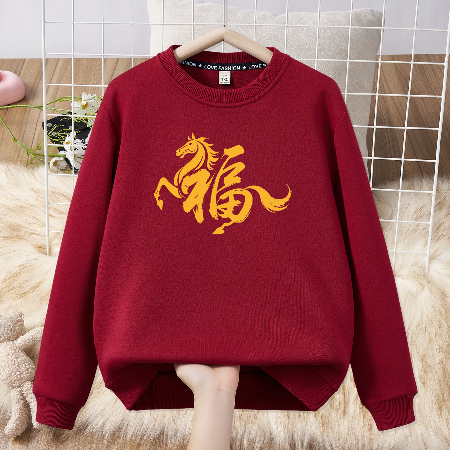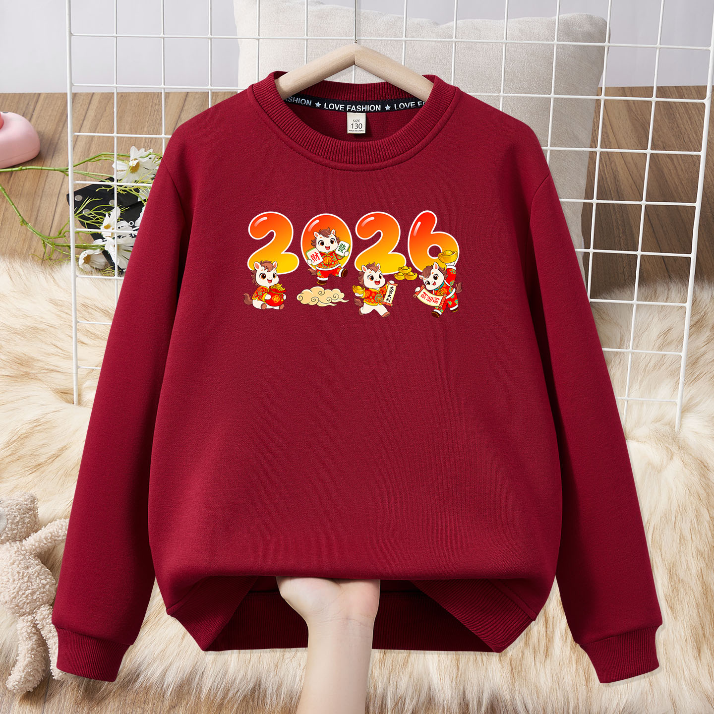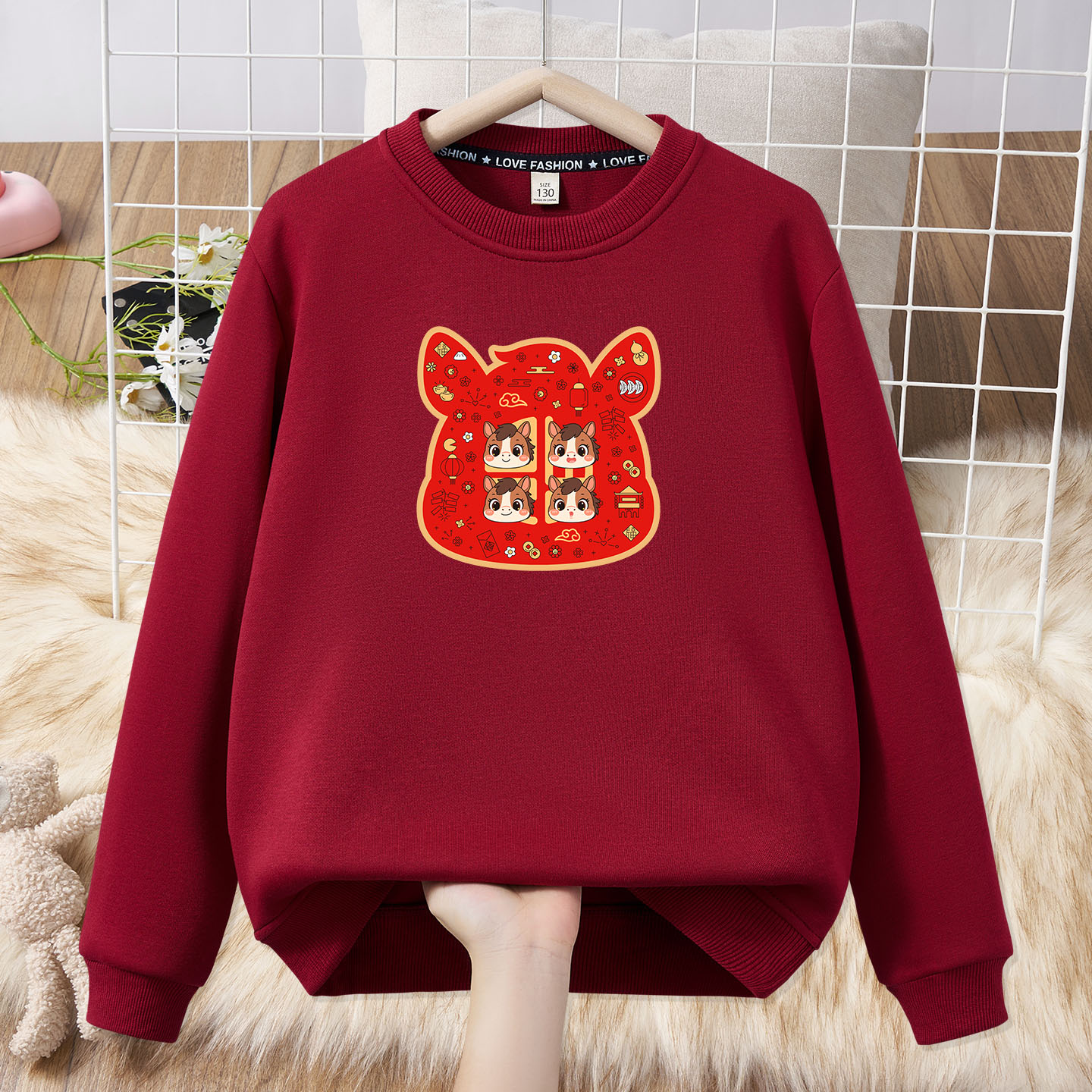 Festive parent-child outfit for a family of three and four, family outfit plus velvet sweatshirt 2026 Year of the Horse New Year burgundy top sweatshirt red silver fox velvet Fuma 185 (L)