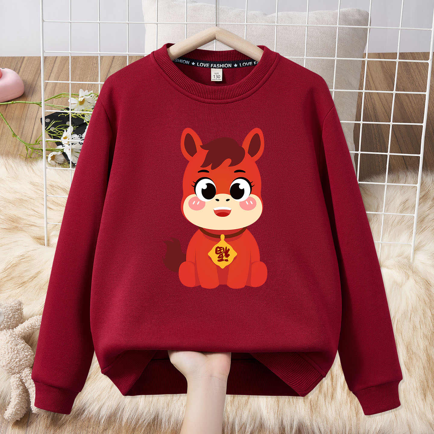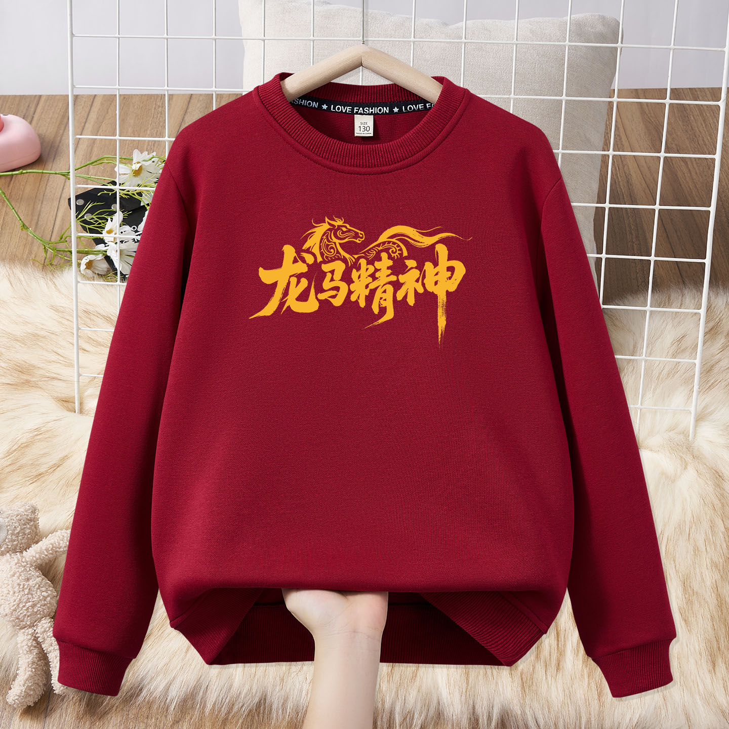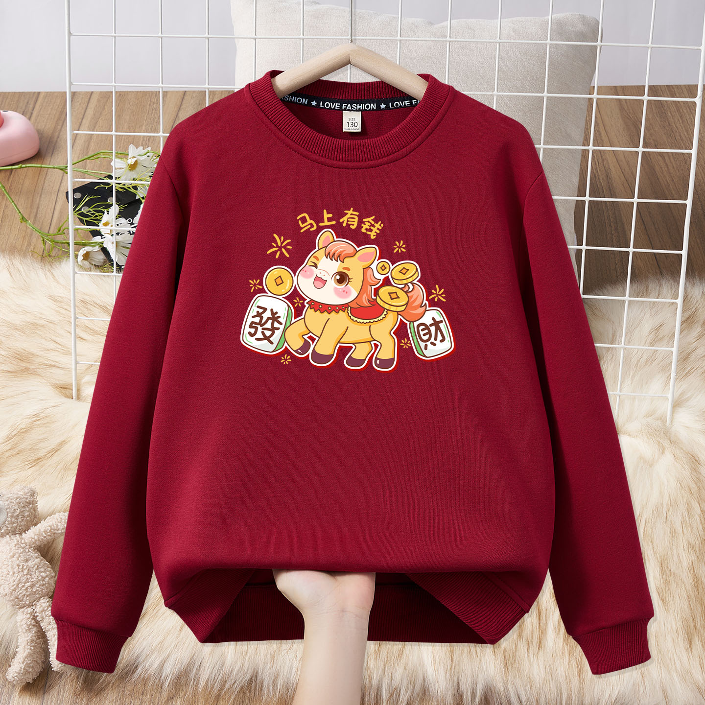 Festive parent-child outfit for a family of three and four, family outfit plus velvet sweatshirt 2026 Year of the Horse New Year burgundy top sweatshirt red silver fox velvet Fuma 185 (L)