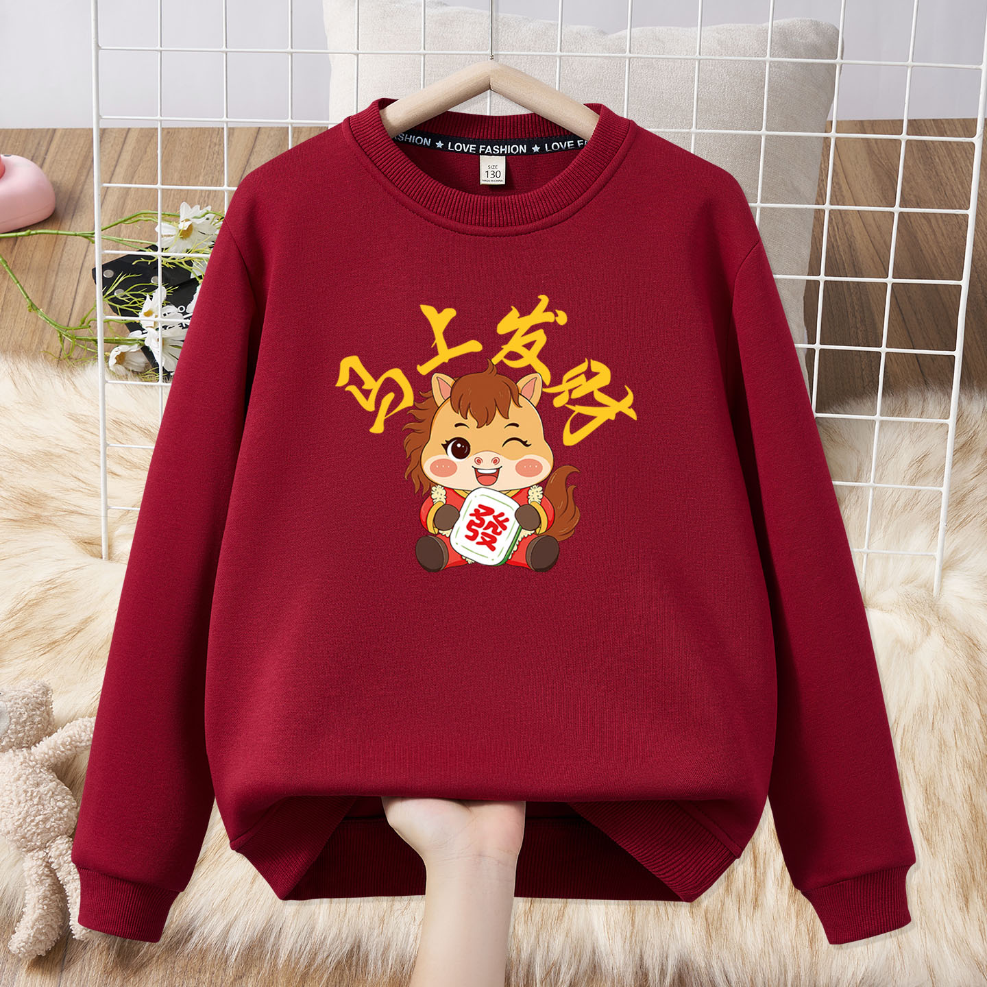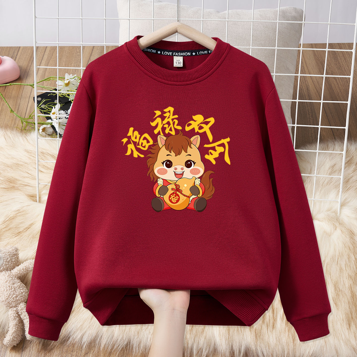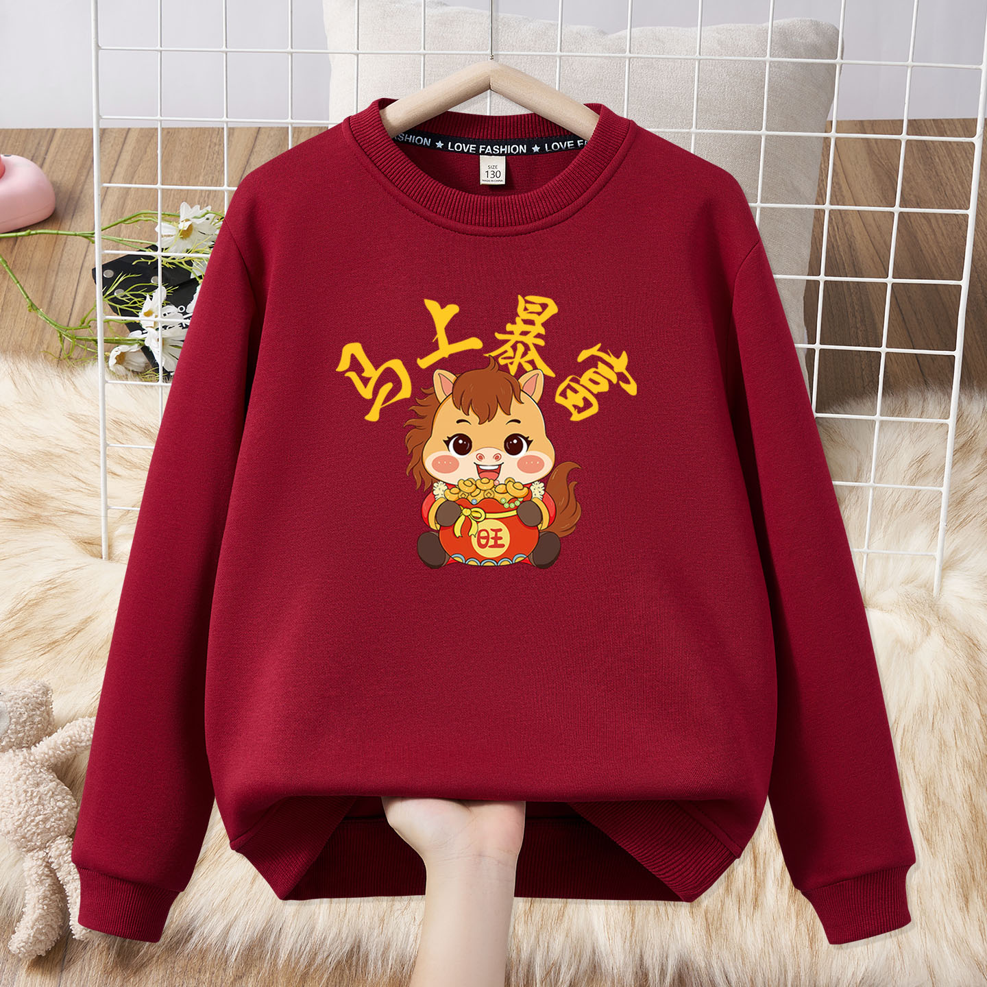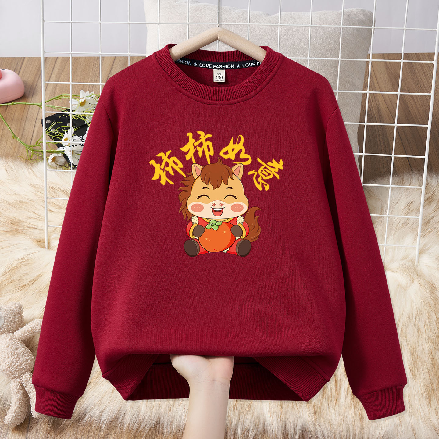 Cute horse + character parent-child outfit for a family of three or four, plus velvet sweatshirt 2026 Horse New Year burgundy sweatshirt red silver fox velvet cute horse-Shishi Ruyi 200 (3XL)