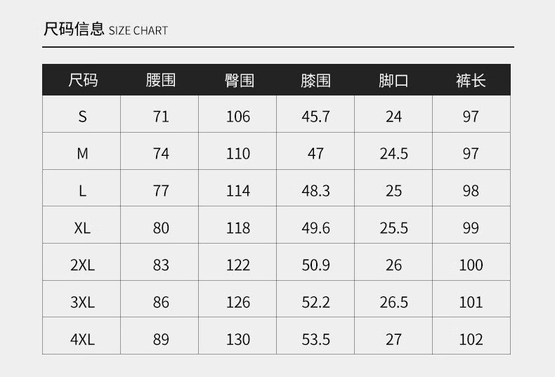 Outseam (cm) 99 cm 101.5 cm 104 cm 106.5 cm 109 cm
