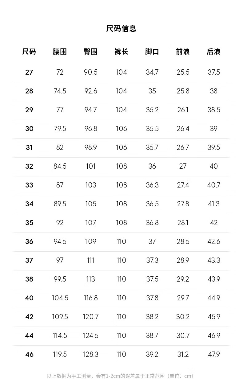 Outseam (cm) 99 cm 101.5 cm 104 cm 106.5 cm 109 cm