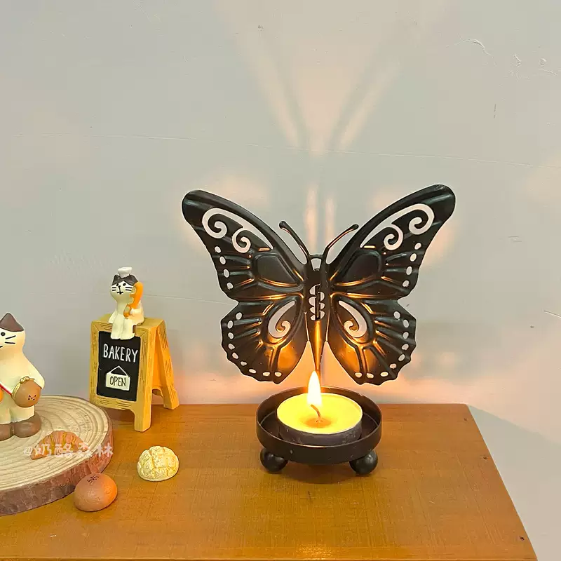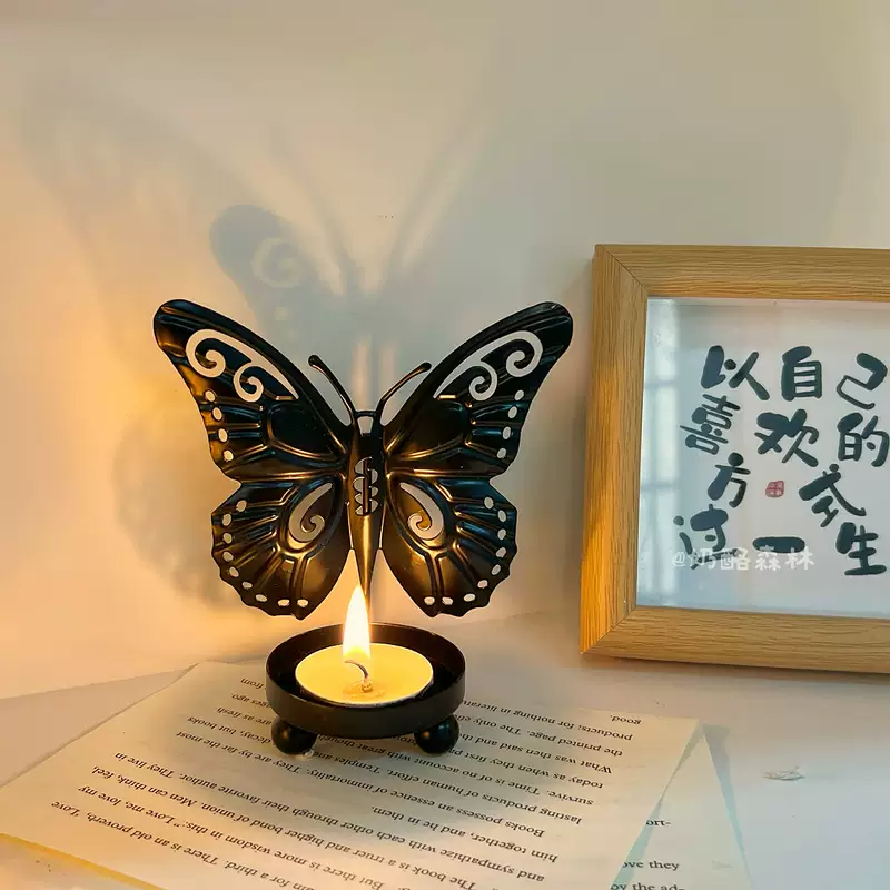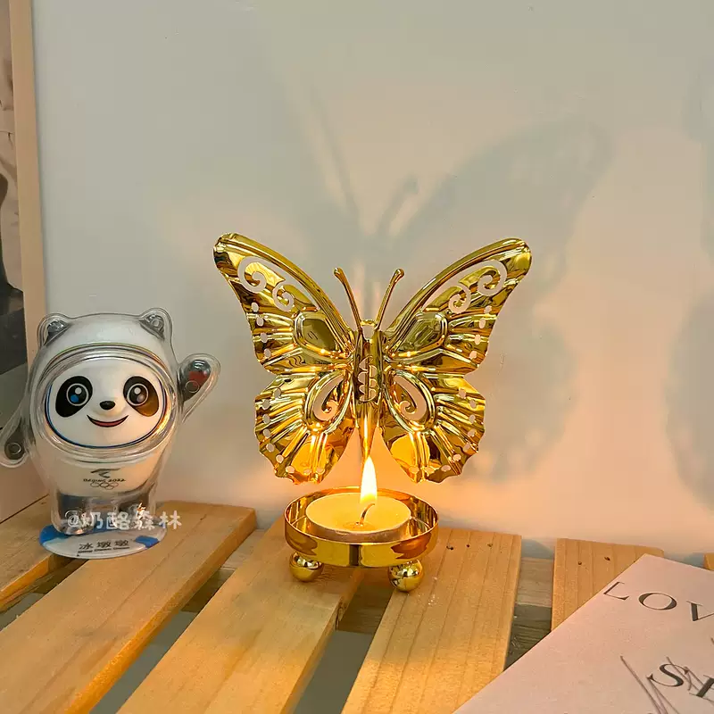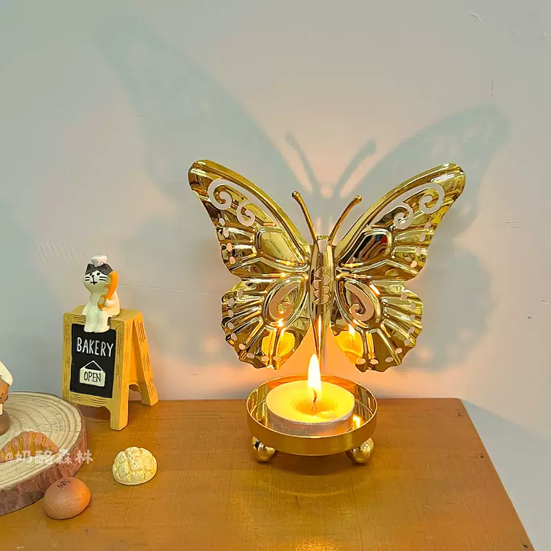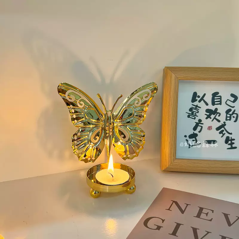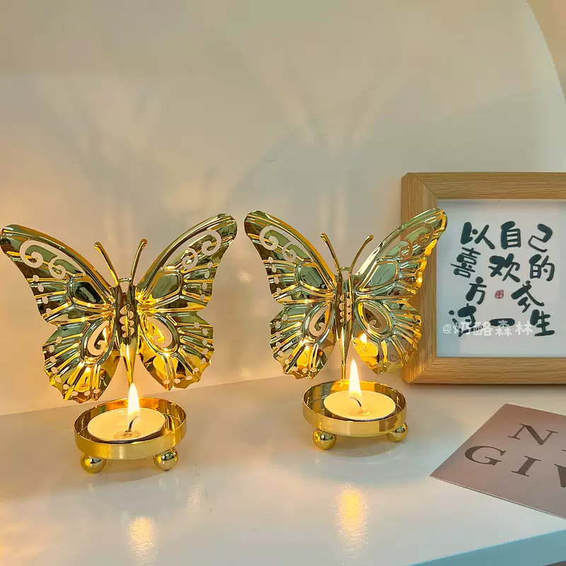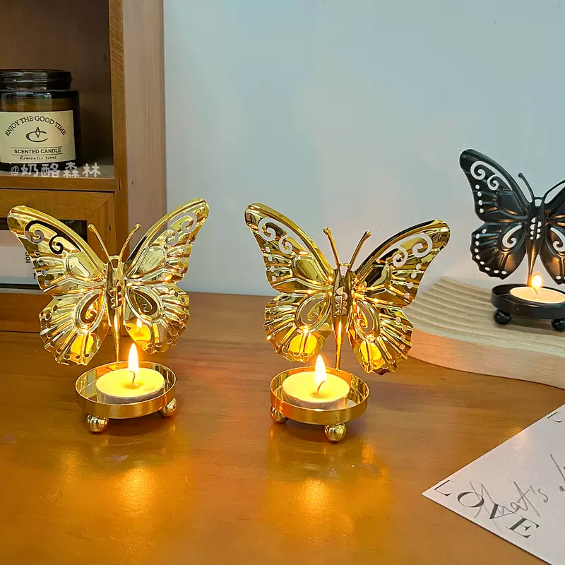 Yusenyi European style iron ancient luxury covered butterfly candlestick ornaments art line light iron line desktop creative niche atmosphere birthday suit 2 golden butterflies (free candles)