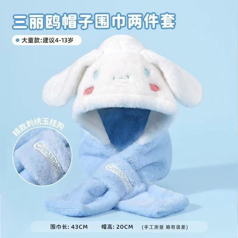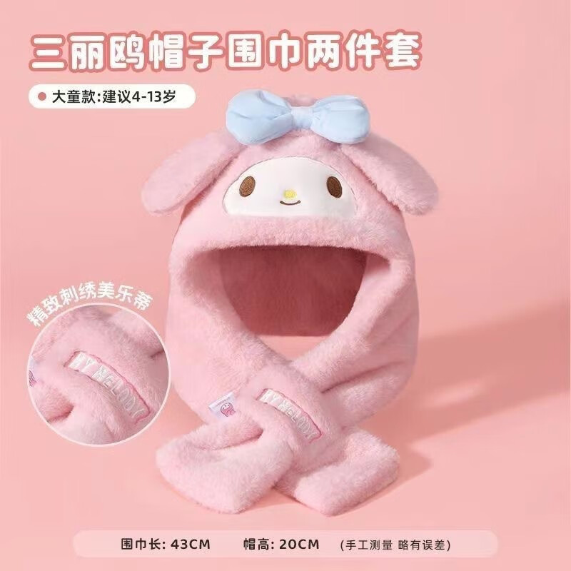 Disney Sanrio Kurome Children's Hat Girls Scarf Integrated Neck Protector Hat Autumn and Winter Warm and Cold Protection Girls Plush Hat 4-13 Years Old Cartoon Two-piece Set Kurome