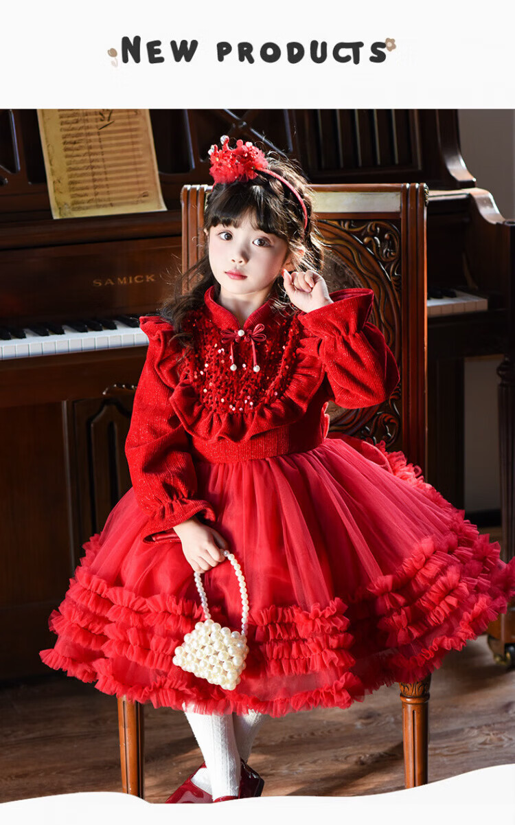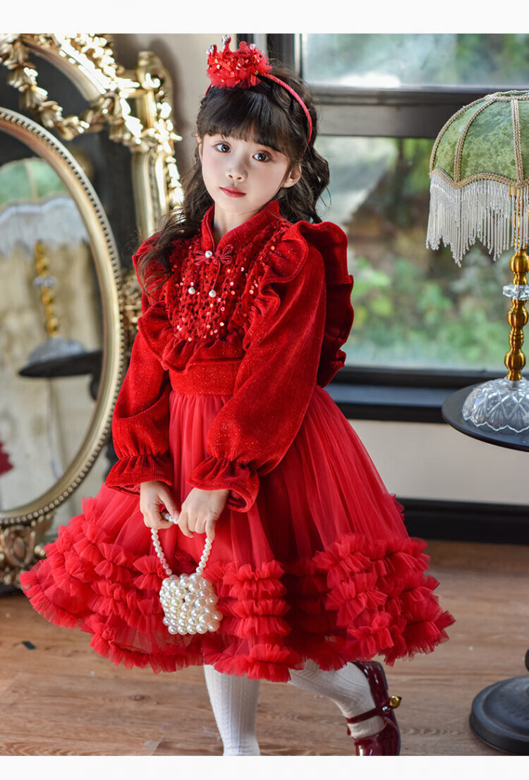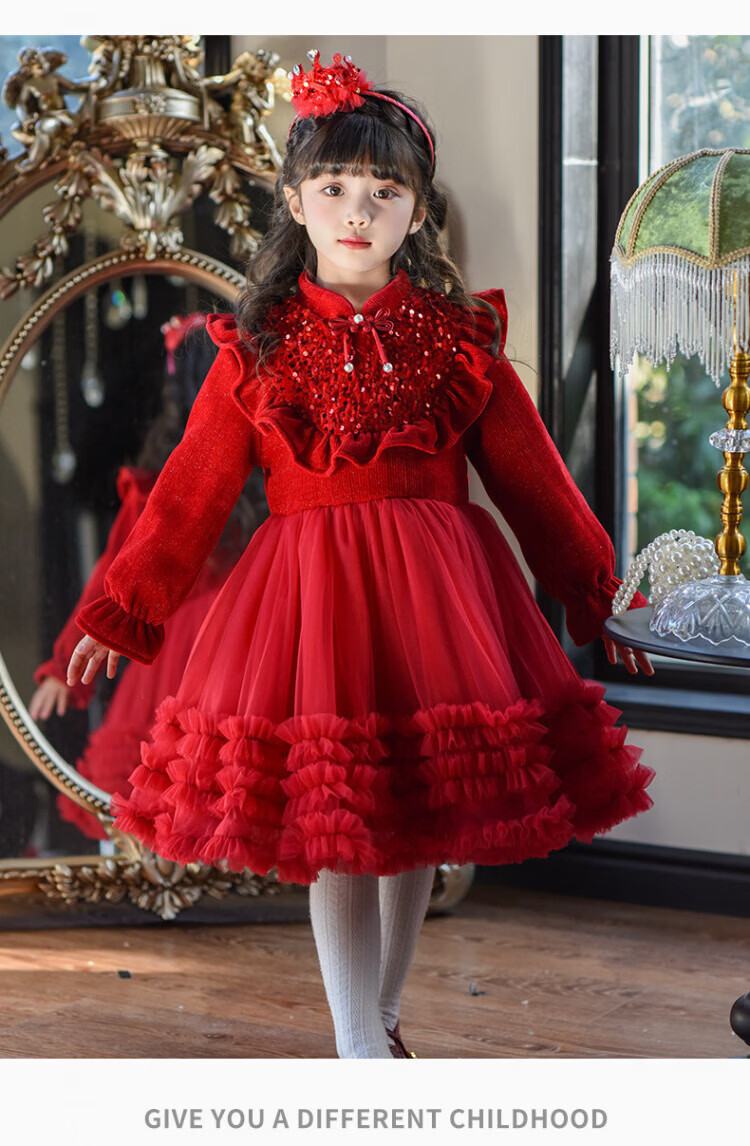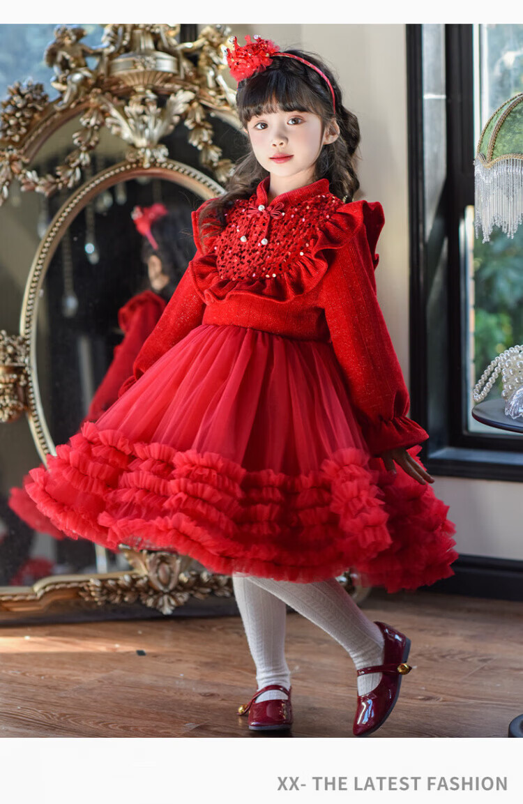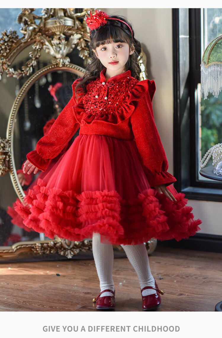HAL.DUCK Girls' Velvet Princess Dress Winter Clothes 2025 New Children's Red New Year's Dress Girls' Mesh Puff Skirt Red 100 cm