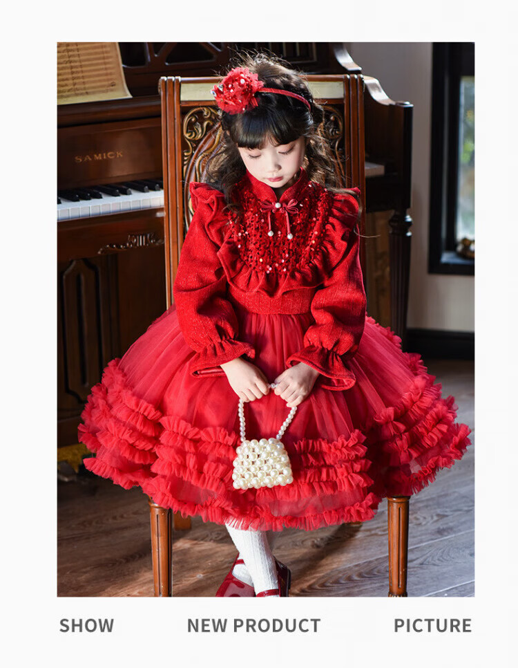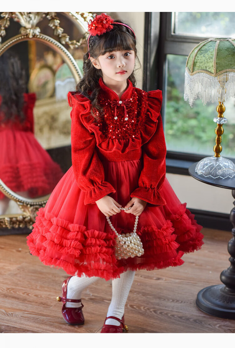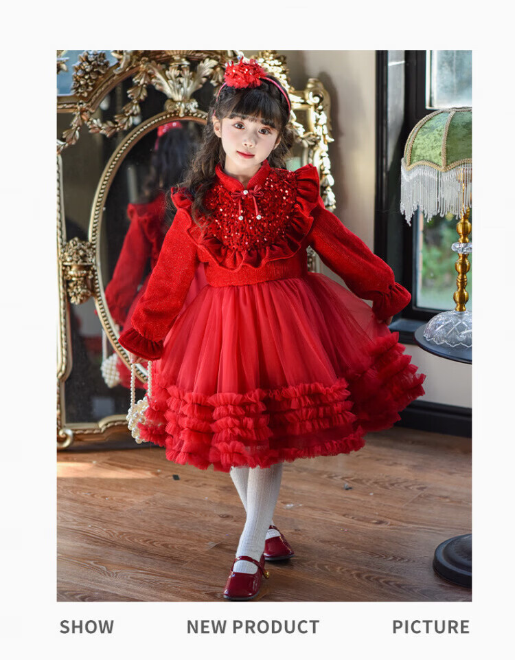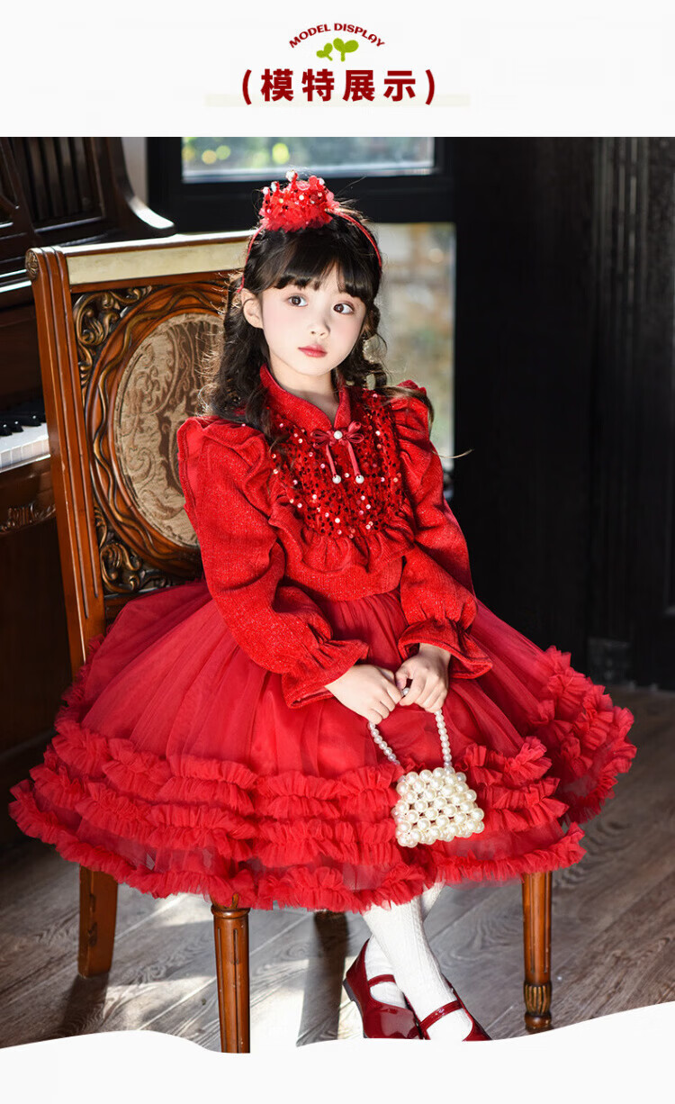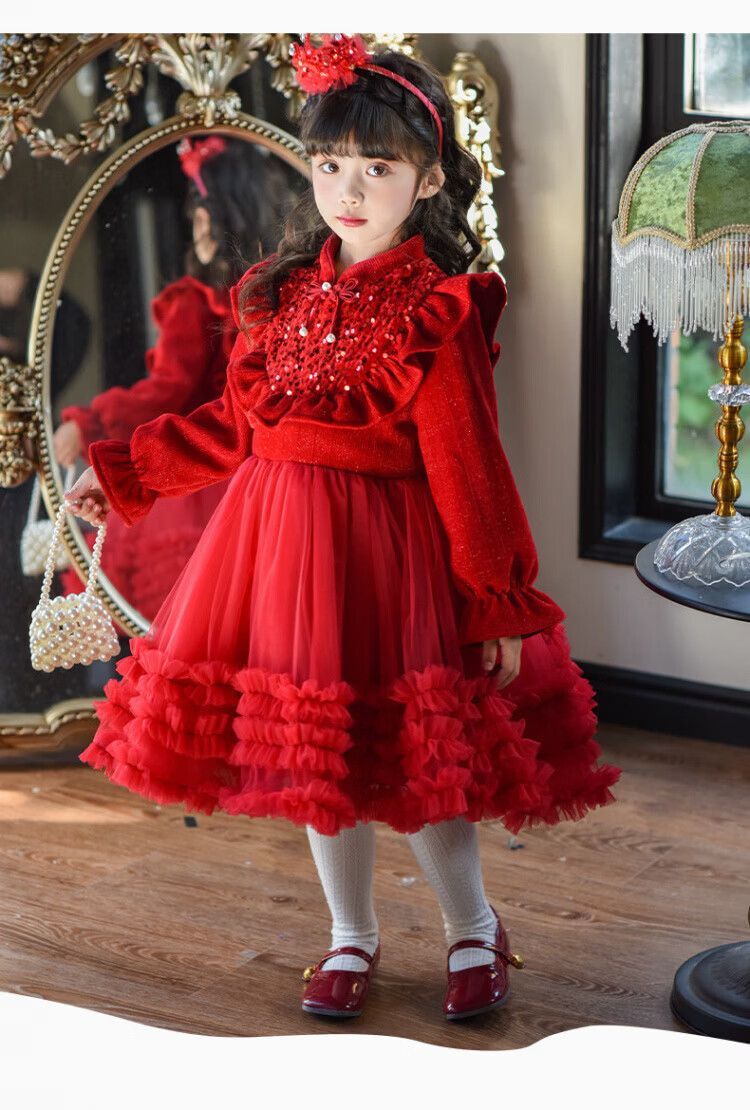 HAL.DUCK Girls' Velvet Princess Dress Winter Clothes 2025 New Children's Red New Year's Dress Girls' Mesh Puff Skirt Red 100 cm