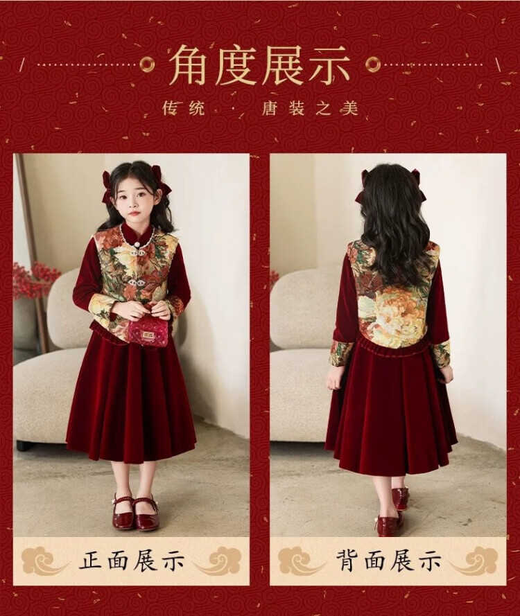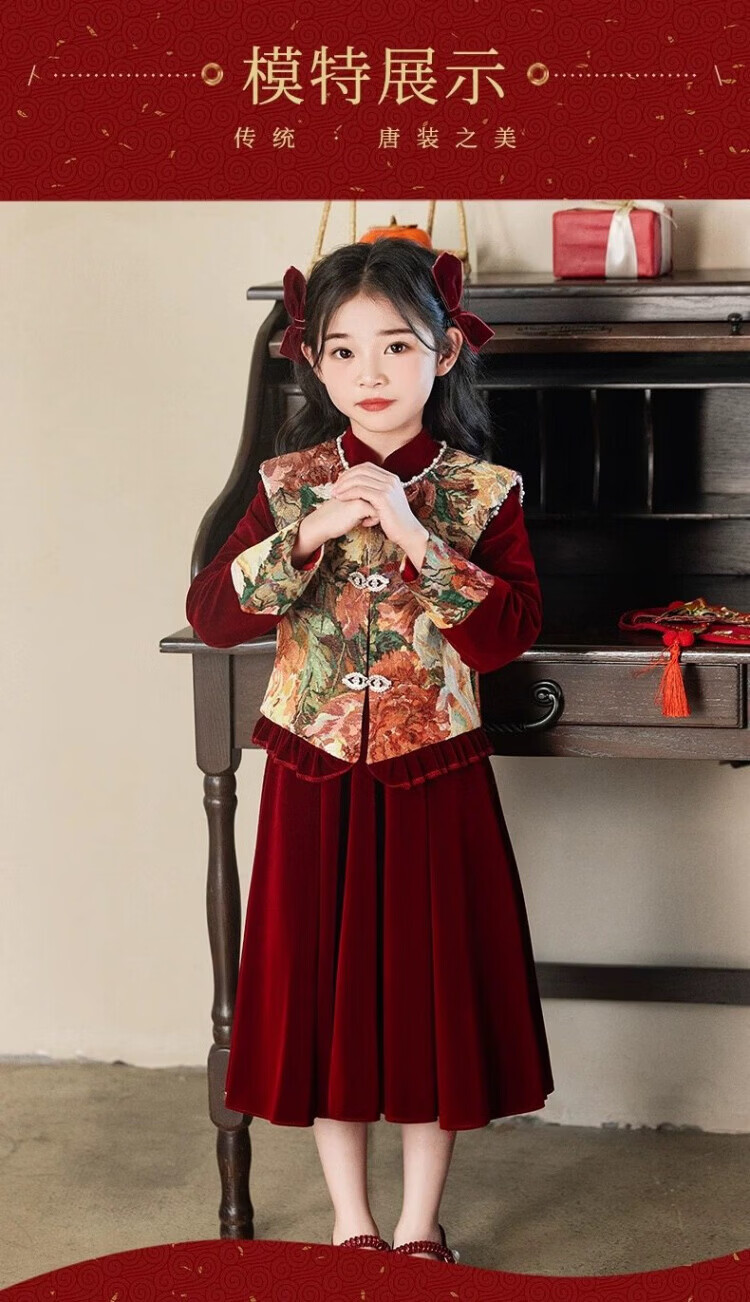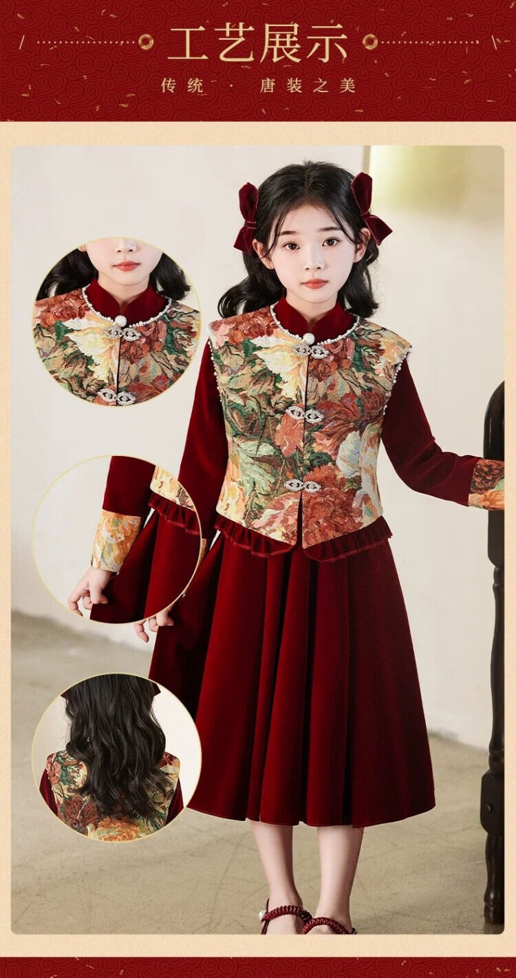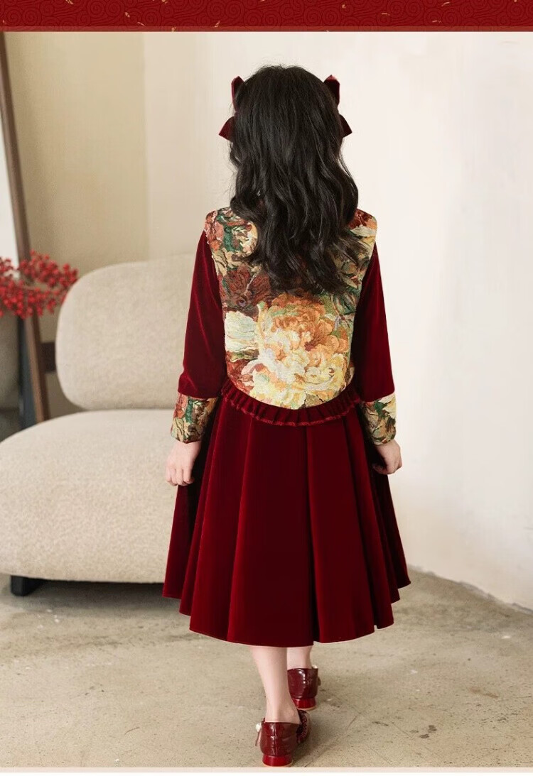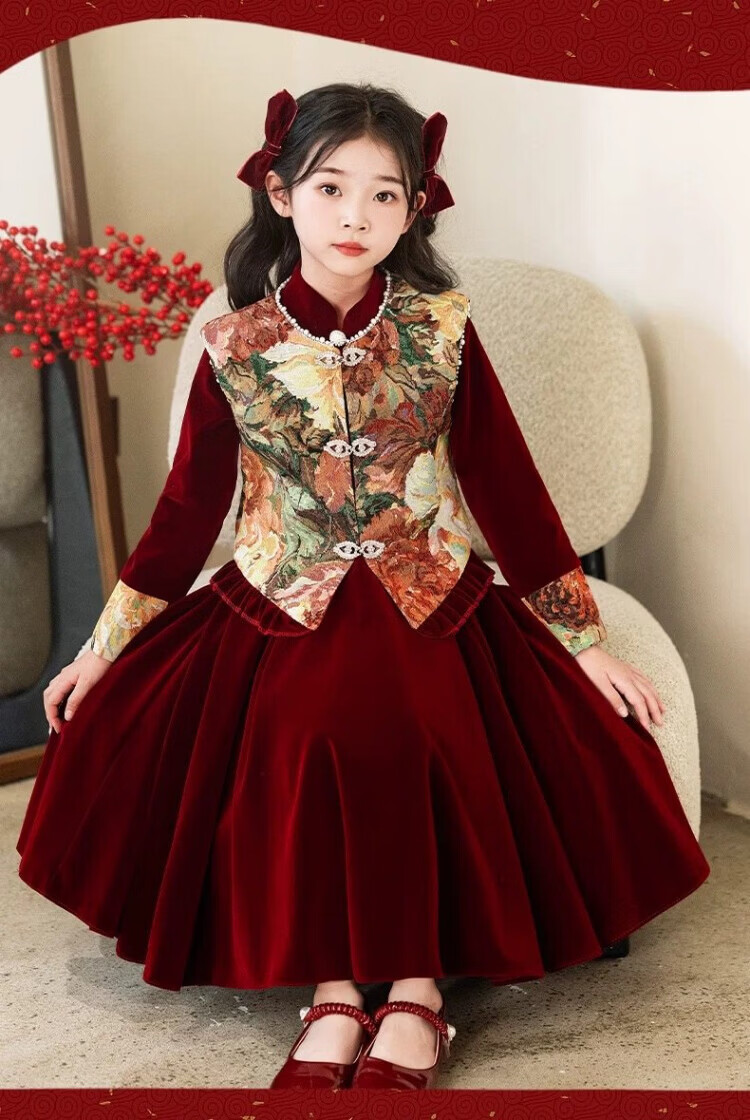 HAL.DUCK Girls Red New Chinese Dress New Year's Clothes Autumn and Winter Children's Girls Birthday Princess Dress Suits Performance Costumes 120 Sizes (About 4-6 Years Old and Height Around 113cm) One-size-fits-all Vest and Velvet Skirt Suit