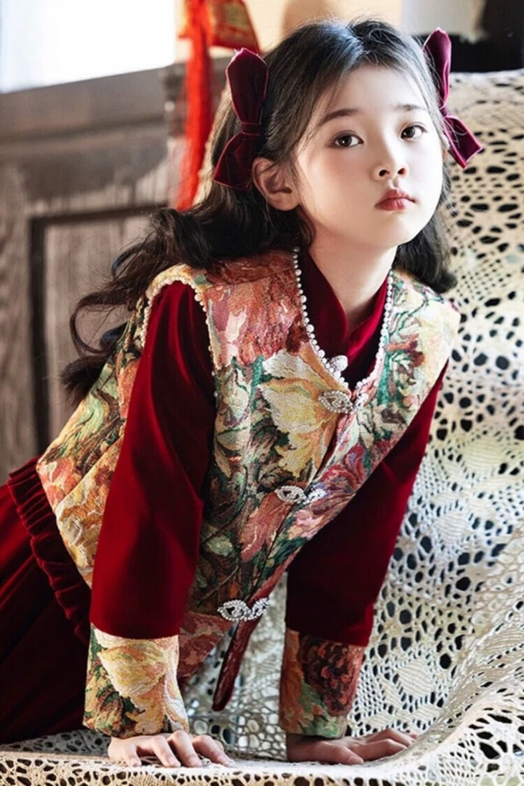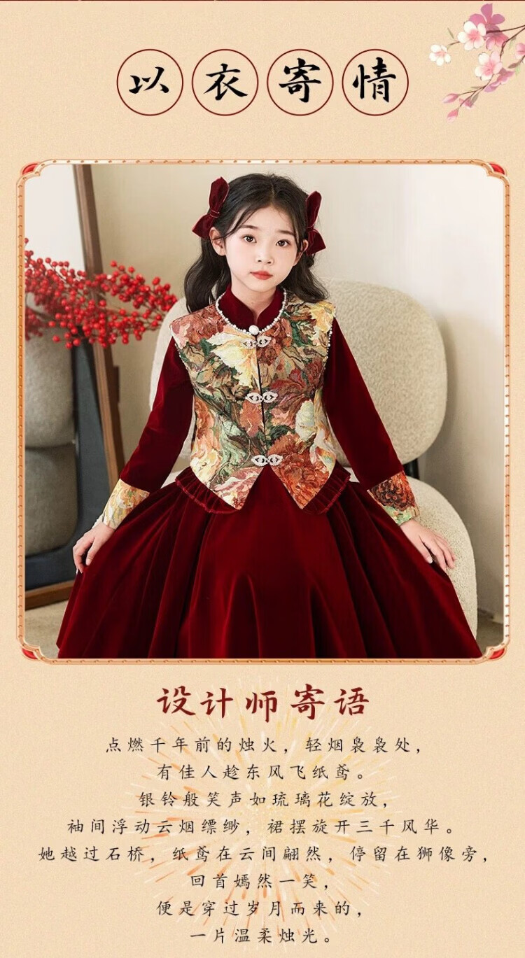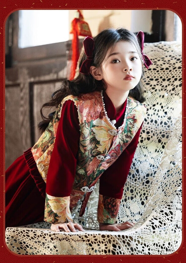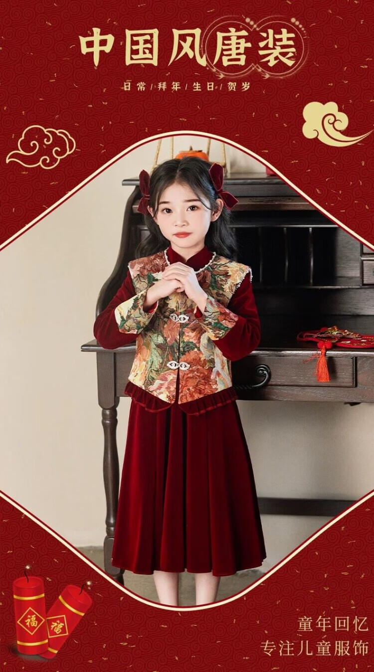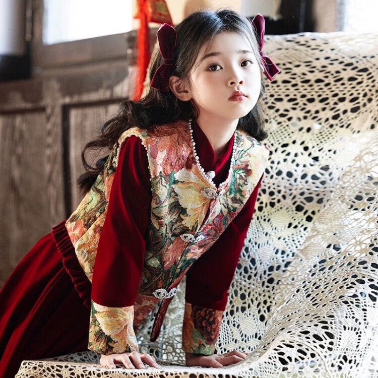HAL.DUCK Girls Red New Chinese Dress New Year's Clothes Autumn and Winter Children's Girls Birthday Princess Dress Suits Performance Costumes 120 Sizes (About 4-6 Years Old and Height Around 113cm) One-size-fits-all Vest and Velvet Skirt Suit