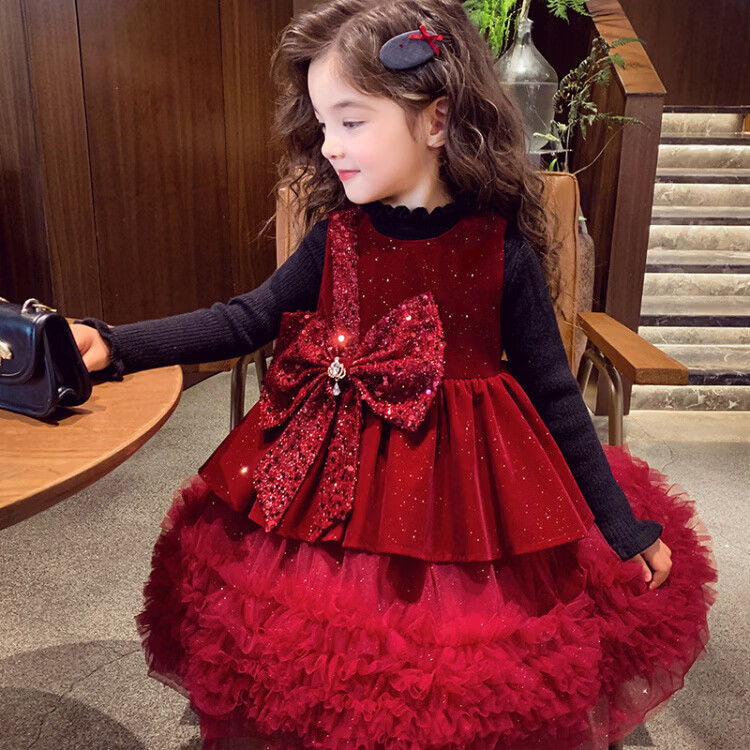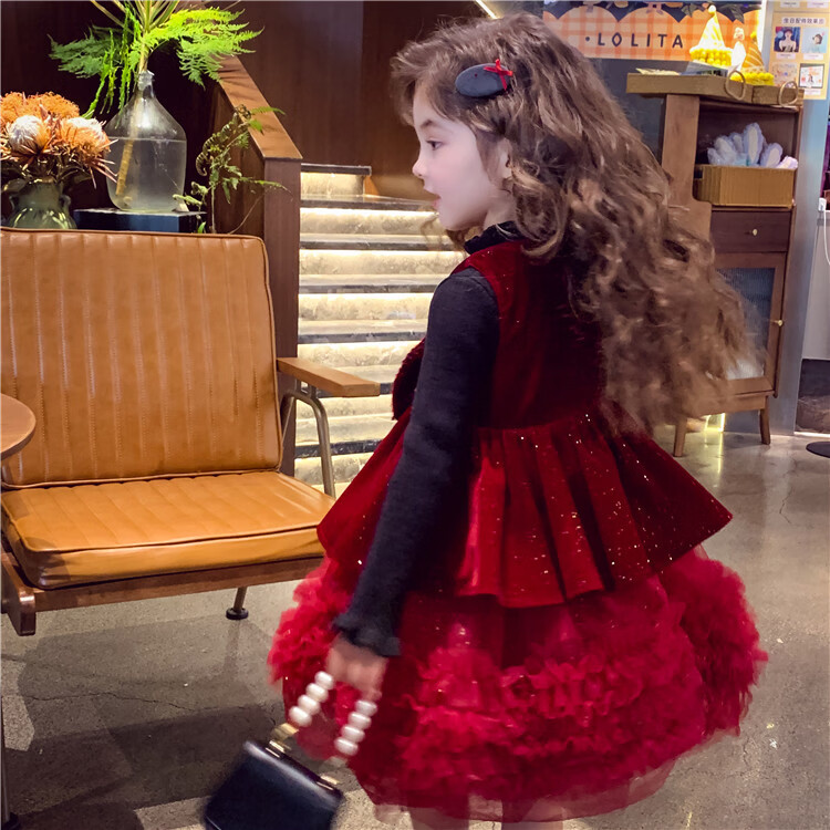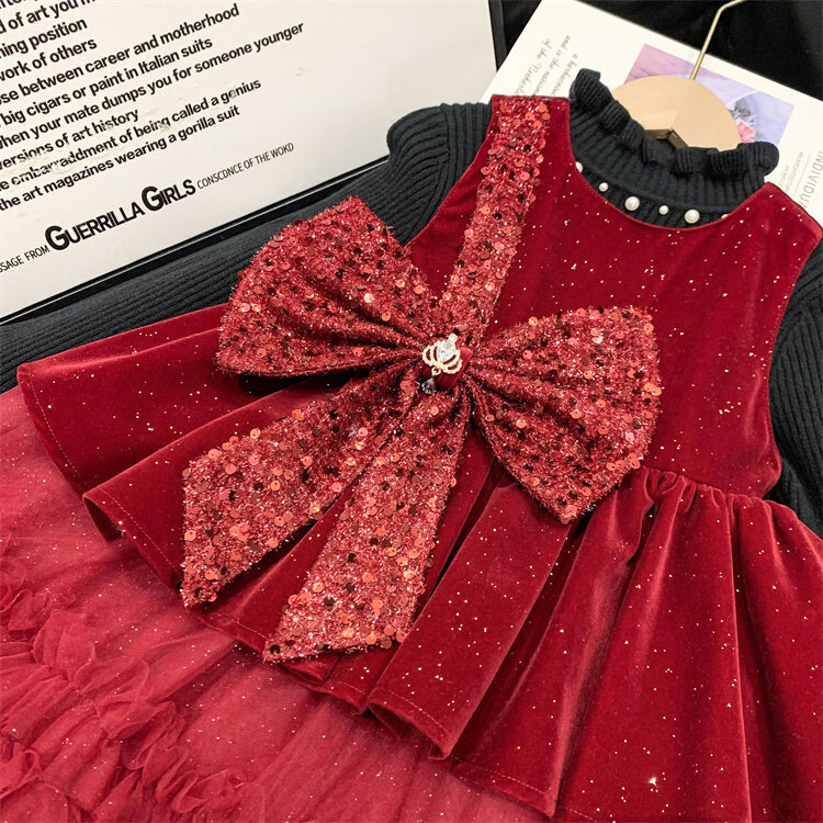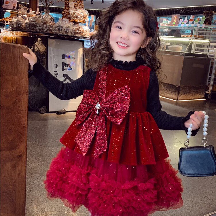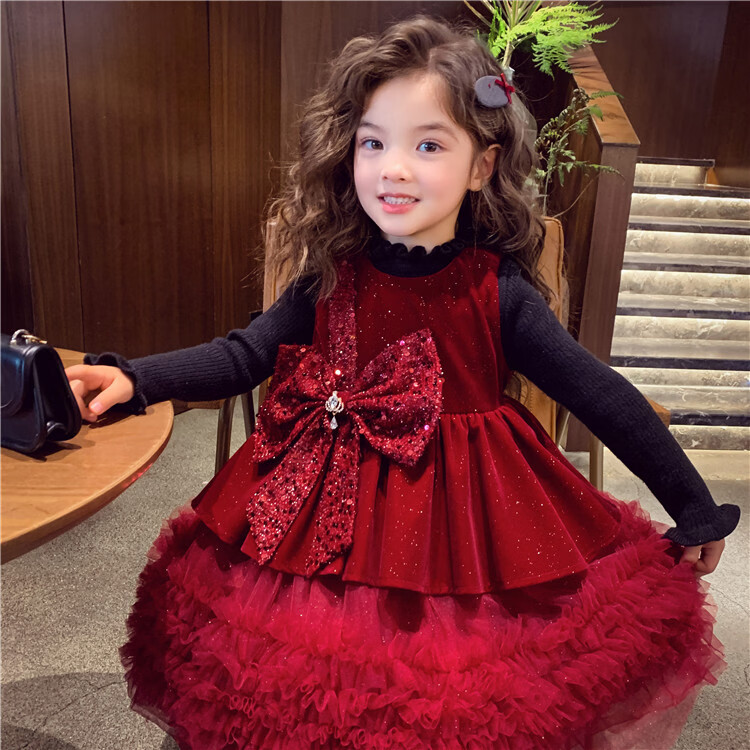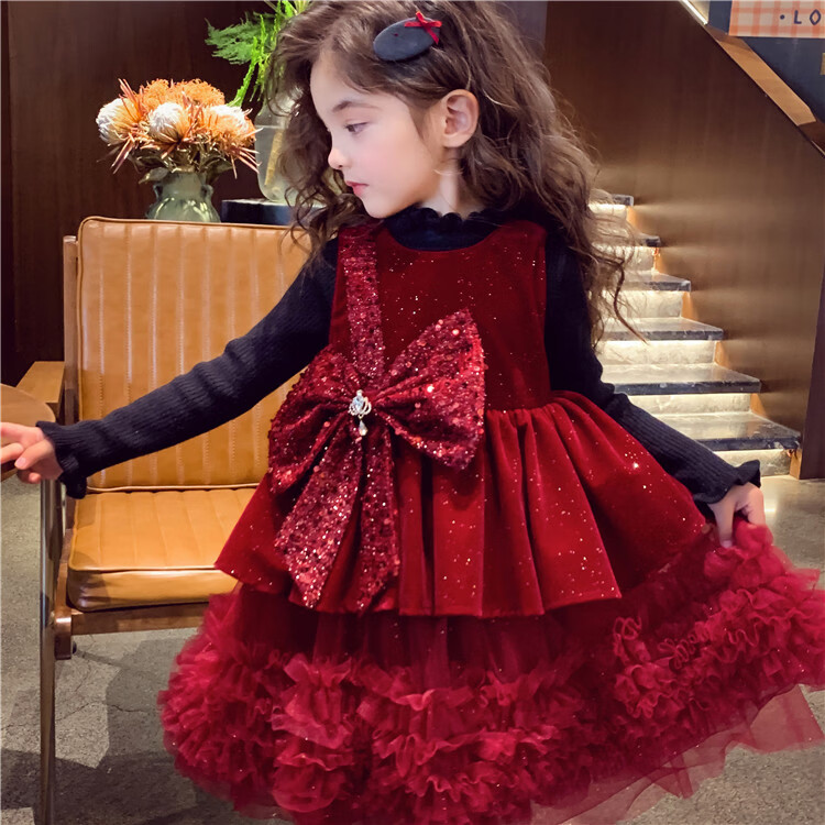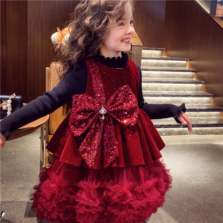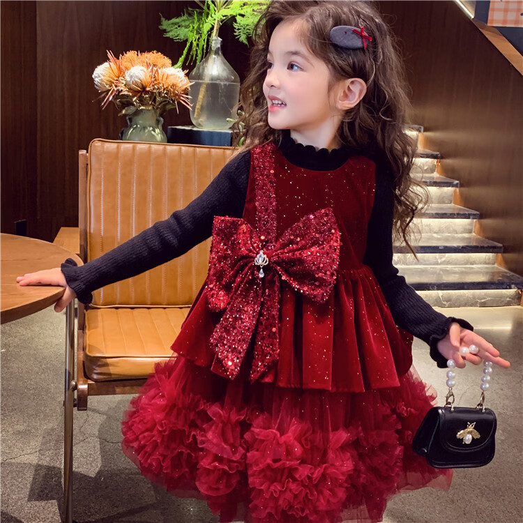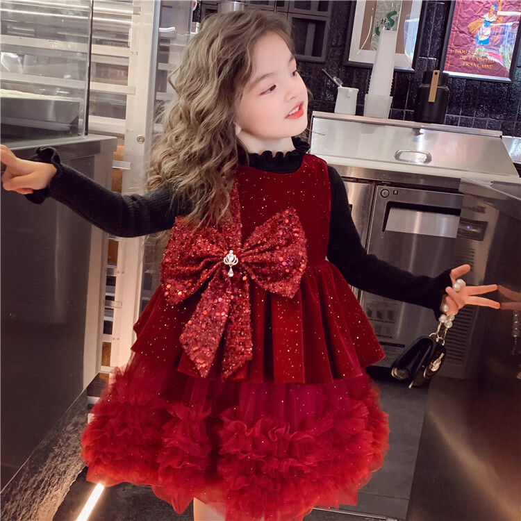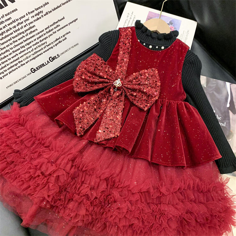 Disney Girls Princess Dress Winter Dress 2025 New Children's Mesh Tank Top Dress Little Girls Velvet Burgundy Suit Sweater + Tank Top 150 cm