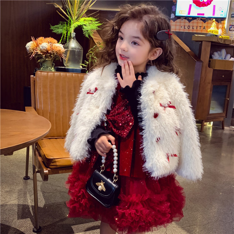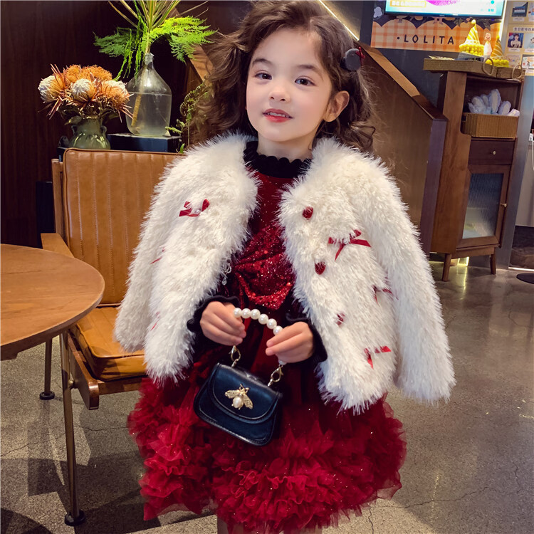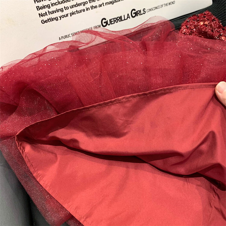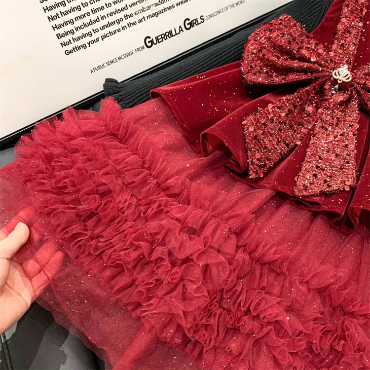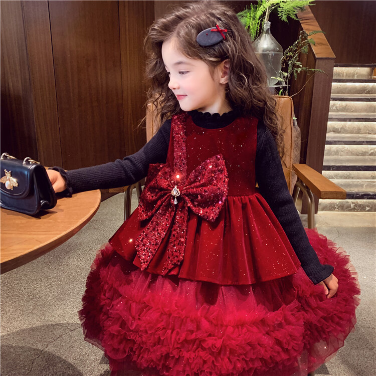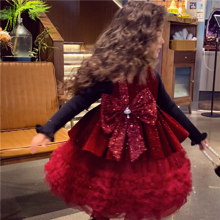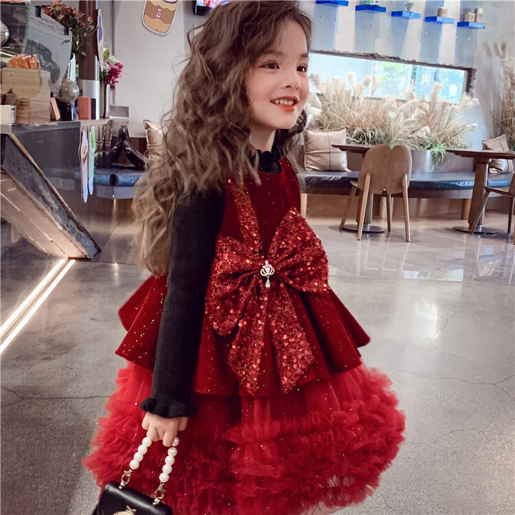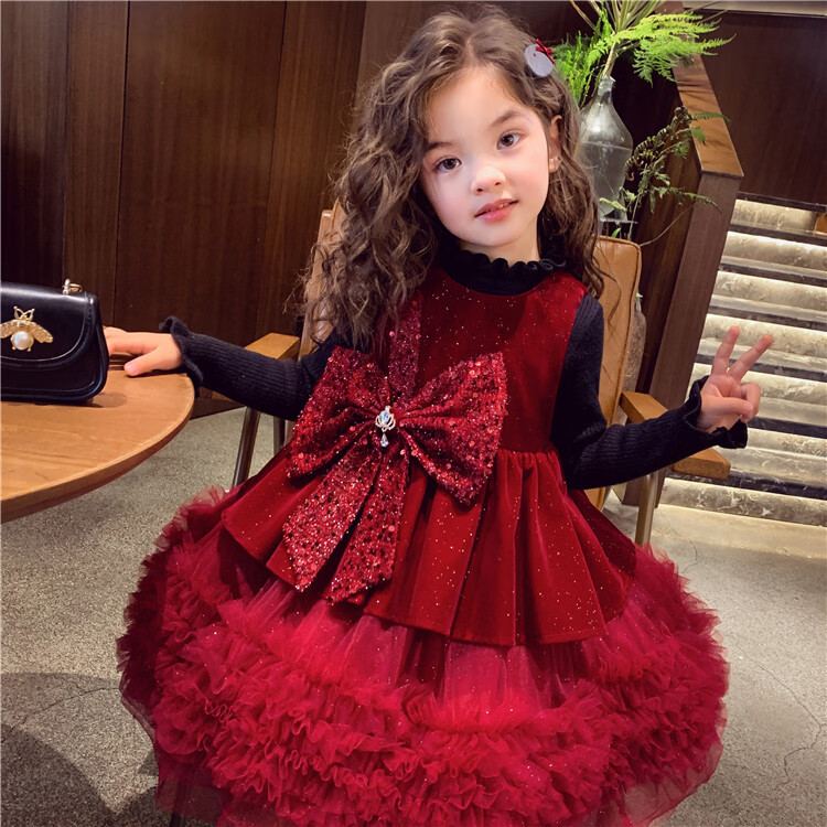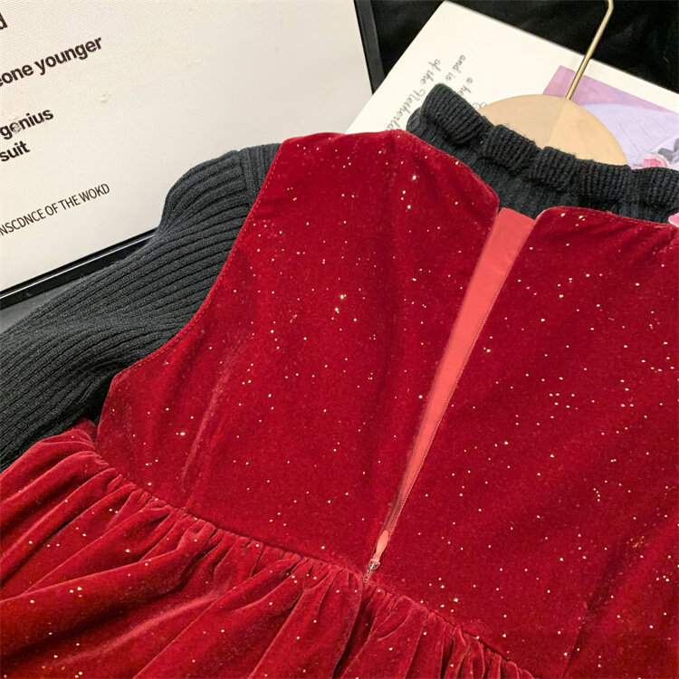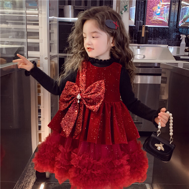 Disney Girls Princess Dress Winter Dress 2025 New Children's Mesh Tank Top Dress Little Girls Velvet Burgundy Suit Sweater + Tank Top 150 cm