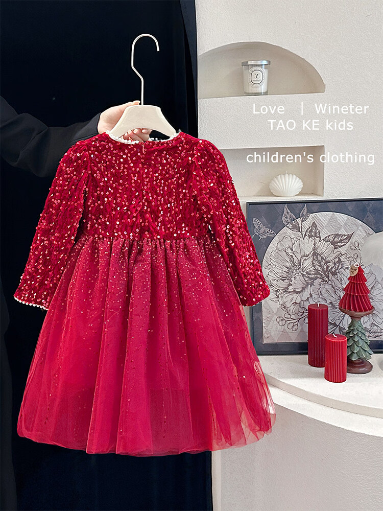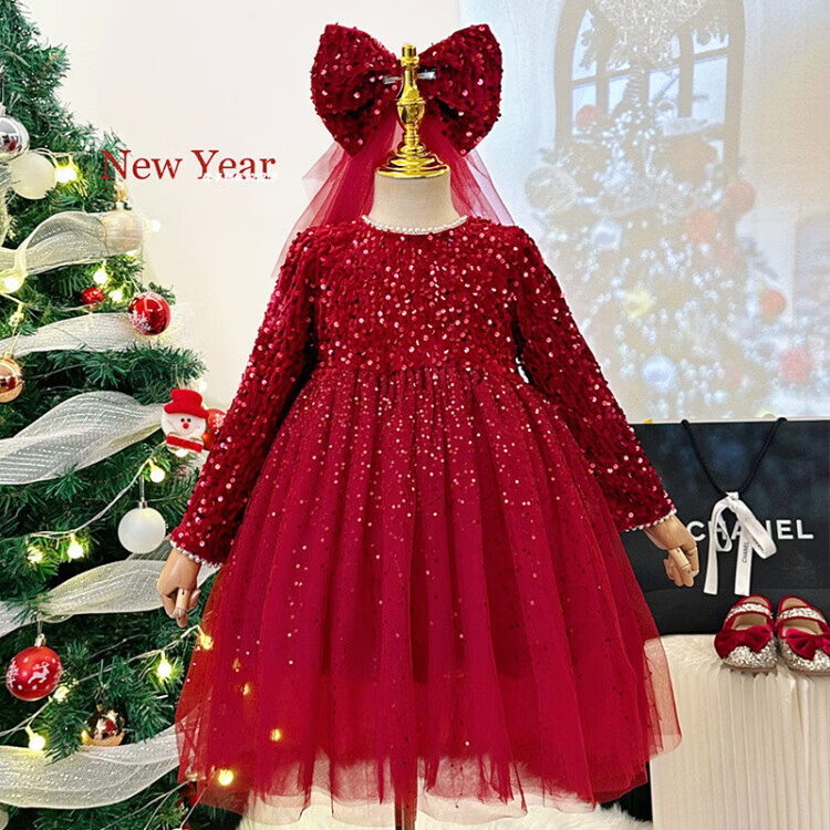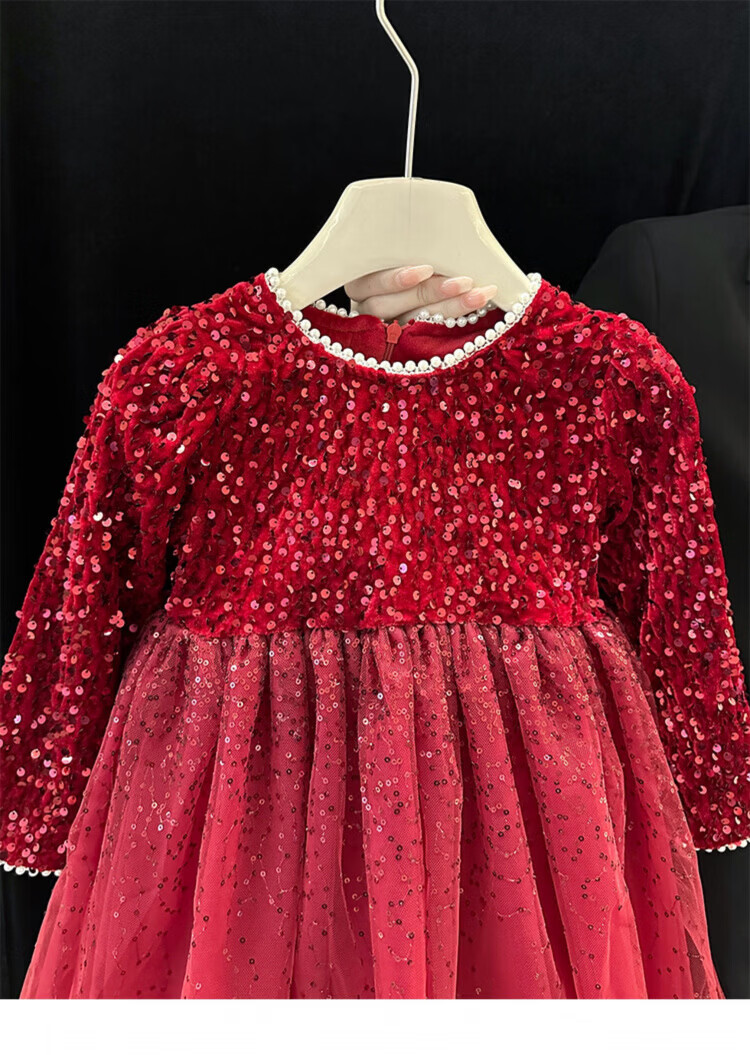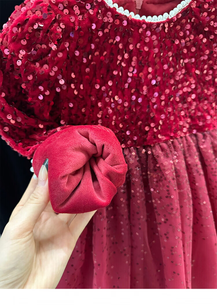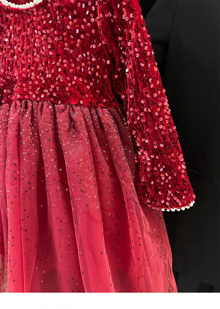 Disney Girls Dress Spring and Autumn Children's High-end Fashion Sequin Princess Dress Children's Red 20 Red Velvet Style Delivery Veil (one size smaller) 100 cm