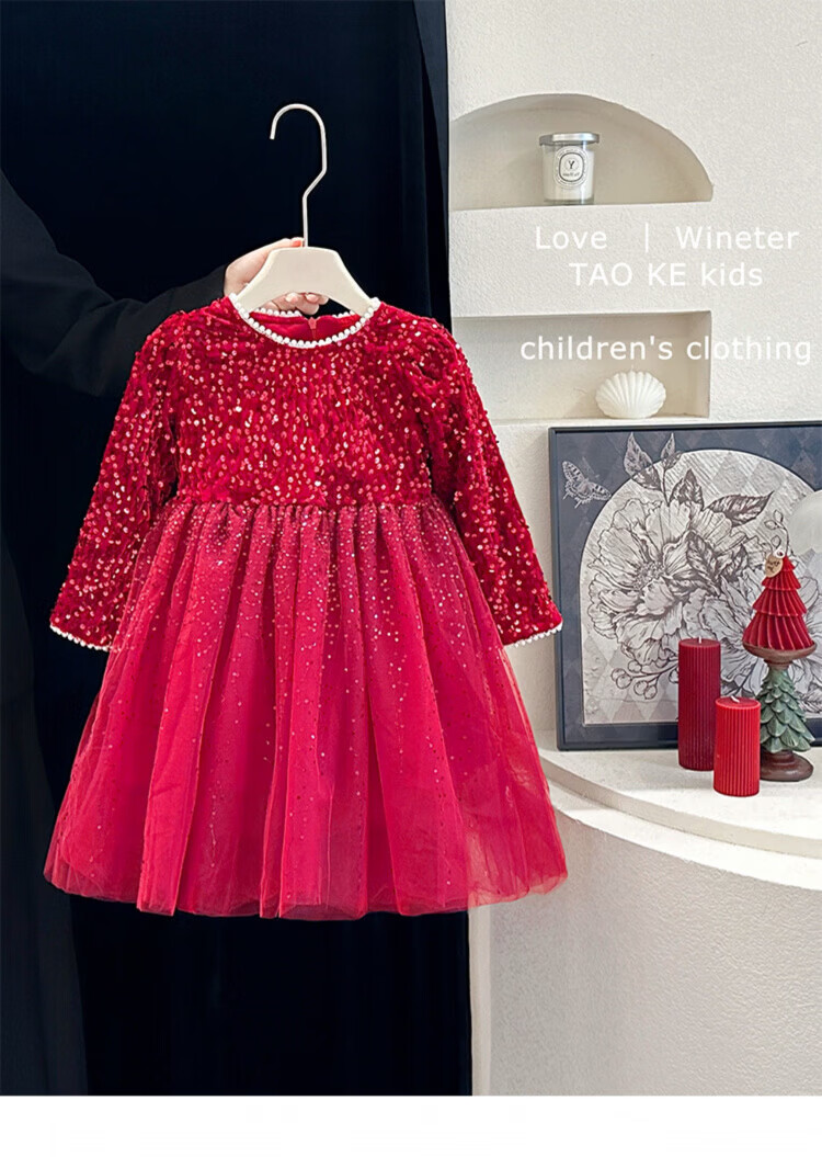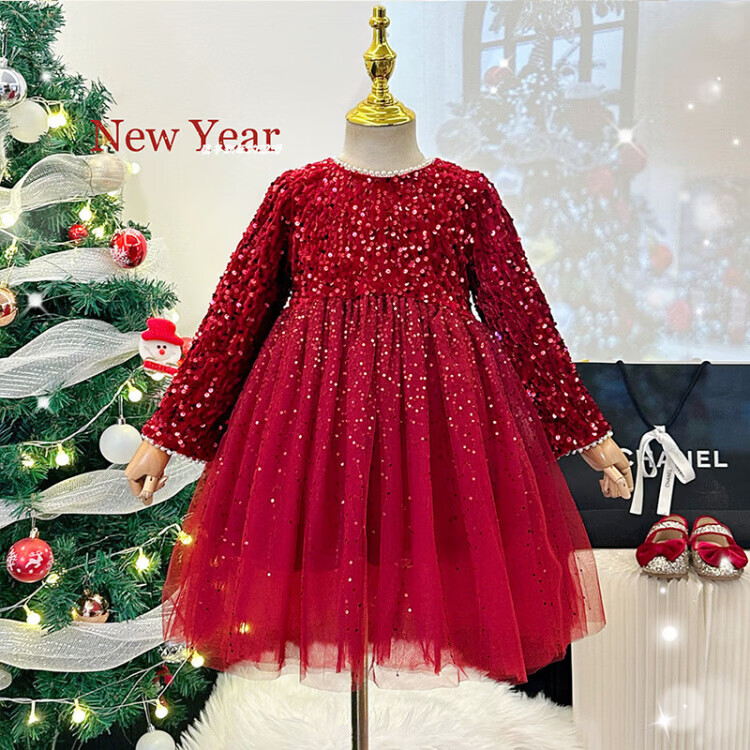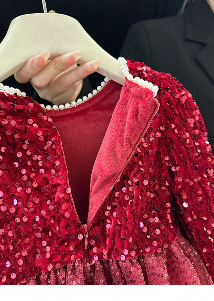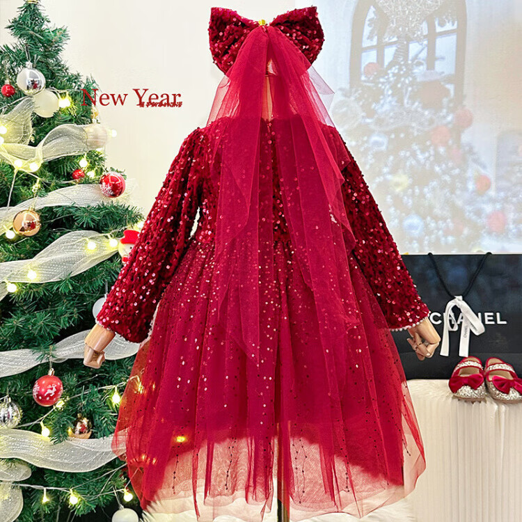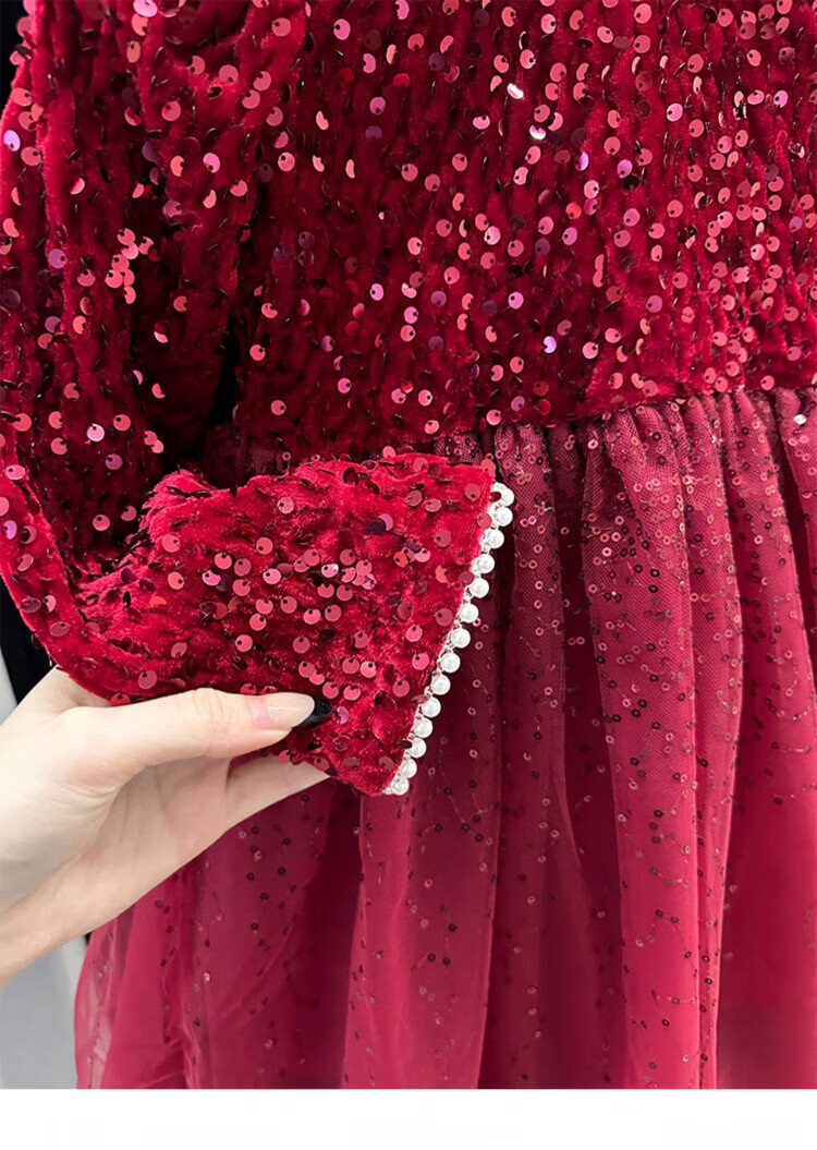 Disney Girls Dress Spring and Autumn Children's High-end Fashion Sequin Princess Dress Children's Red 20 Red Velvet Style Delivery Veil (one size smaller) 100 cm