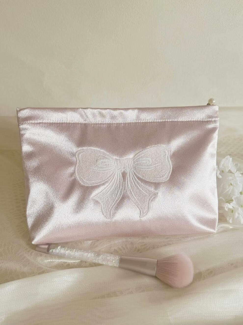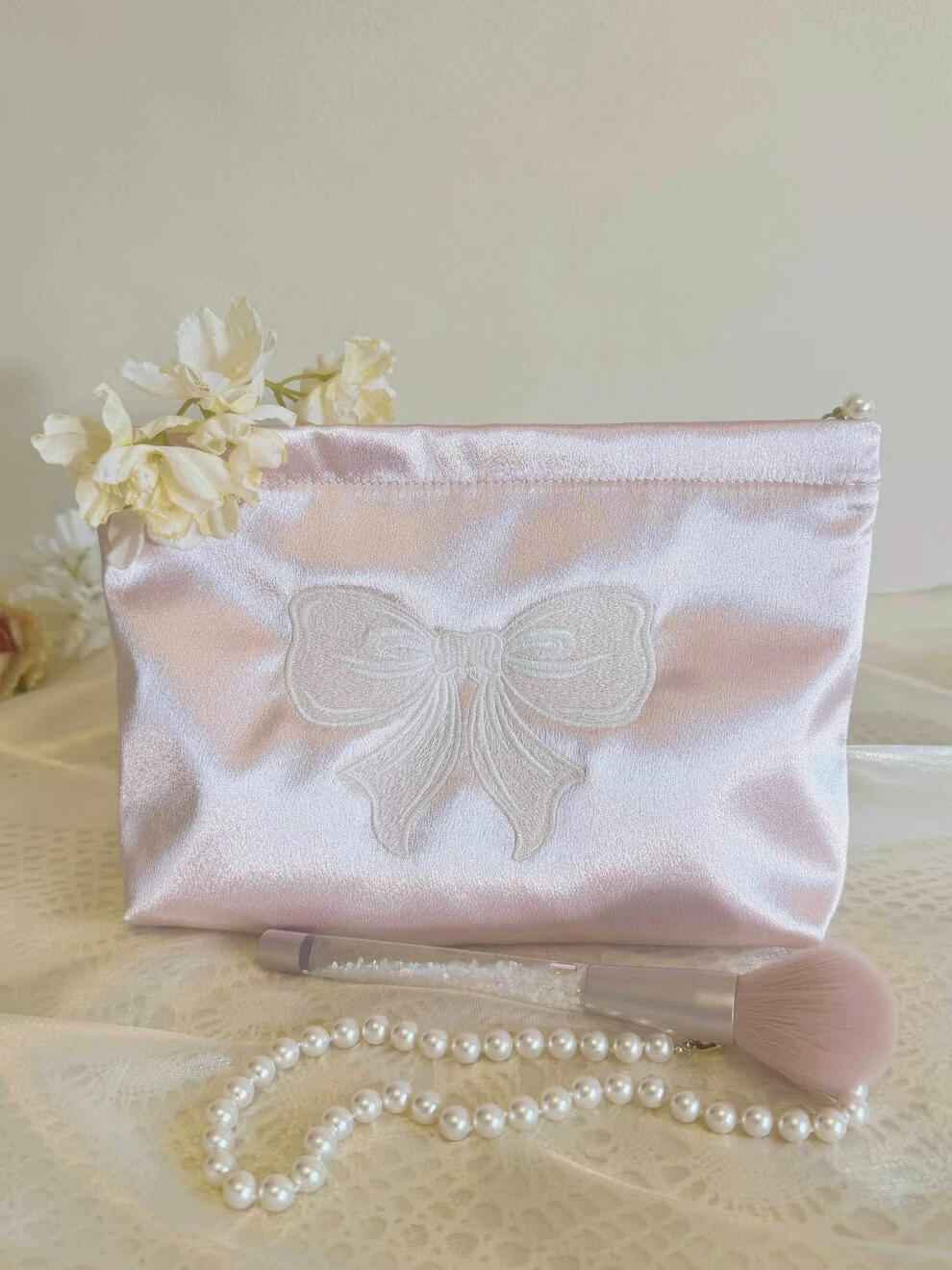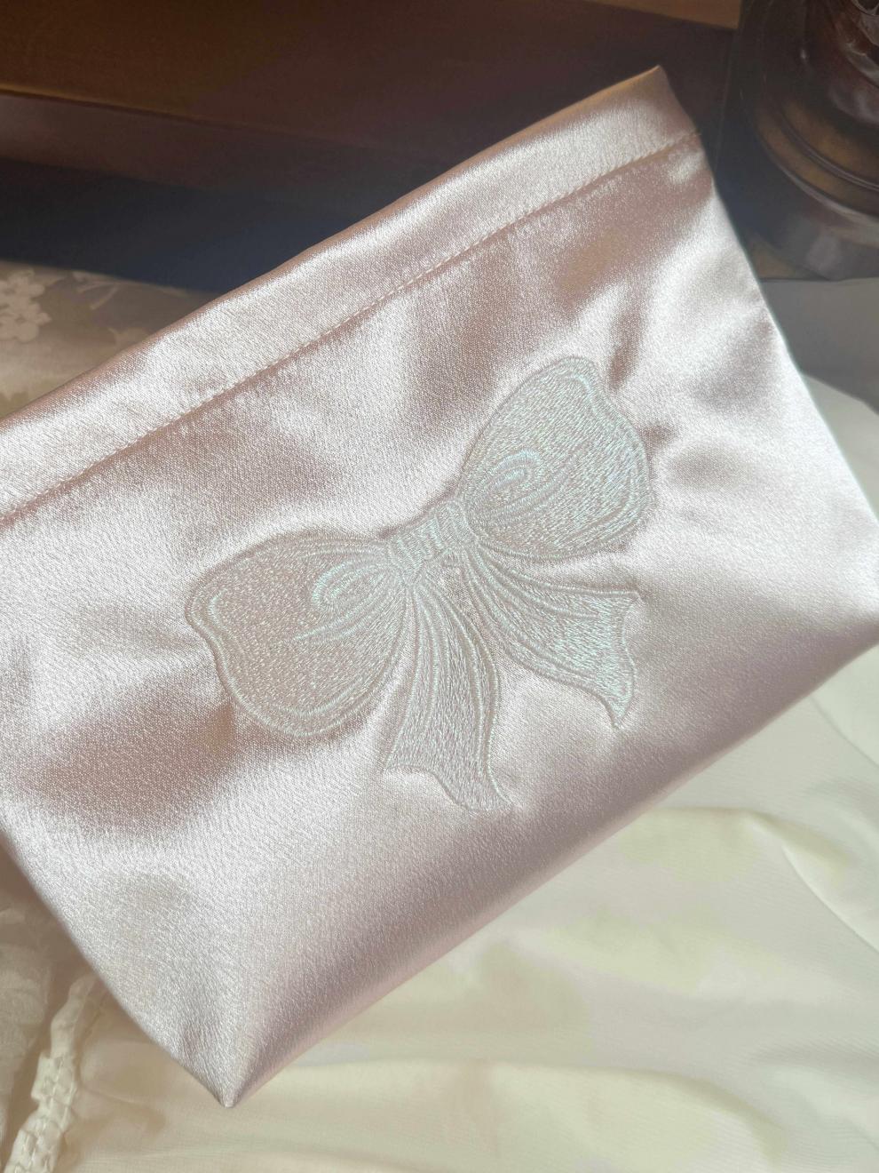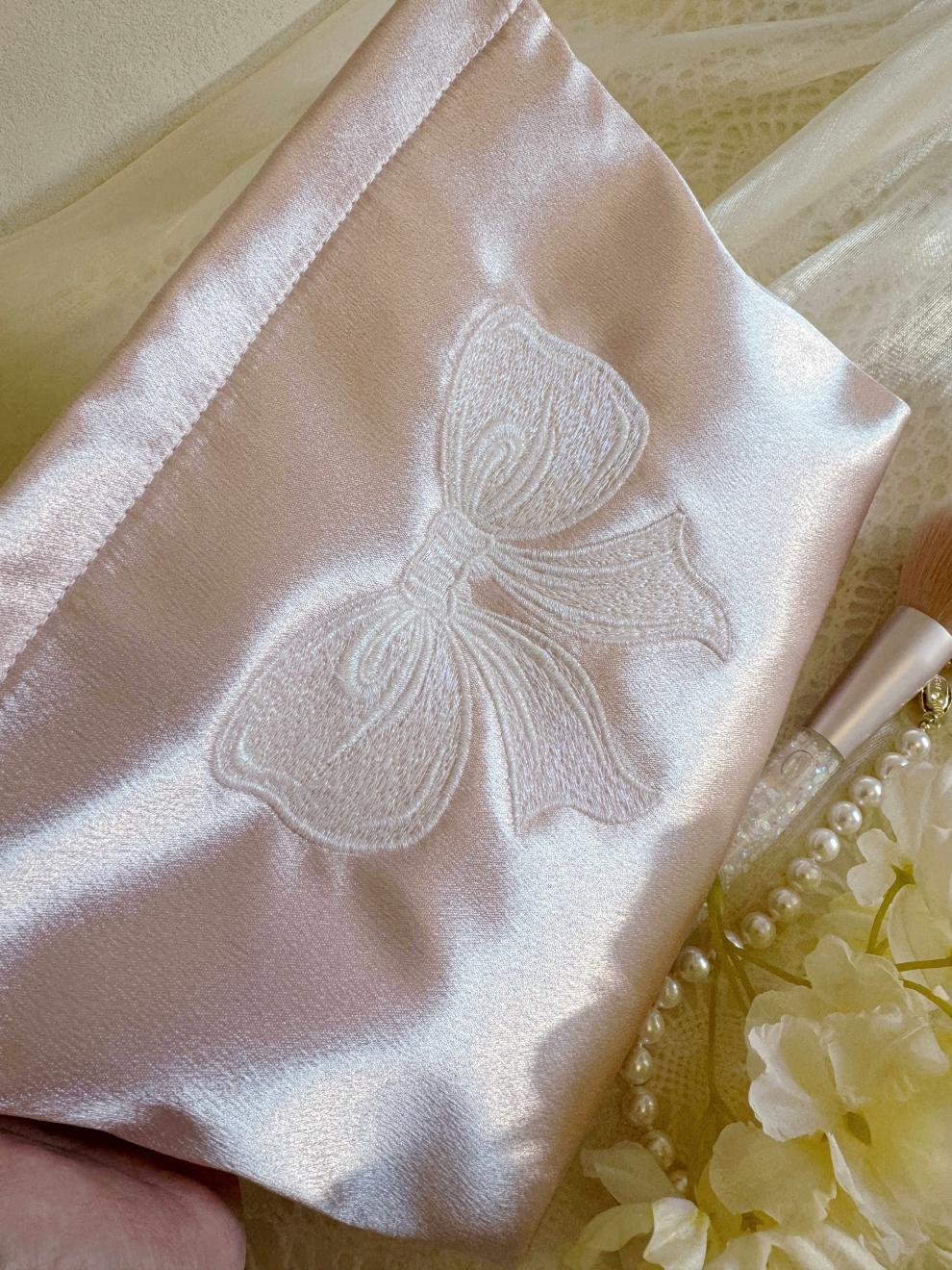 Shijanu ins small fresh embroidered bow cosmetic bag, portable and large-capacity liner bag storage bag embroidered bow glitter powder (medium size)