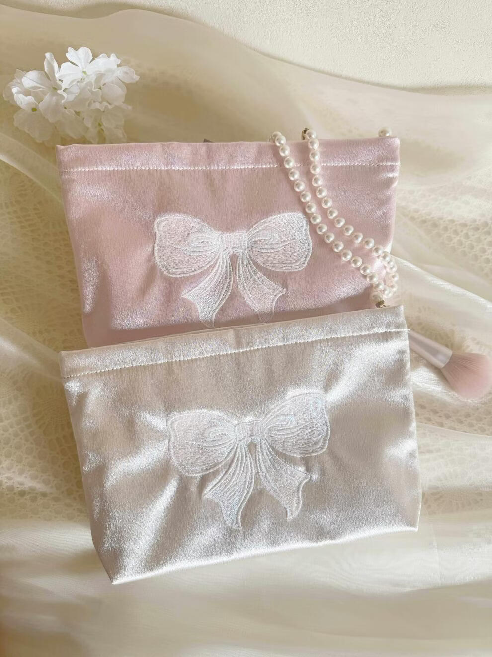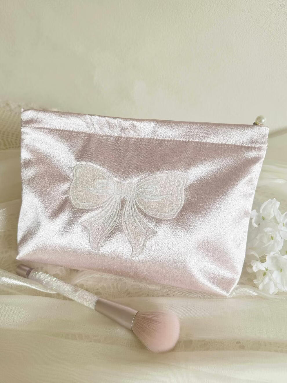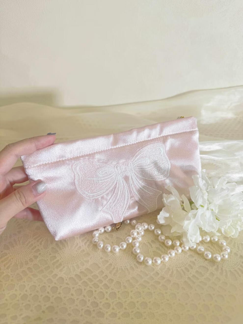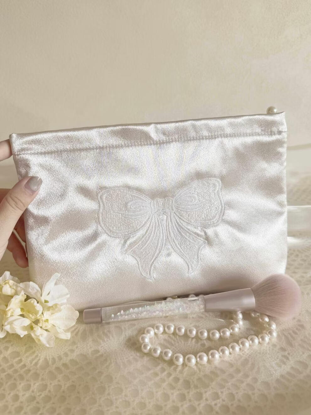 Shijanu ins small fresh embroidered bow cosmetic bag, portable and large-capacity liner bag storage bag embroidered bow glitter powder (medium size)
