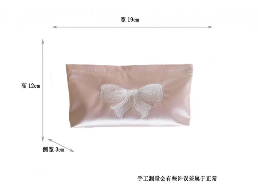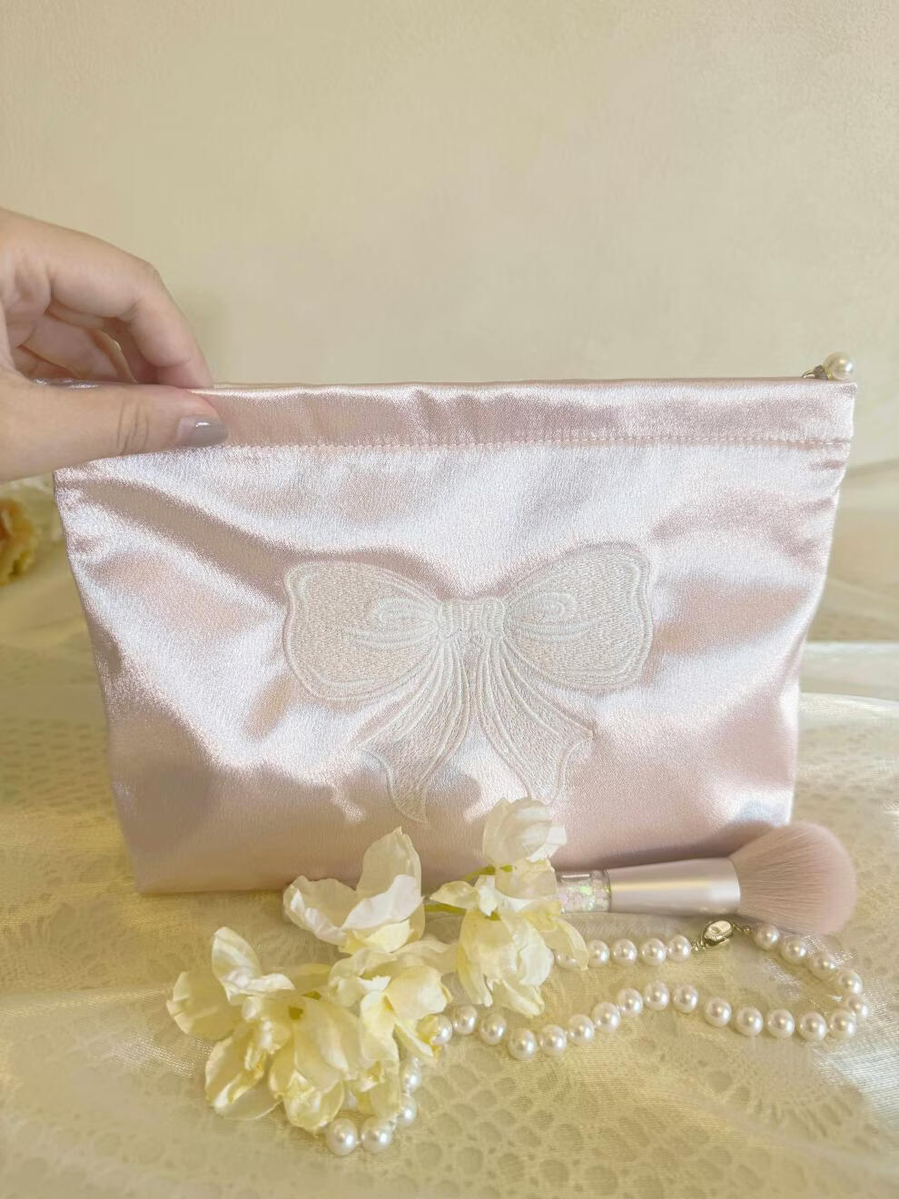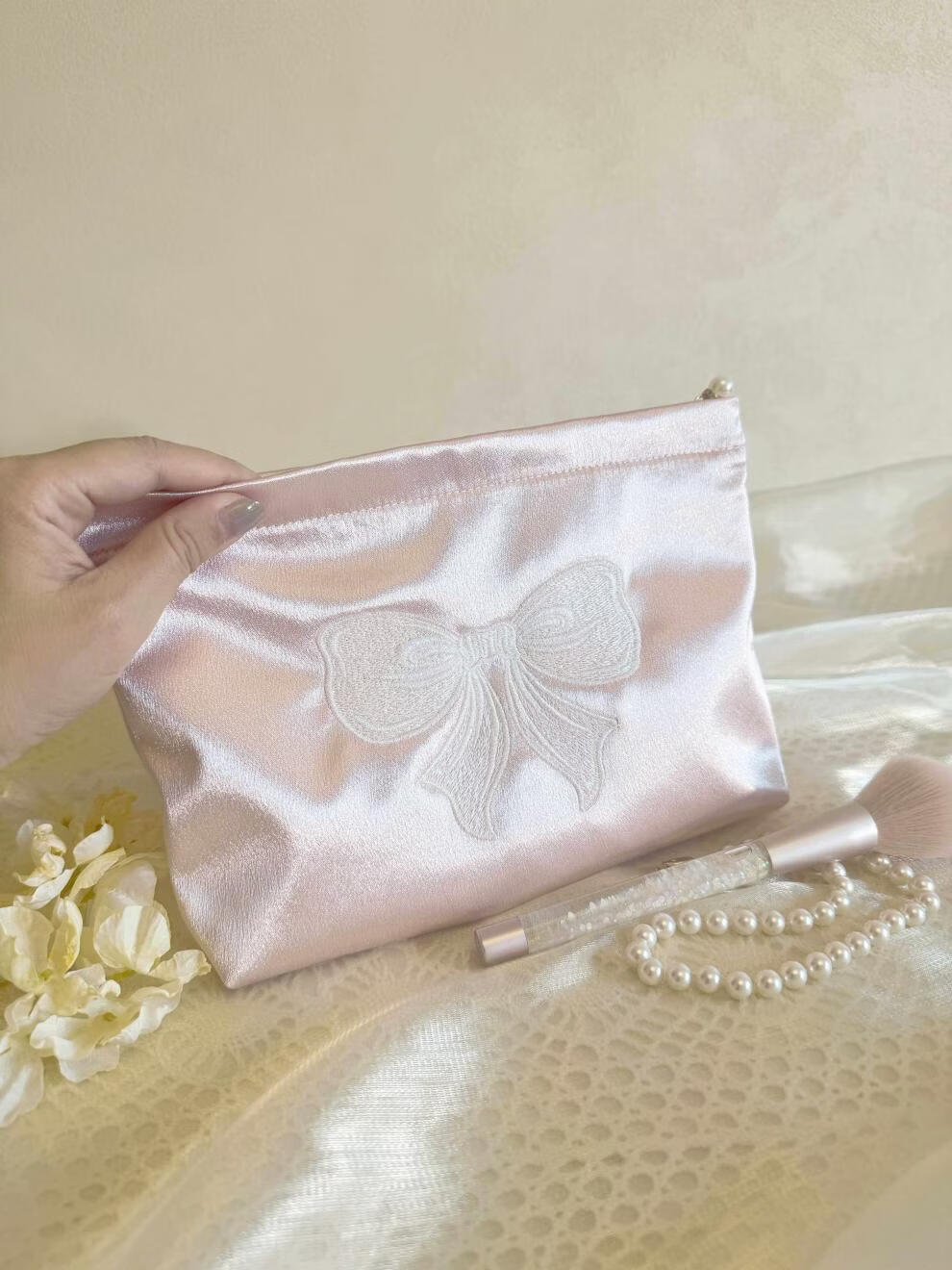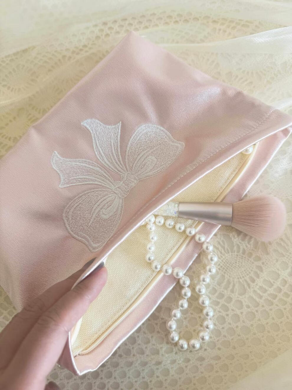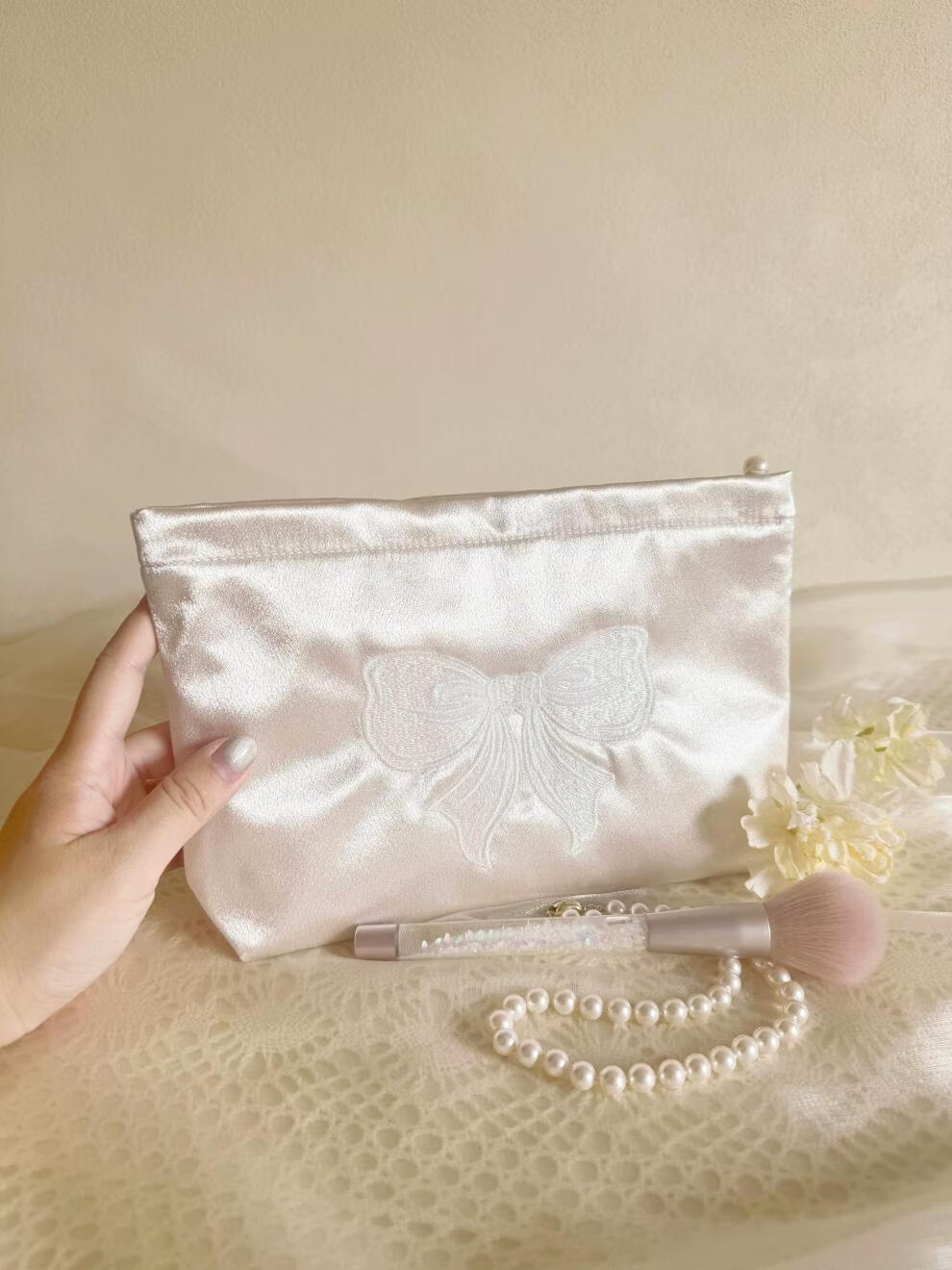 Shijanu ins small fresh embroidered bow cosmetic bag, portable and large-capacity liner bag storage bag embroidered bow glitter powder (medium size)