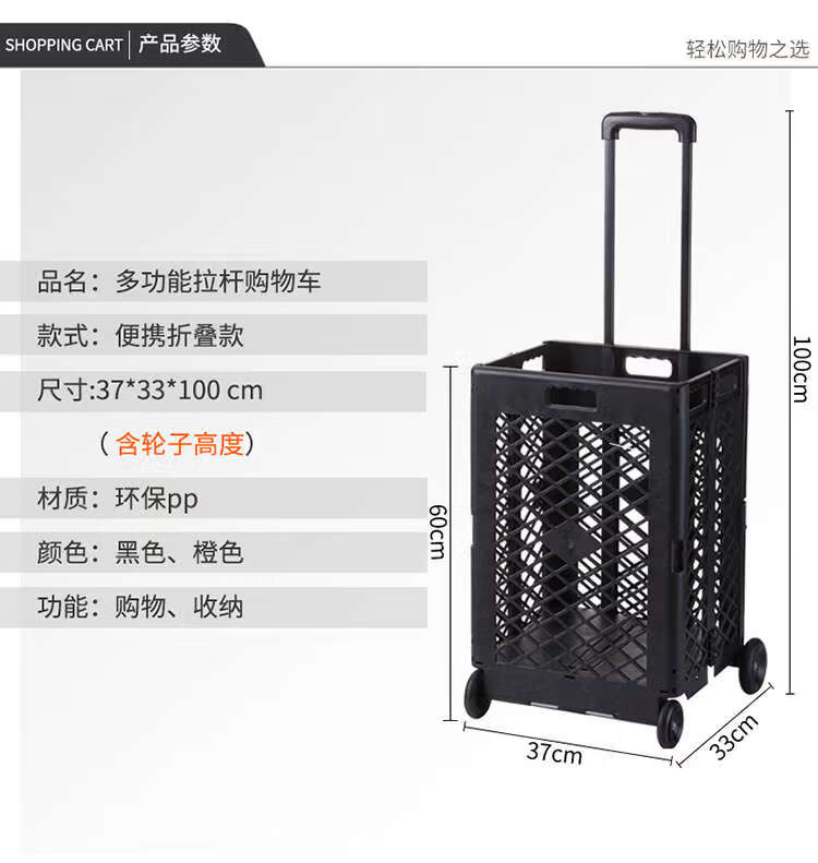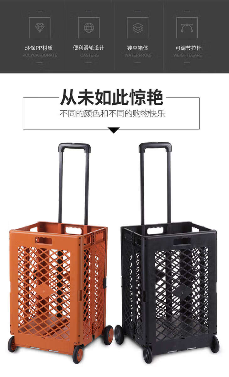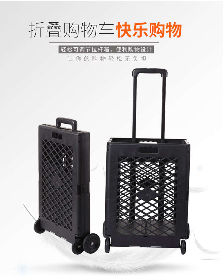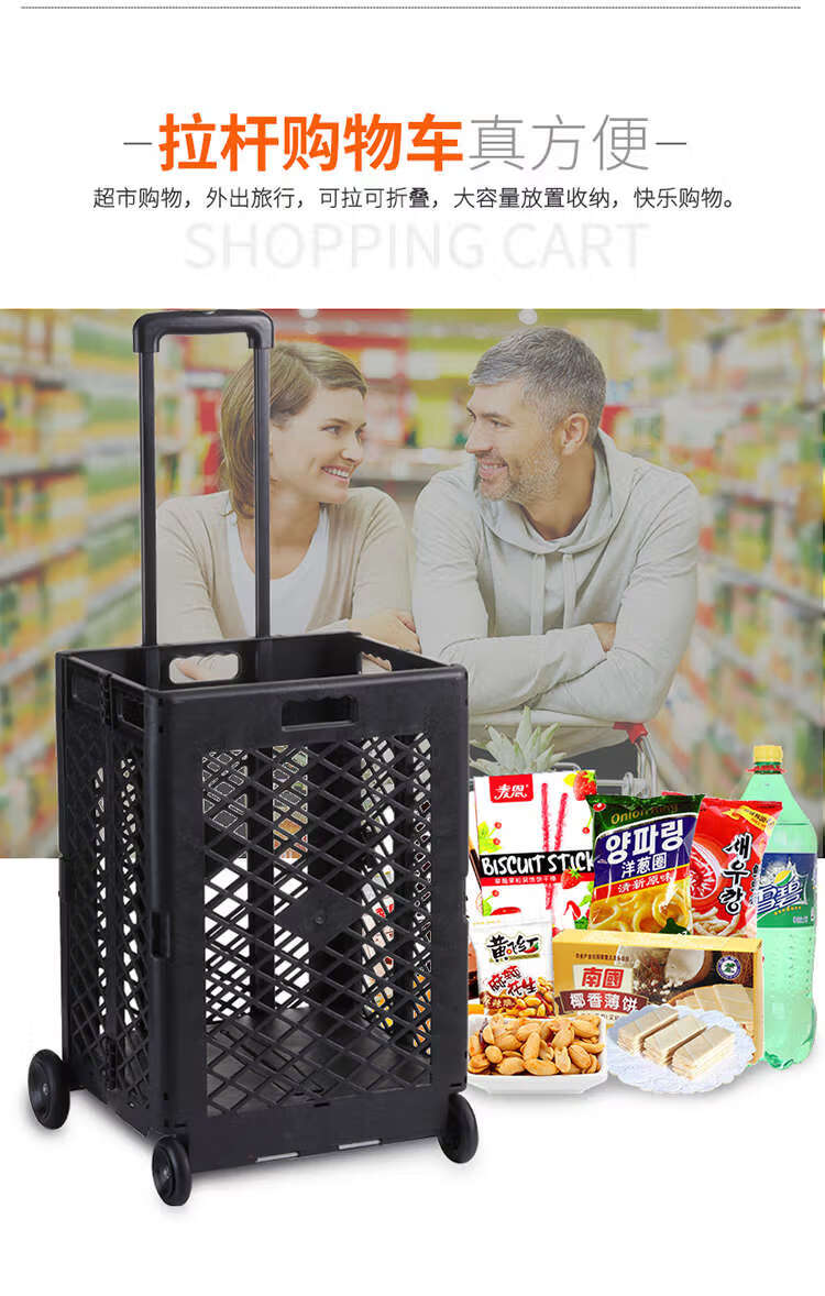 Wing Fantasy hand-pulled shopping cart that can easily climb stairs and is designed with a trolley for outings. Grid style. Black four wheels.
