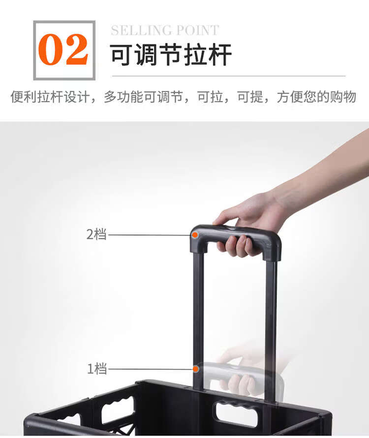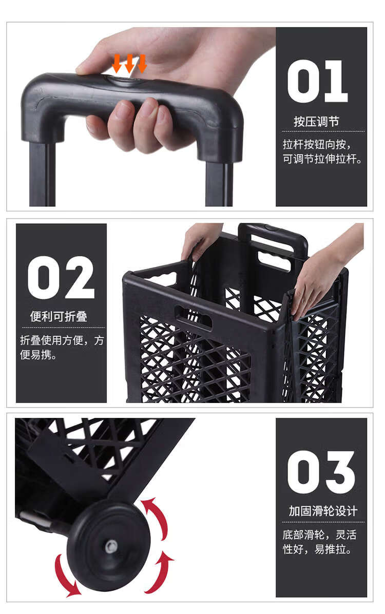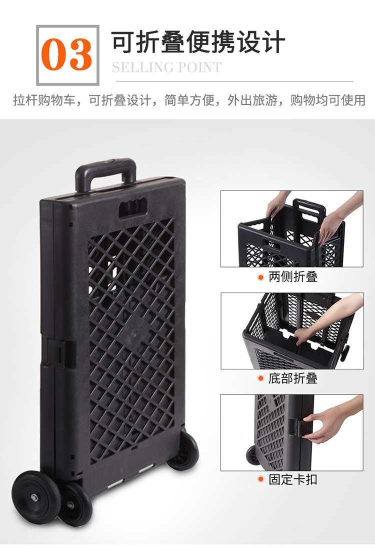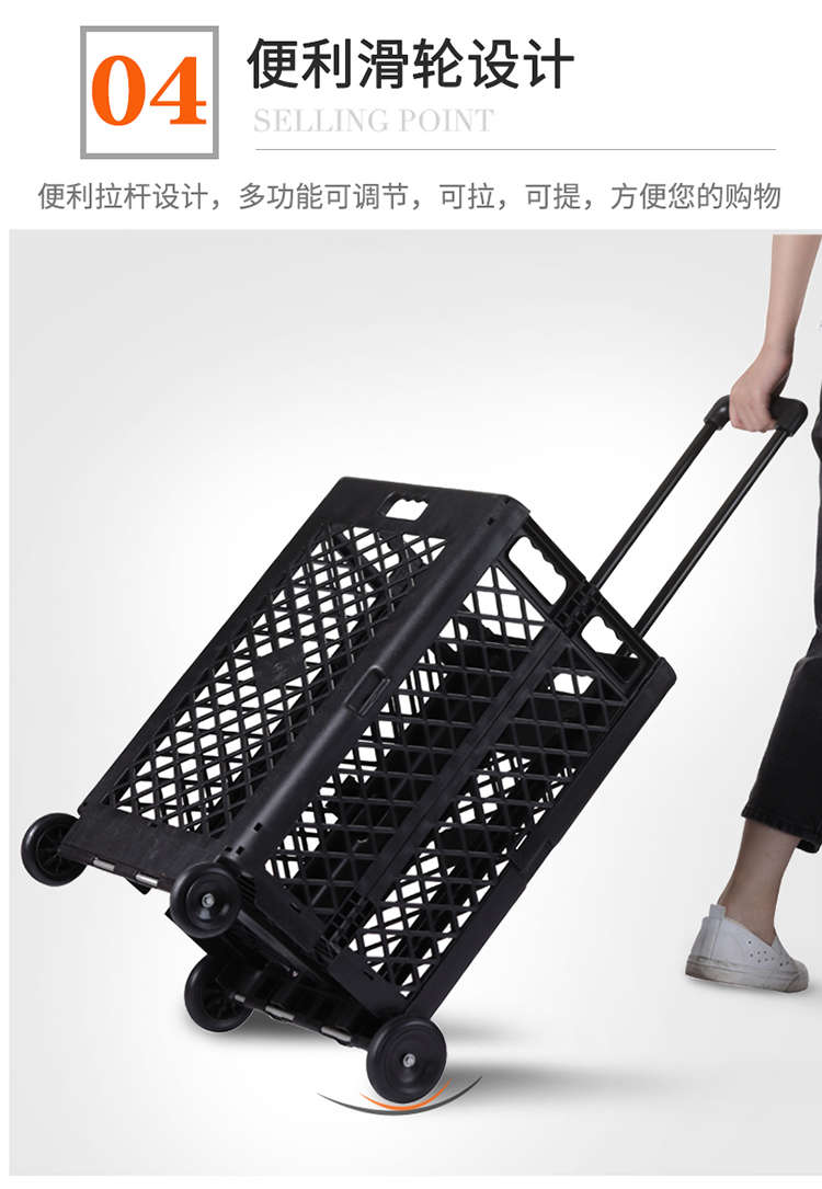 Wing Fantasy hand-pulled shopping cart that can easily climb stairs and is designed with a trolley for outings. Grid style. Black four wheels.
