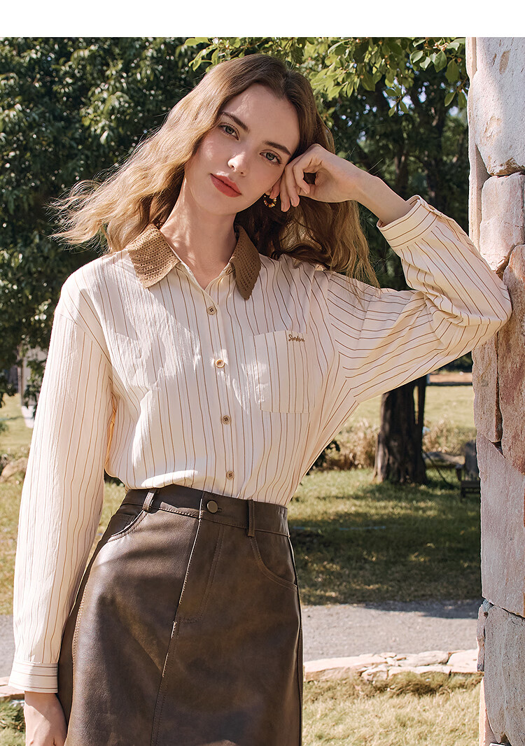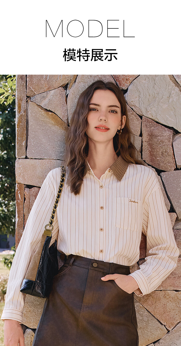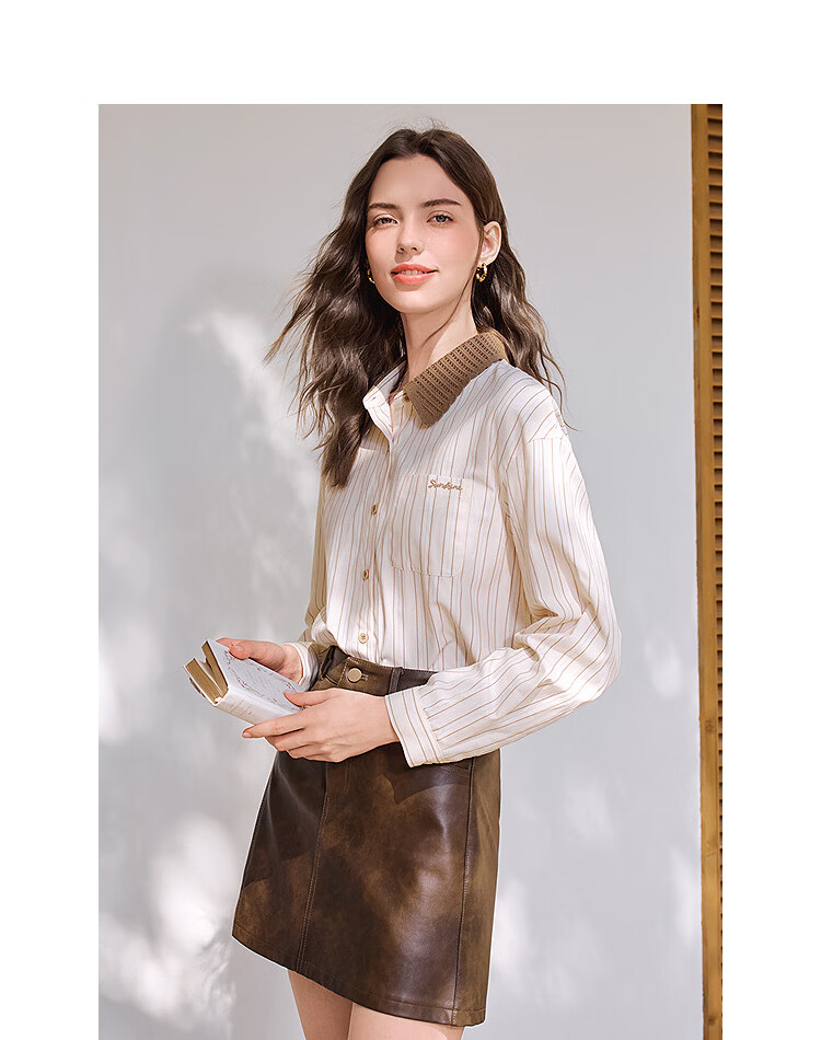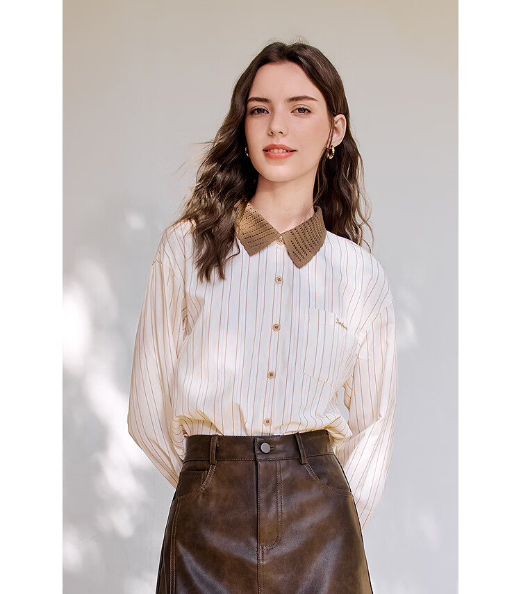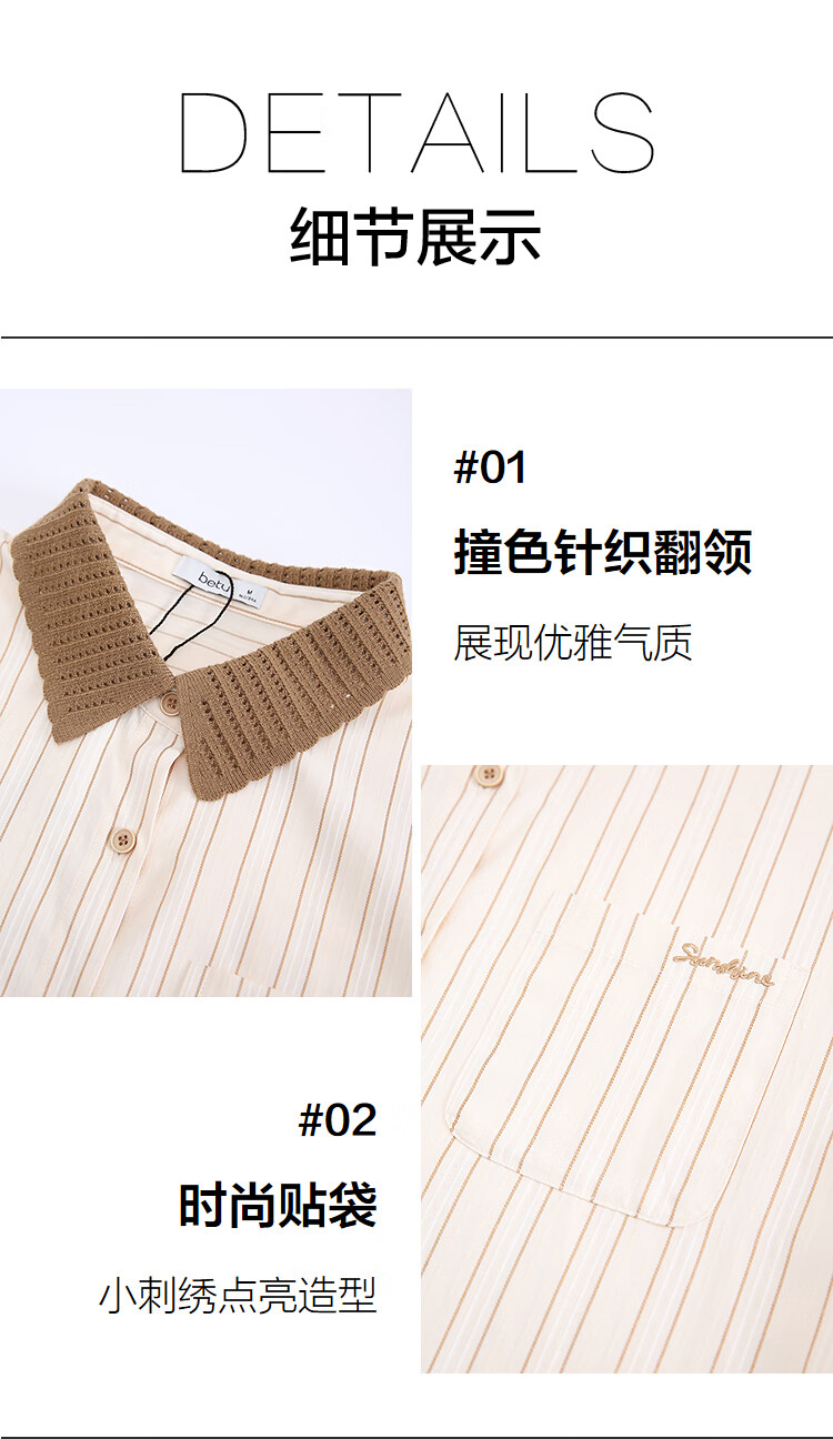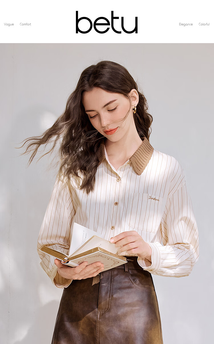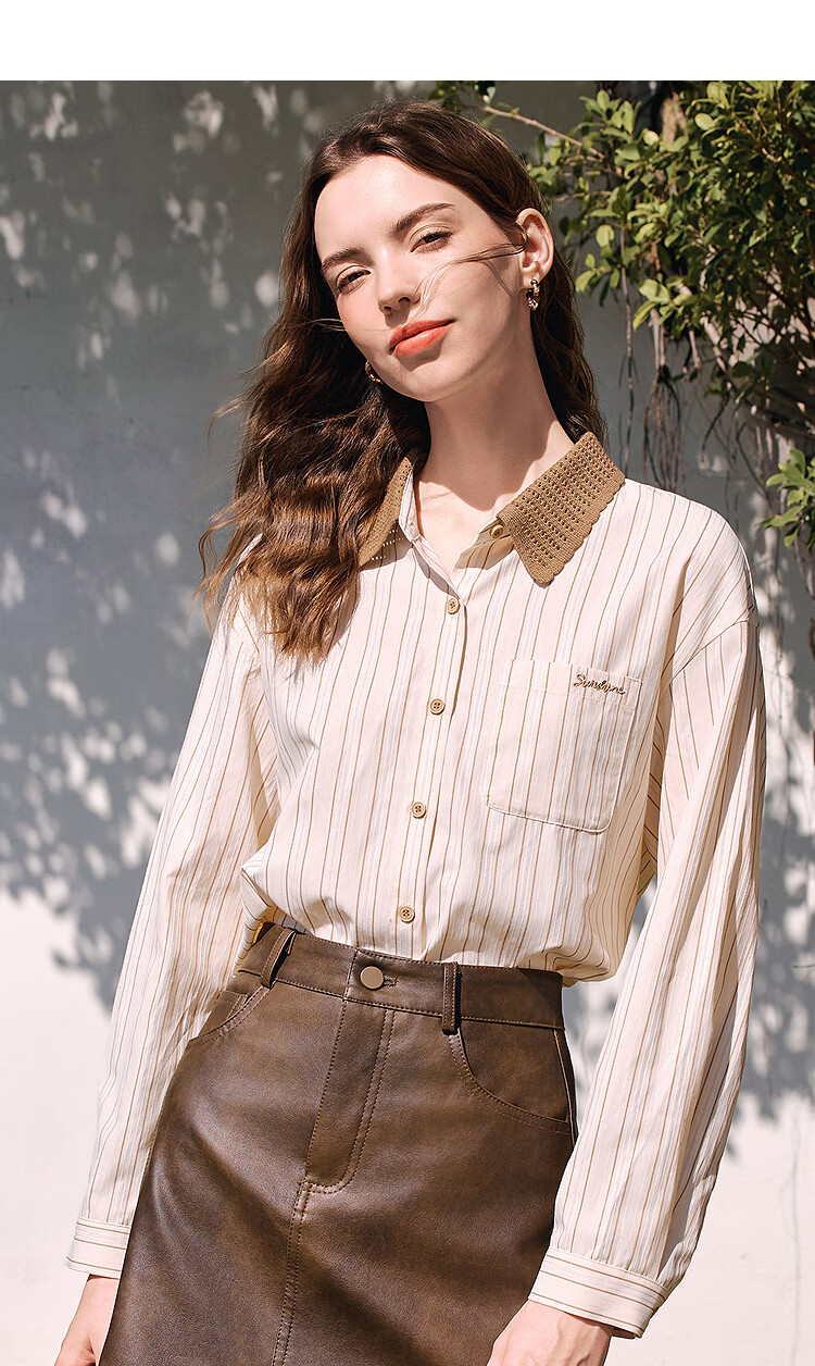 Betu women's 2026 spring new shirt contrasting color knitted collar textured striped high-end top for women 2601T23 apricot S