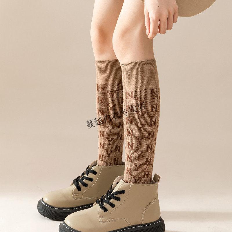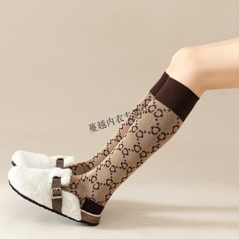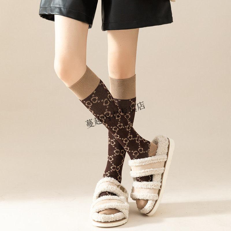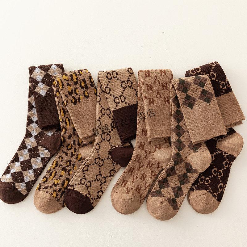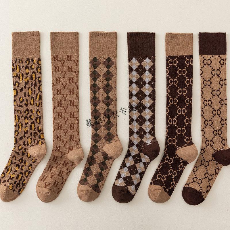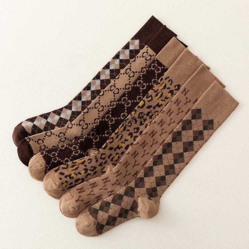 Modal French fashion brand C letter calf socks for women double needle autumn and winter retro long tube Maillard brown long socks cotton 812C letter khaki 2 pairs one size Maillard color calf socks 36-40 yards