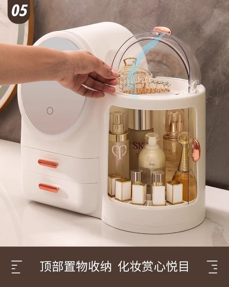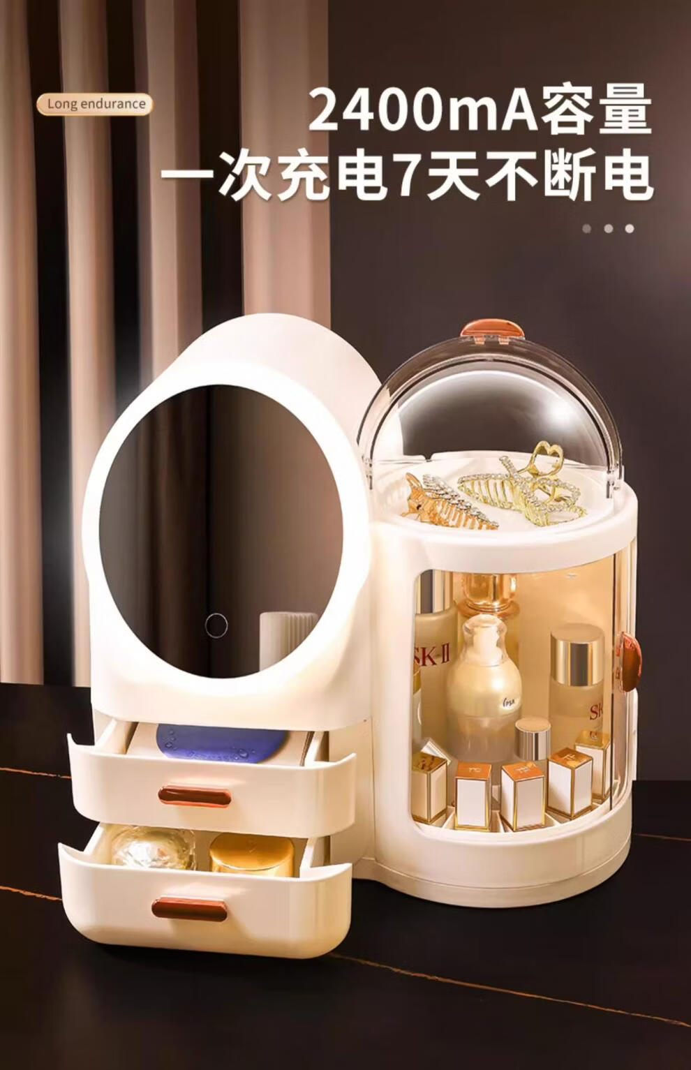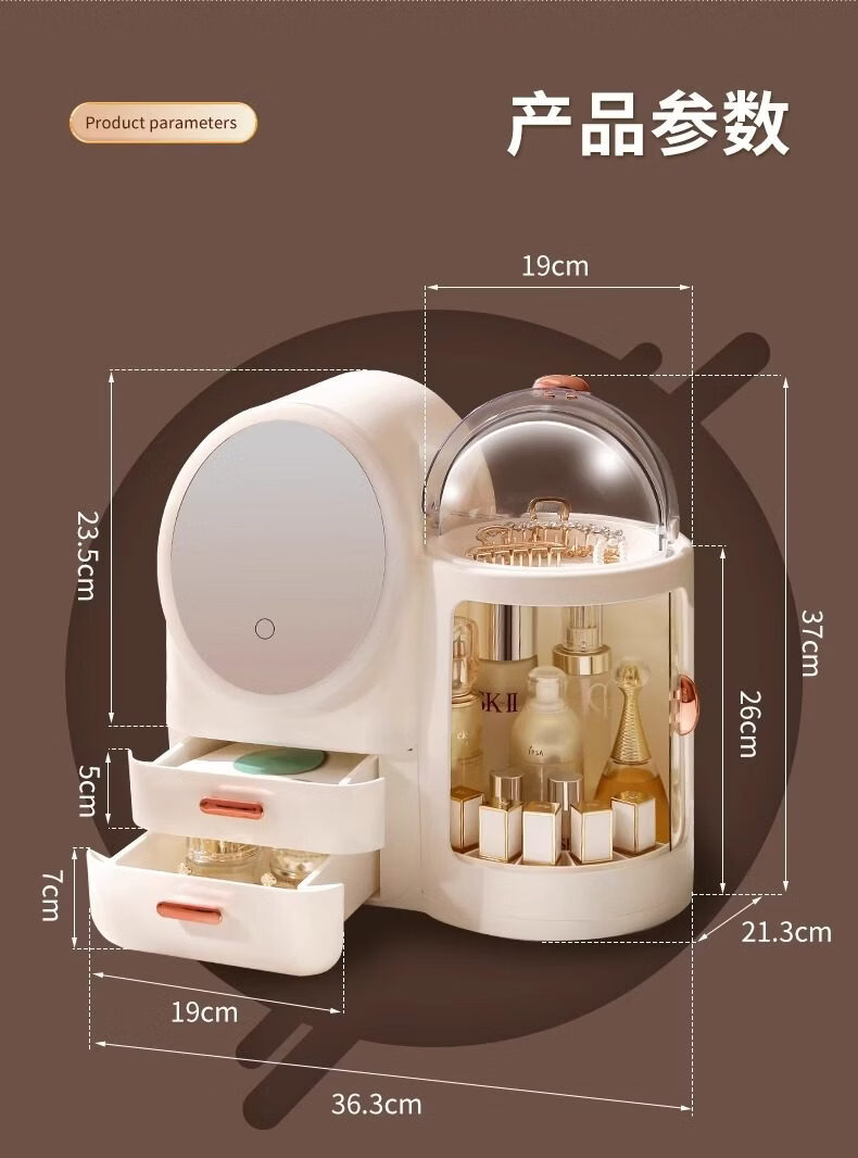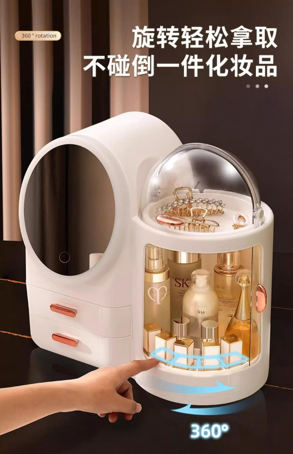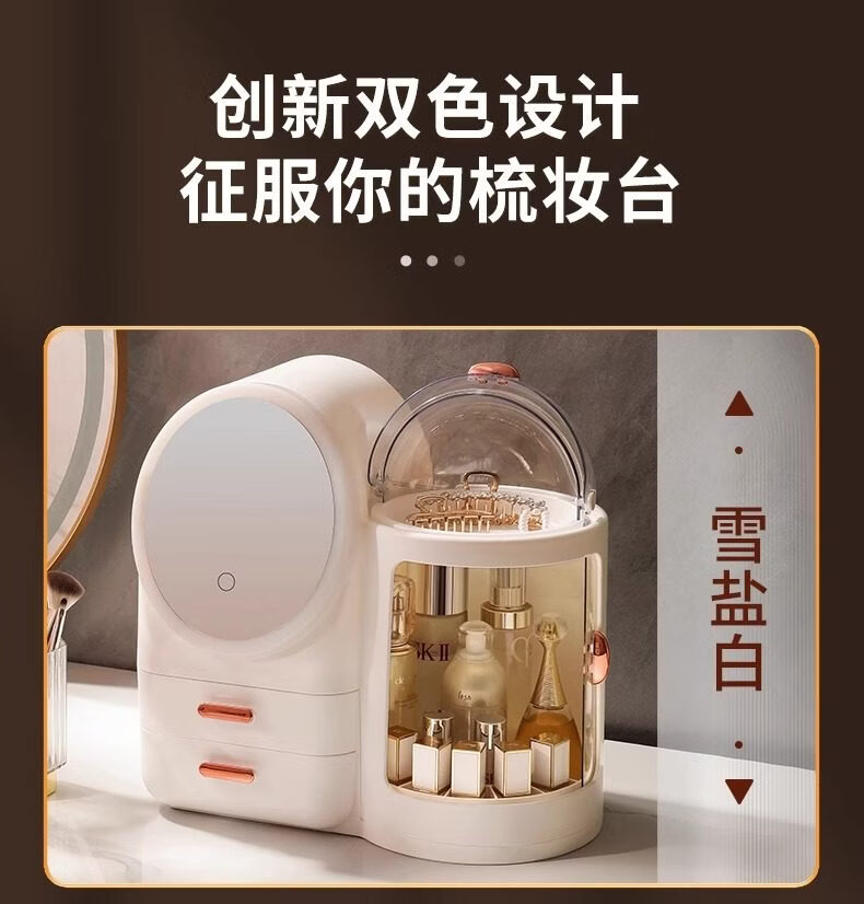 Meishute cosmetics storage box with mirror, dust-proof large capacity box, rotatable desktop with light, integrated skin care product storage rack, sea salt white, LED three-color fill light adjustment