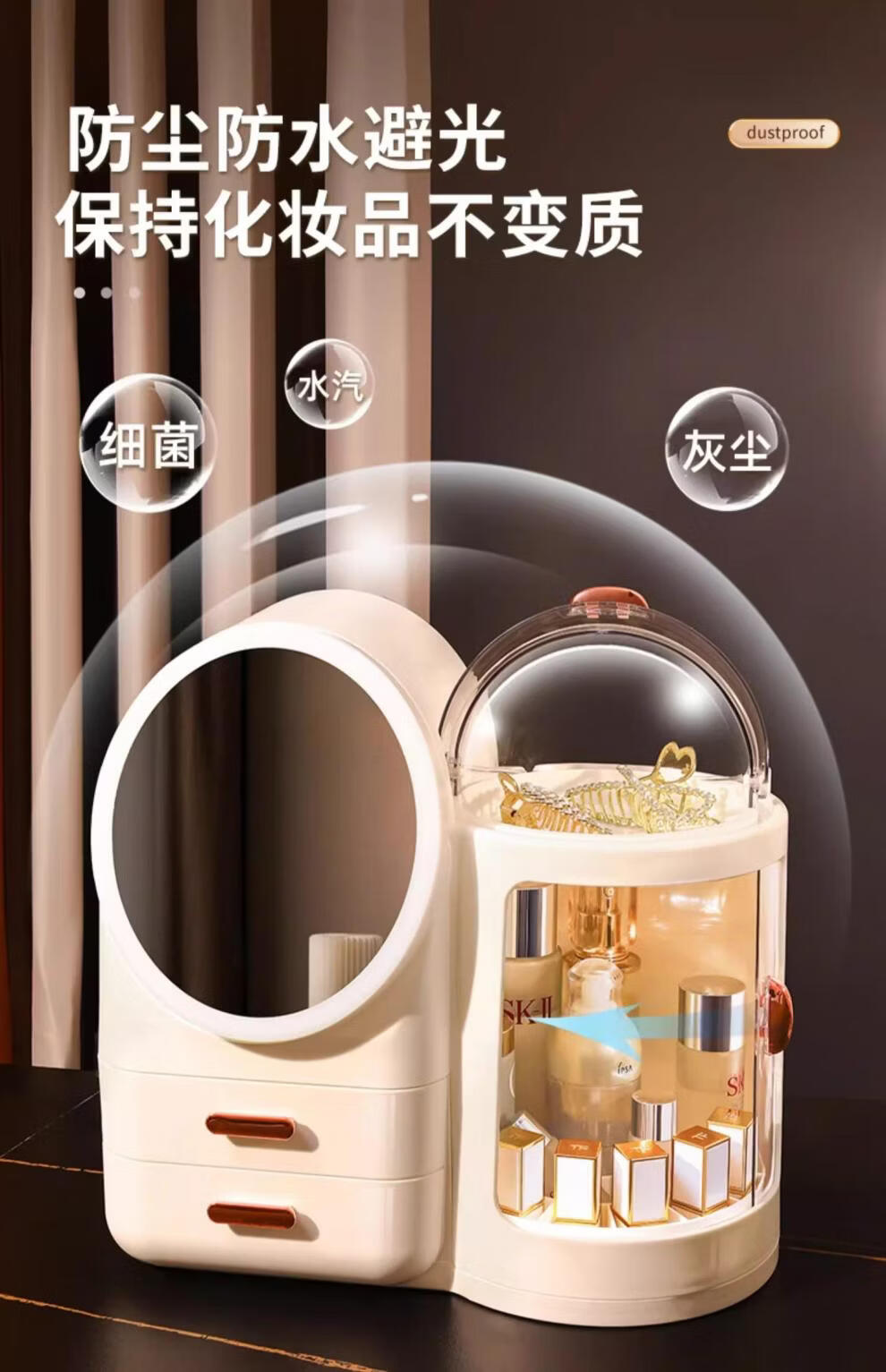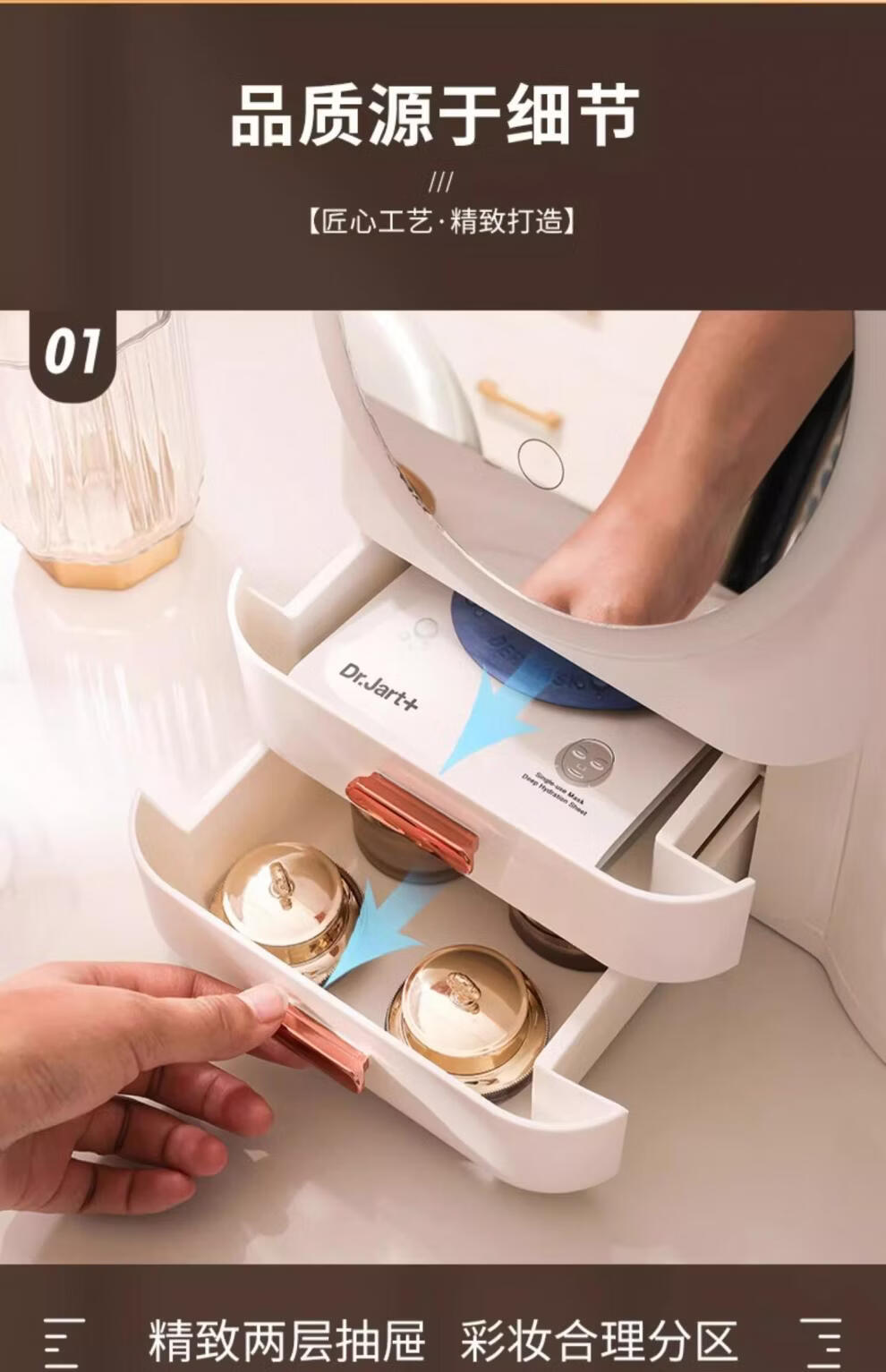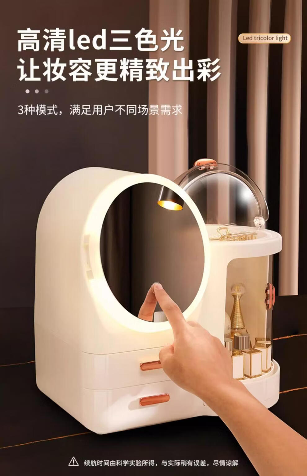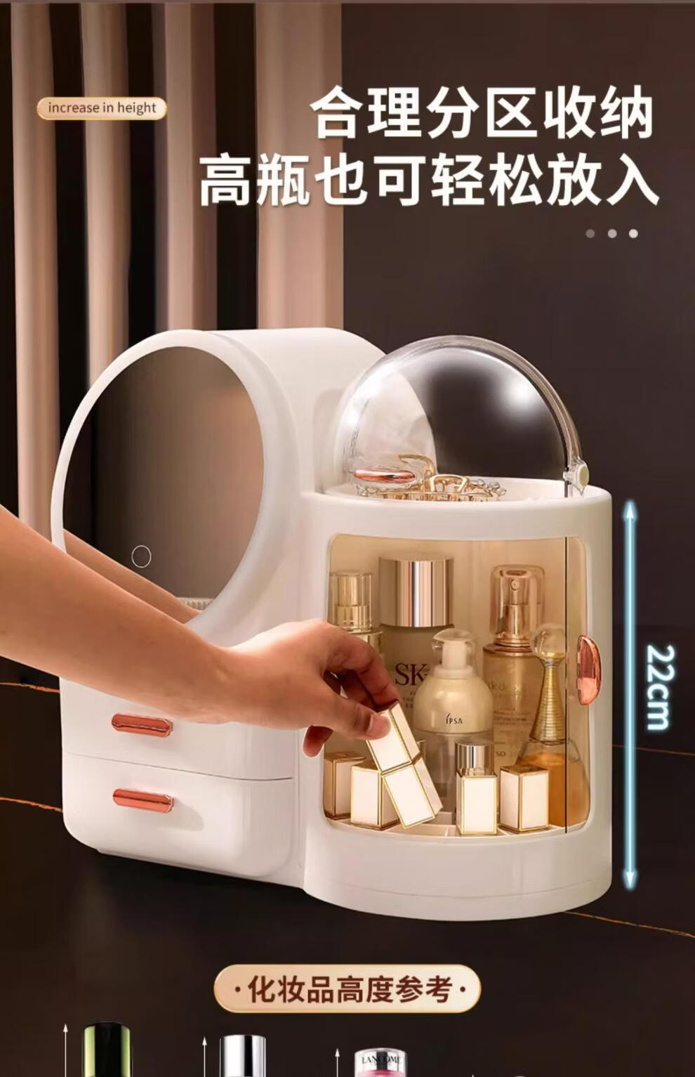 Meishute cosmetics storage box with mirror, dust-proof large capacity box, rotatable desktop with light, integrated skin care product storage rack, sea salt white, LED three-color fill light adjustment