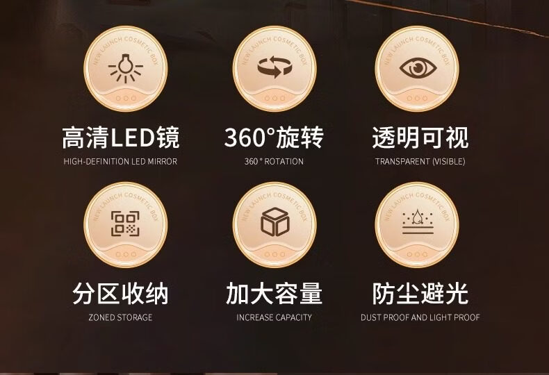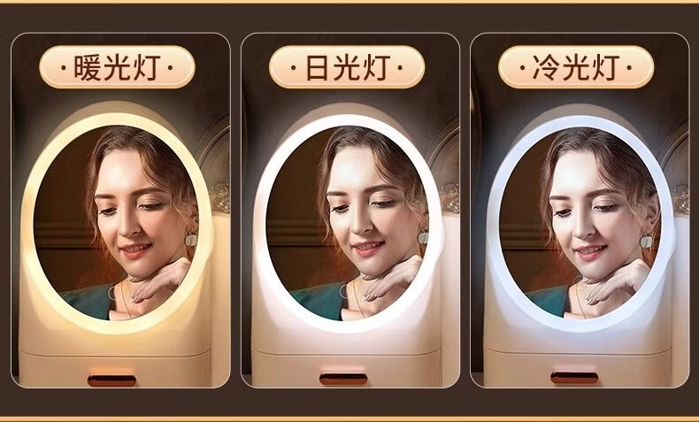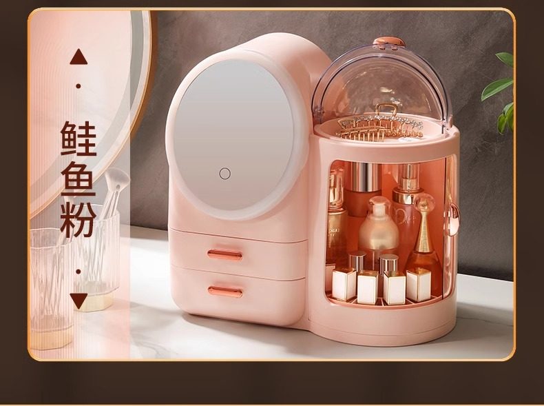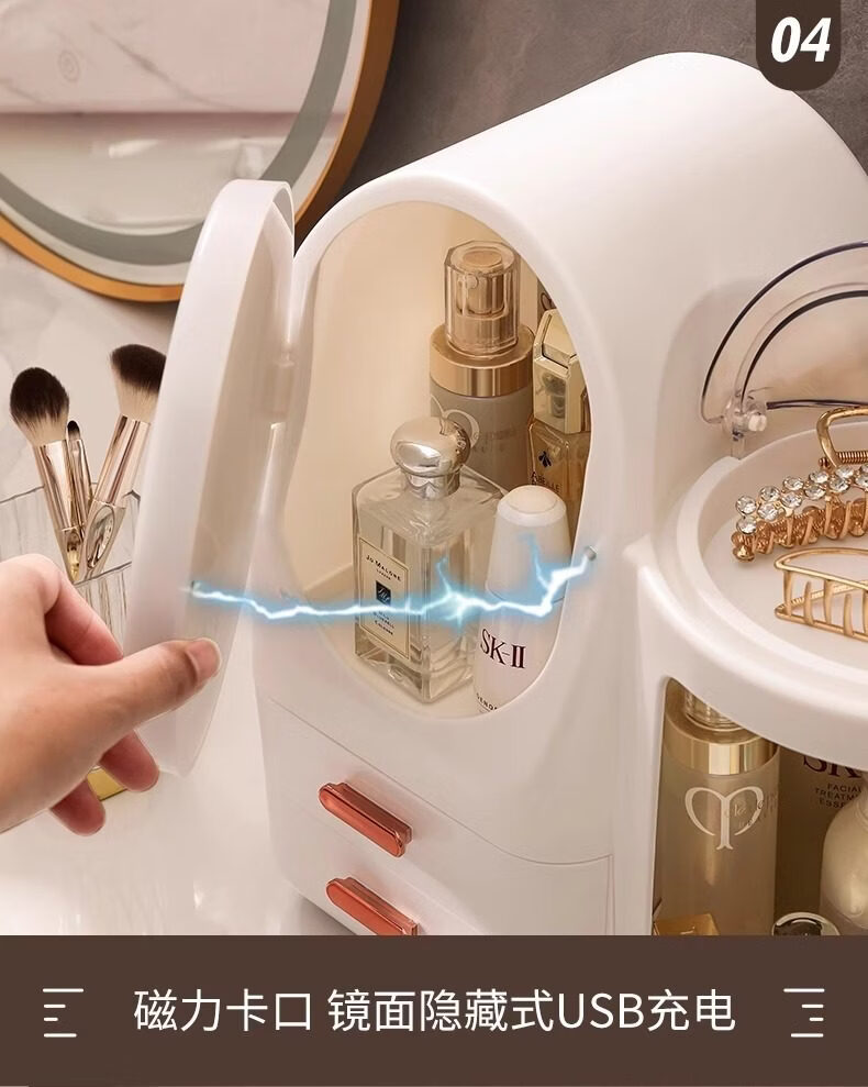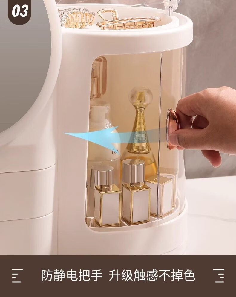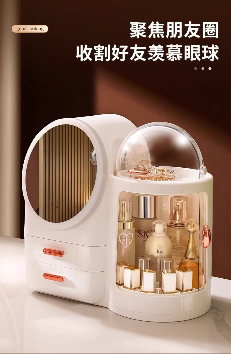 Meishute cosmetics storage box with mirror, dust-proof large capacity box, rotatable desktop with light, integrated skin care product storage rack, sea salt white, LED three-color fill light adjustment